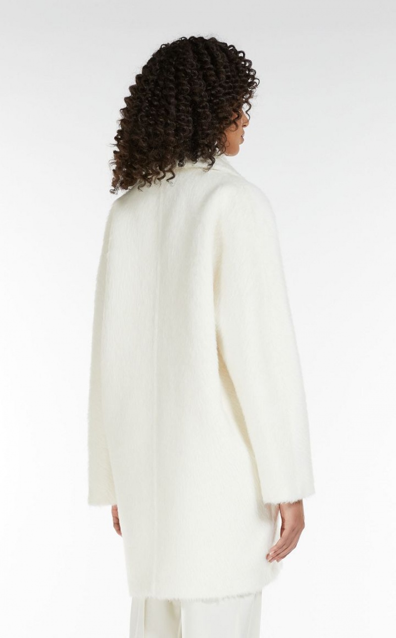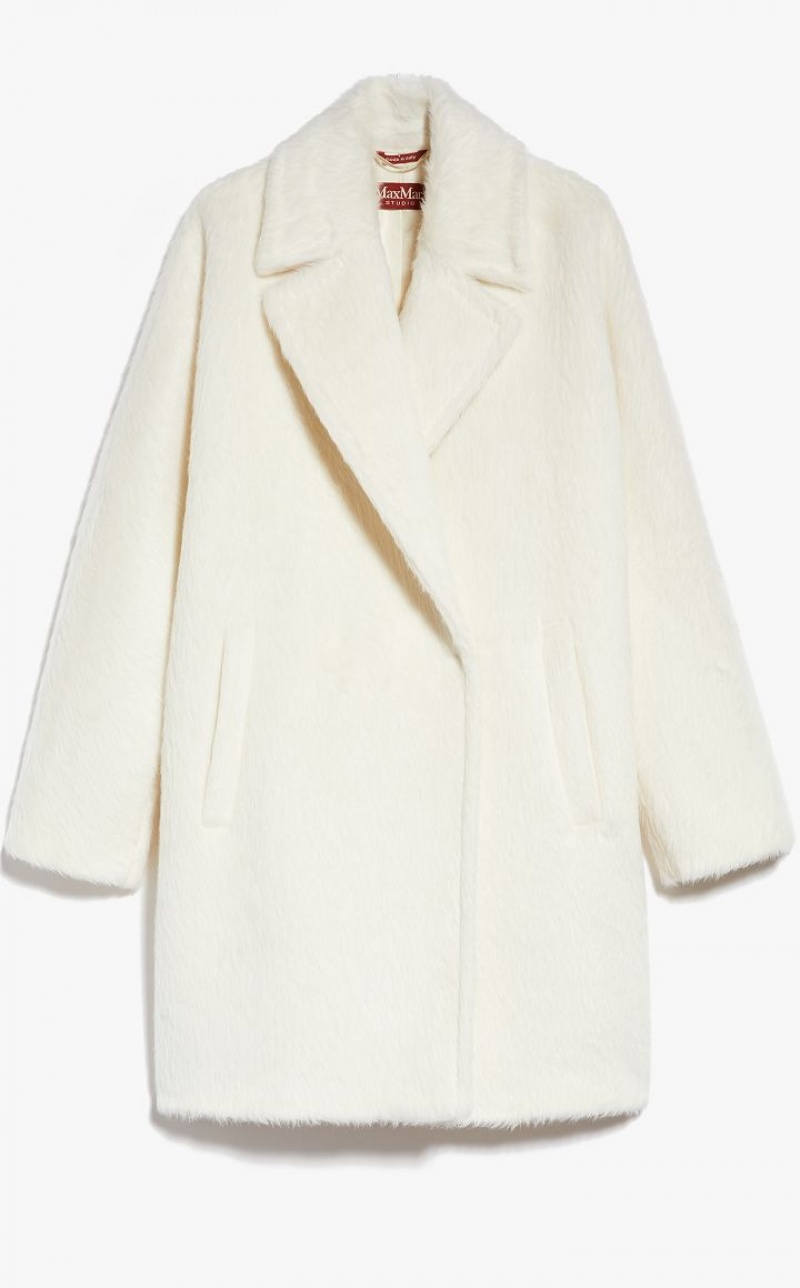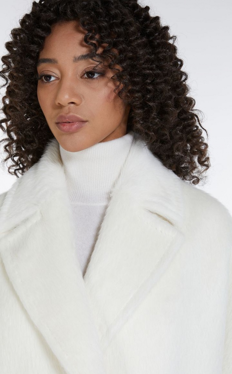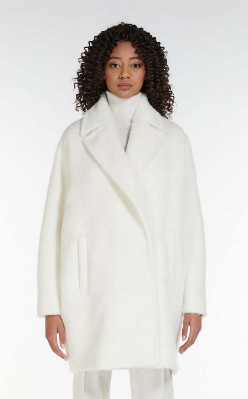 Double-breasted coat in a premium fabric made from alpaca and wool featuring a soft texture and a slightly egg-shaped line. The style features a large lapel collar, kimono sleeves and roomy welt pockets. Concealed two-button fastening. Length: 90 cm.
