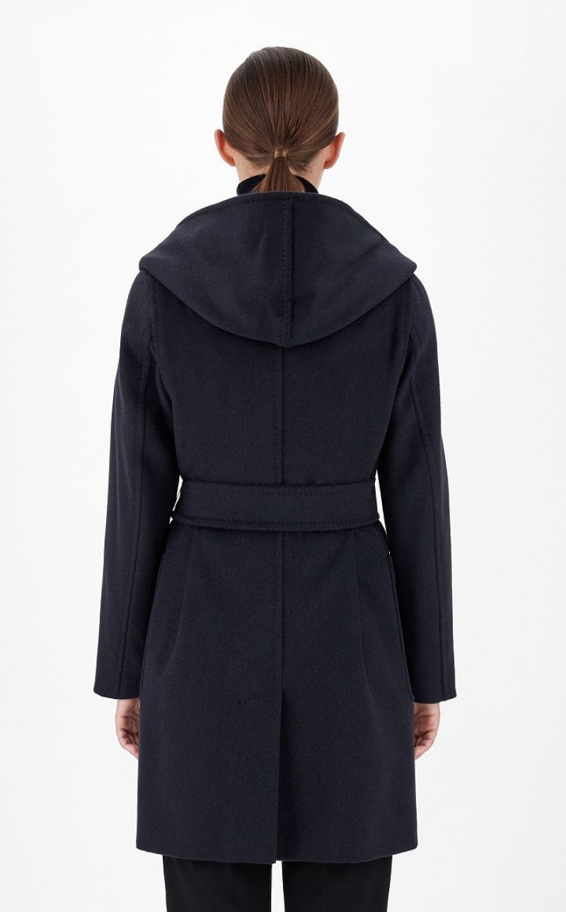 Wrap coat in exquisite sable-trimmed pure camel featuring an enveloping silhouette with hood, long set-in sleeves and patch pockets on the front. Feminine style finished with sartorial pick stitch and matching belt to accentuate the waist. Length: 90 cm.
