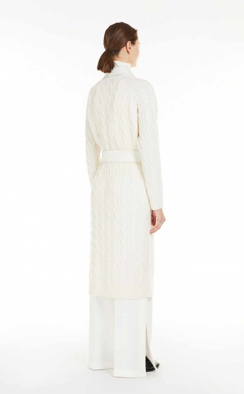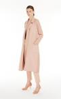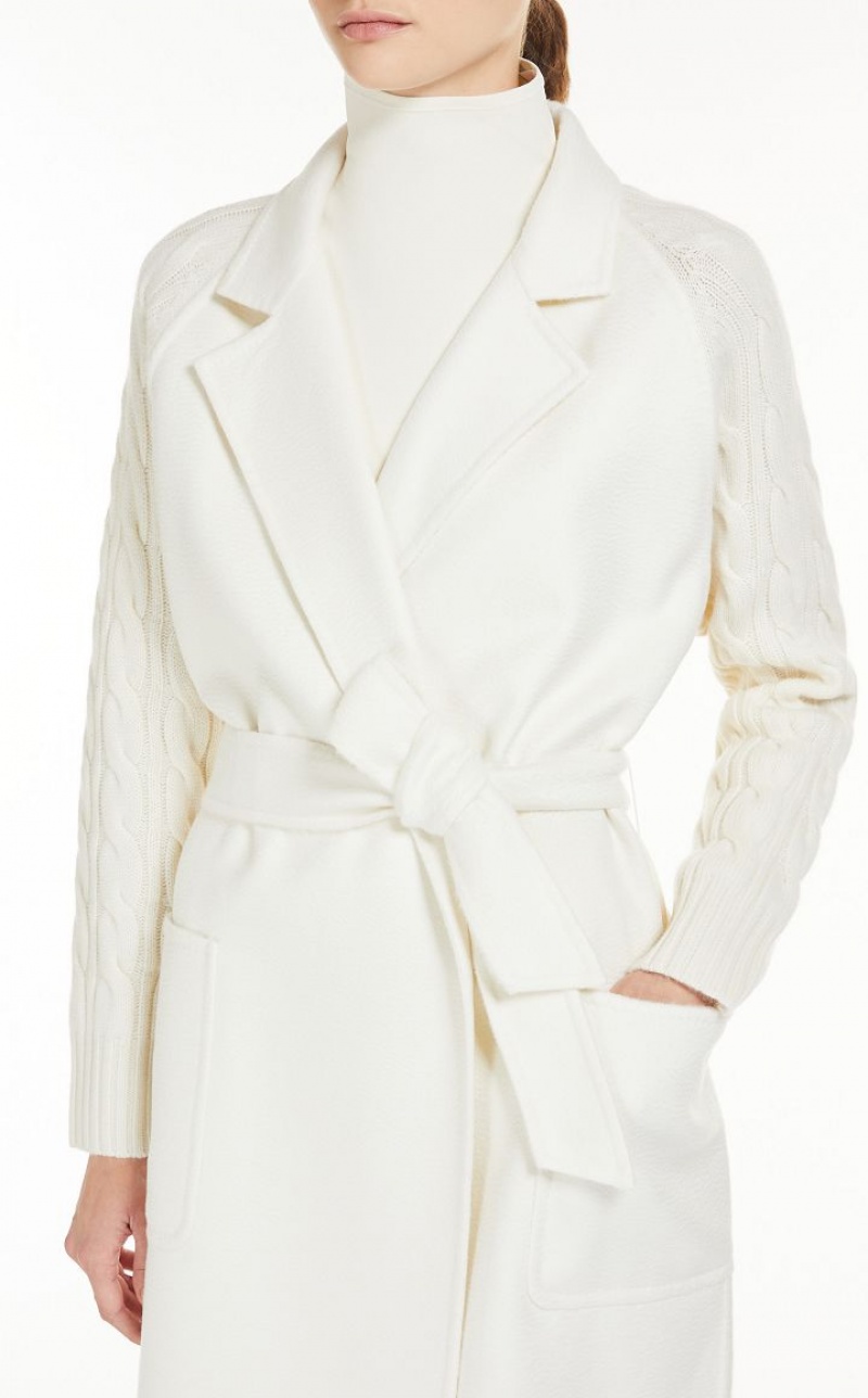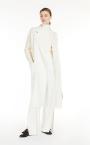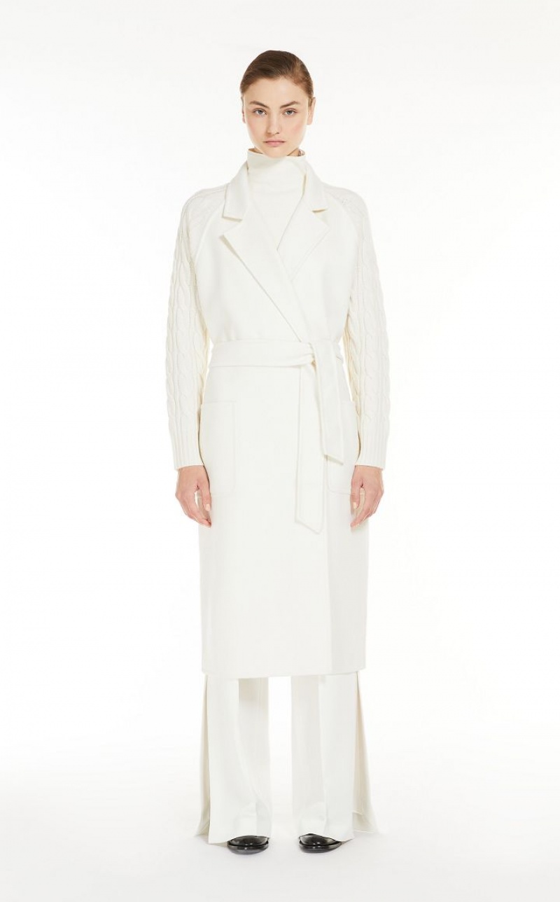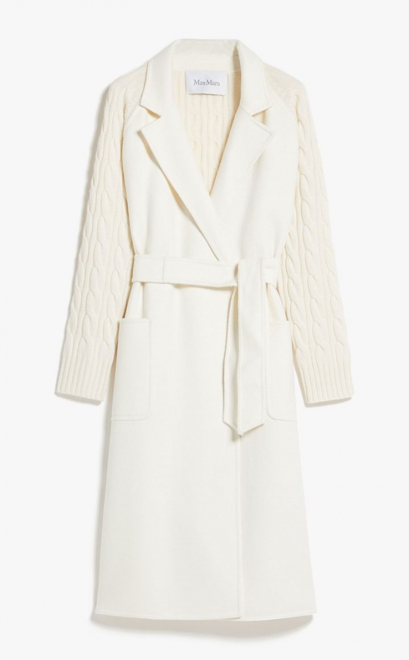 Long robe-style coat crafted in fine wool and cashmere shuttle-weave fabric, featuring ribbed-knit raglan sleeves and cable-knit details on the back. Unlined model with lapel collar, patch pockets on the front and wraparound fastening with matching belt. Finished with tailored binding. Length: 115 cm.