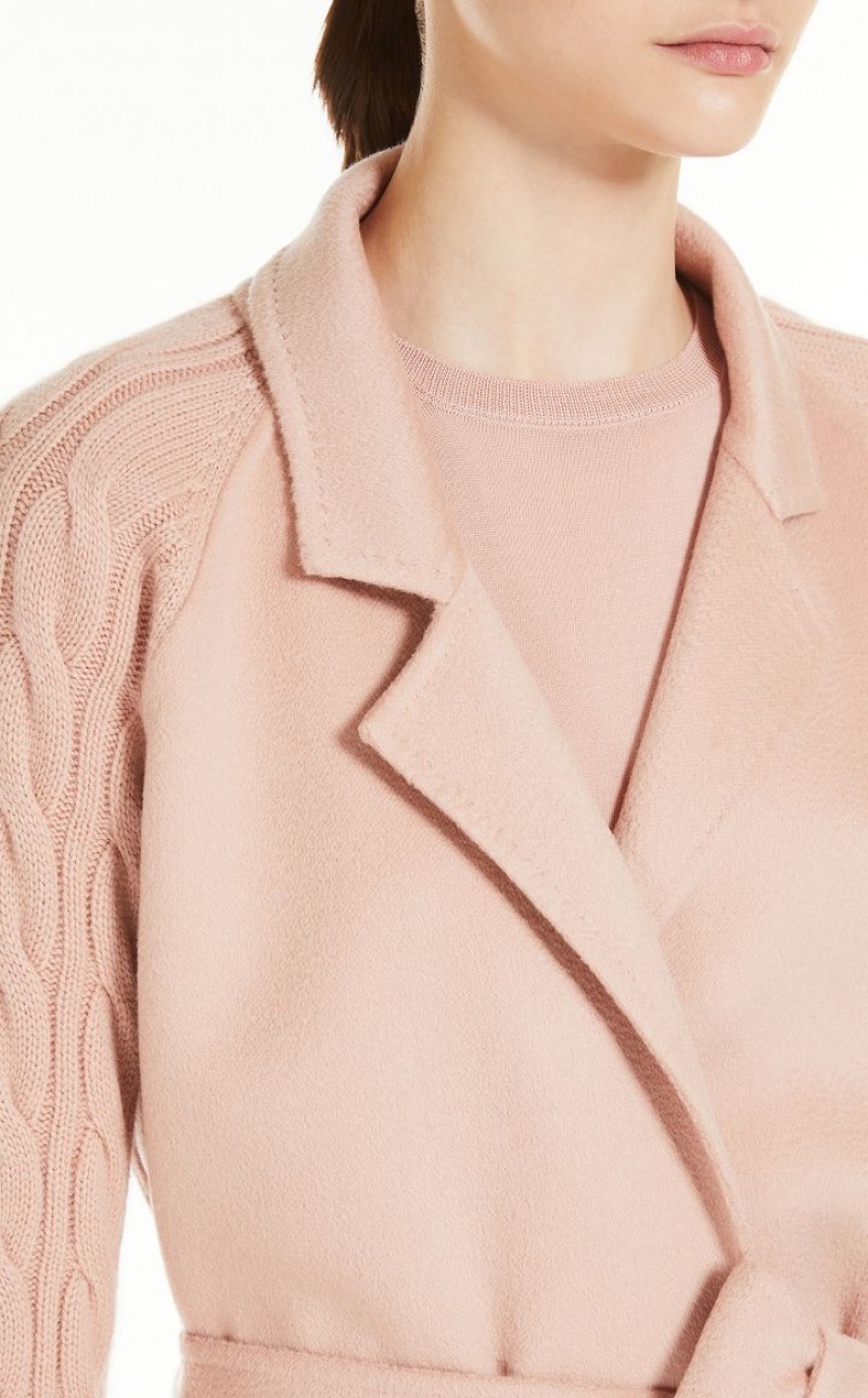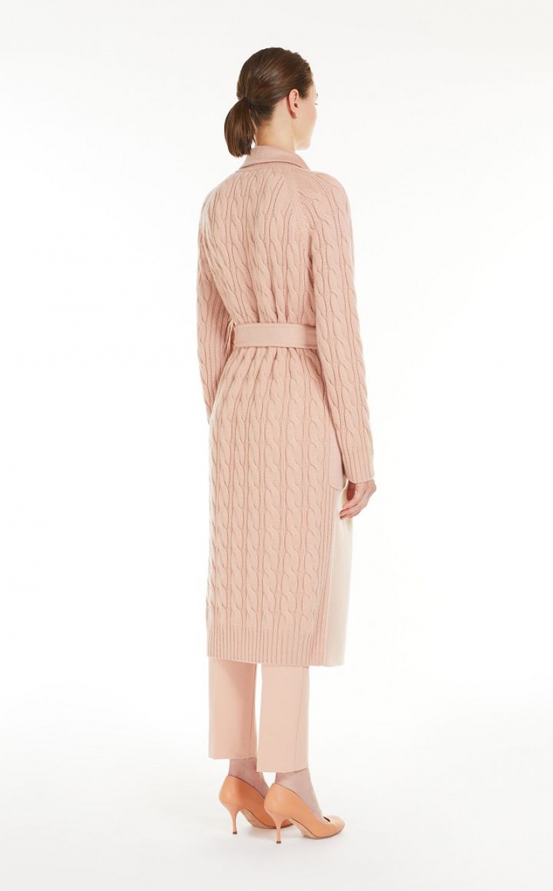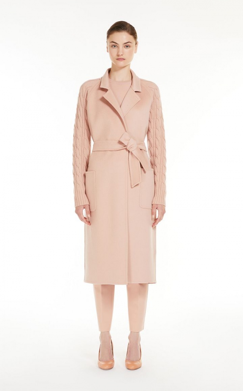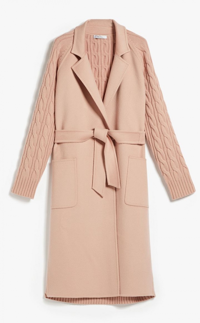Long robe-style coat crafted in fine wool and cashmere shuttle-weave fabric, featuring ribbed-knit raglan sleeves and cable-knit details on the back. Unlined model with lapel collar, patch pockets on the front and wraparound fastening with matching belt. Finished with tailored binding. Length: 115 cm.
