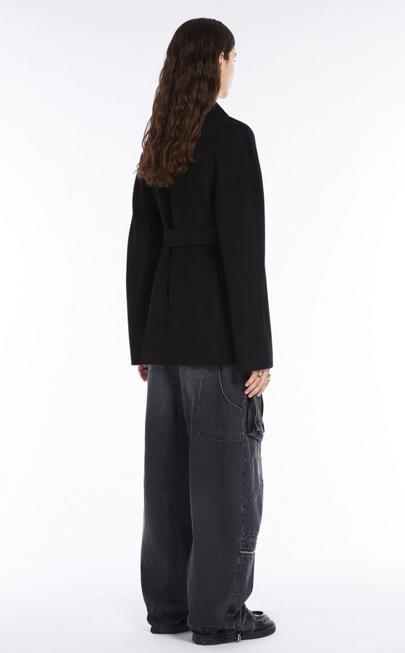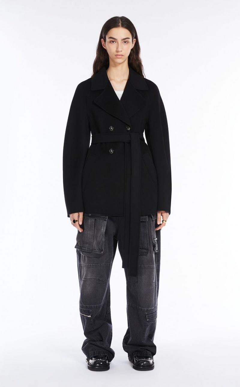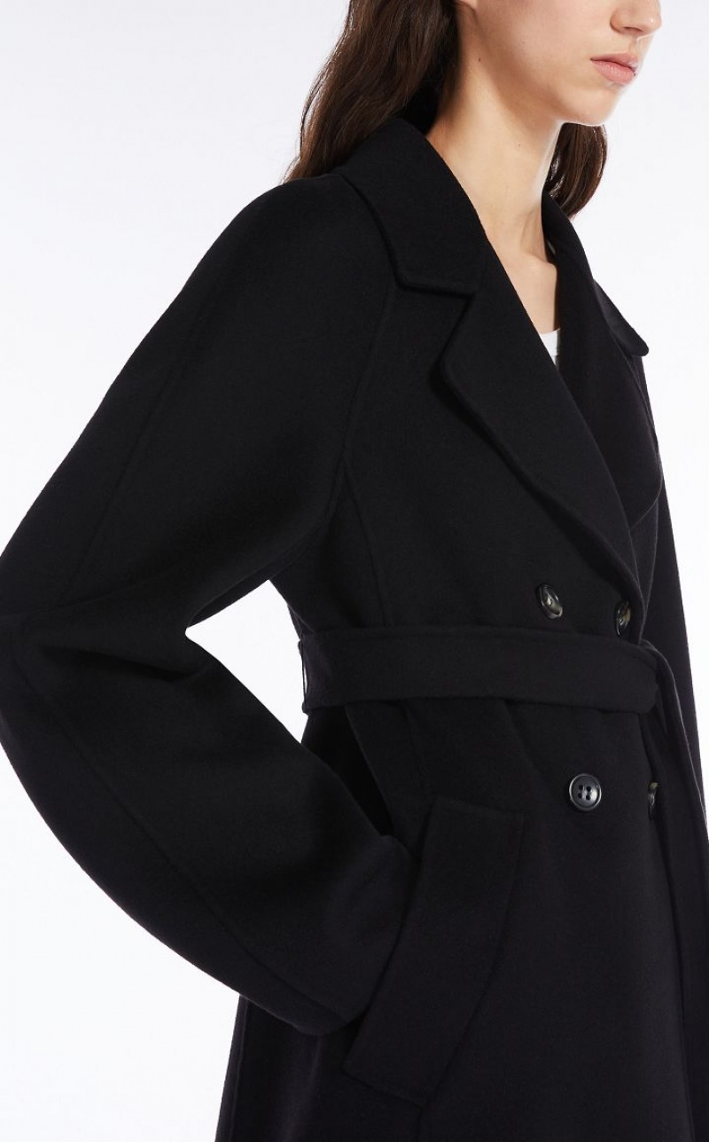 Double-breasted robe-style jacket, cut to a length below the hips. Made of wool and cashmere double-face cloth with a soft, warm feel, it features wide lapels, large welt pockets and raglan sleeves. Wide belt in fabric to pull in at the waistline.