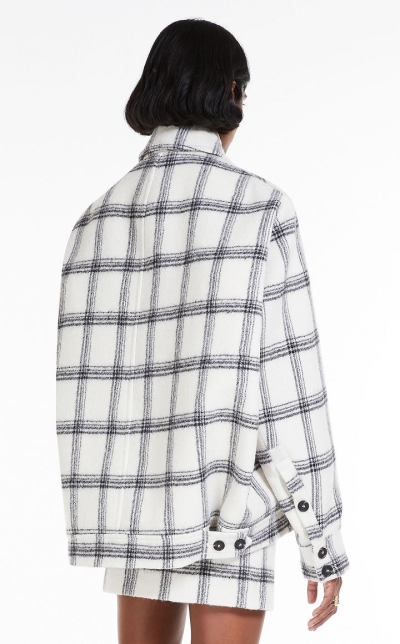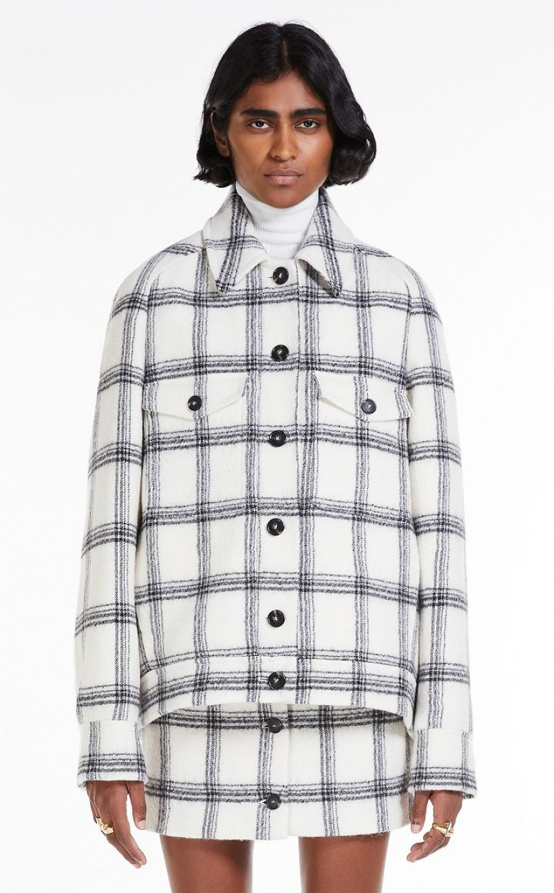 Large-volume jacket, with an exaggerated line at the back. Made of felted wool with a check design, it features a shirt collar construction, raglan cut on the sleeves and oversized patch pockets on the front with a shaped flap and button. Inset side pockets. Garment length: 76 cm.