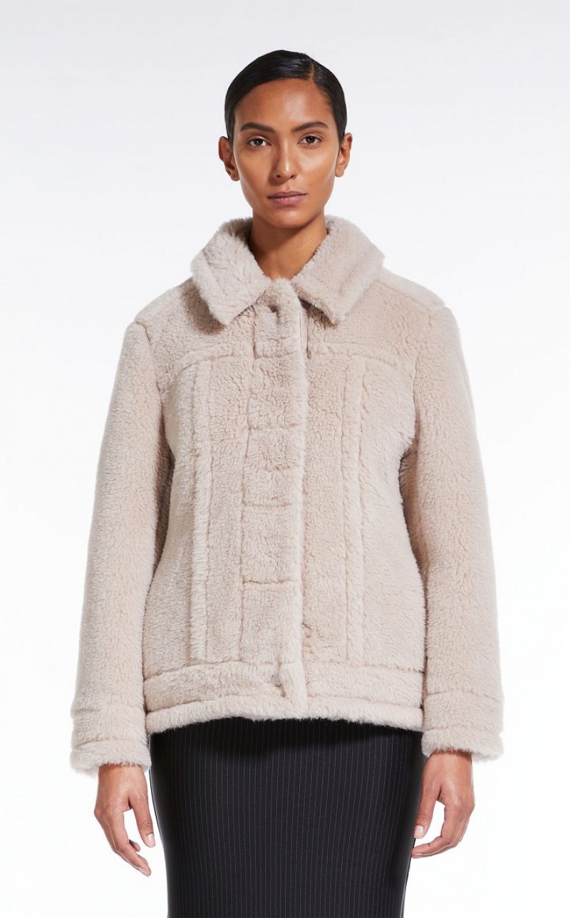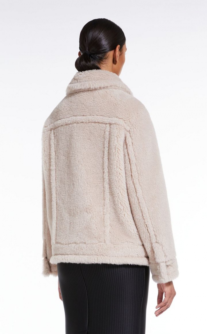New Teddy jacket made of iconic alpaca and wool fabric on a silk base. Inspired by the classic denim model, it features straight lines cropped to the waist, and is completed by pockets inserted into the vertical cuts and long sleeves with cuffs. Concealed front closure with customised enamelled-metal studs. Lined with monogram fabric. Length: 62 cm.