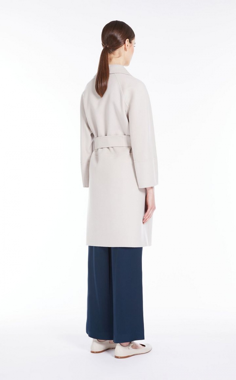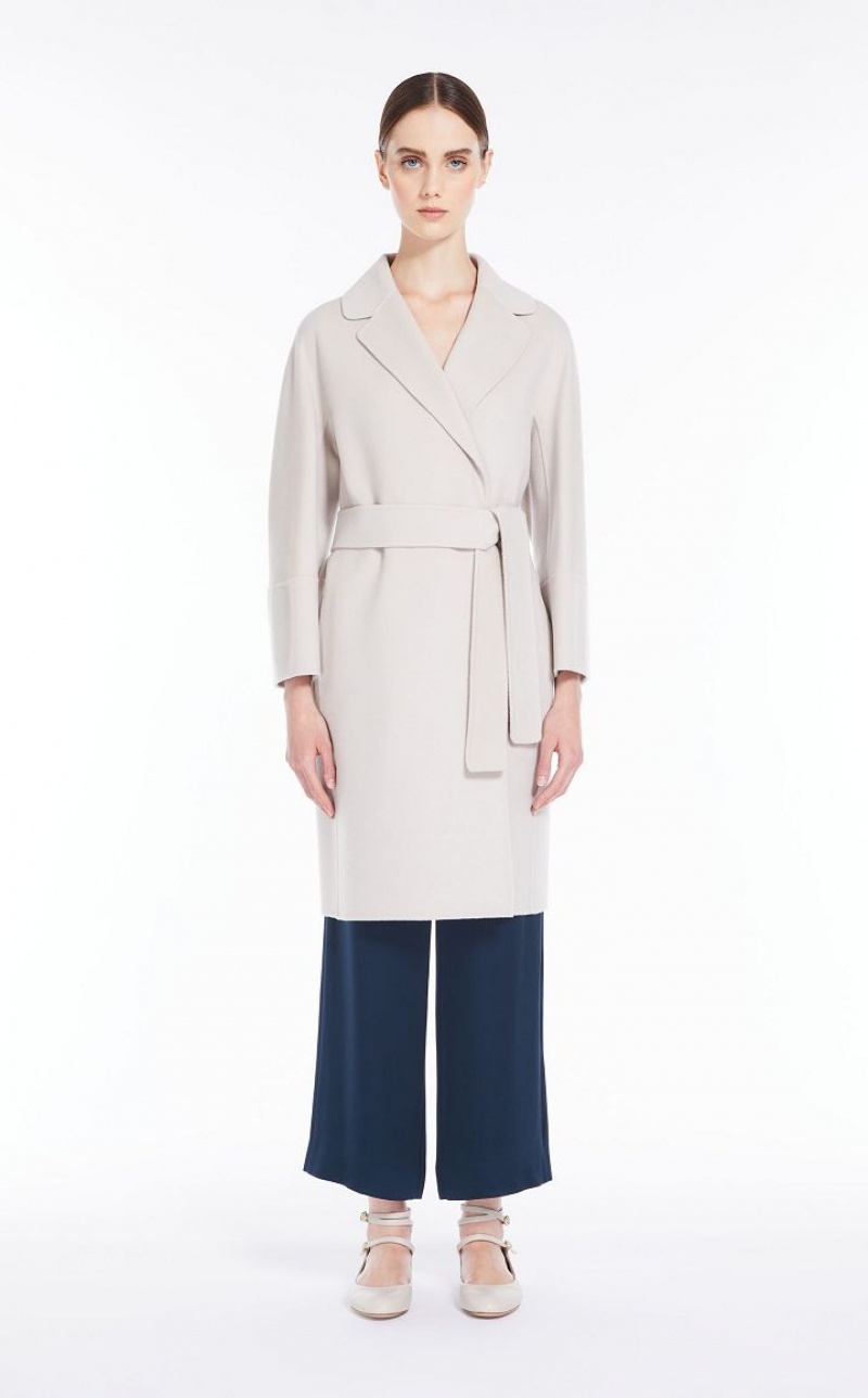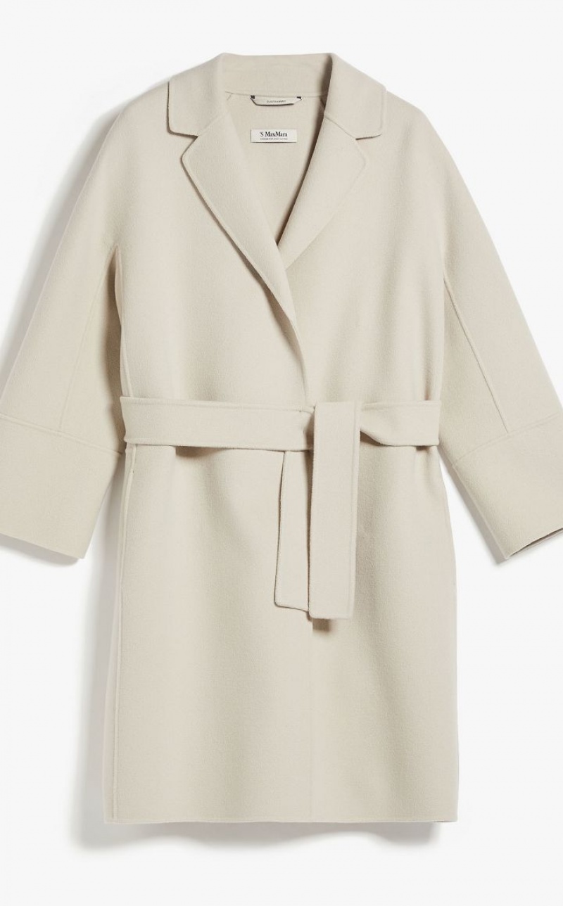Short coat in fine hand-sewn double-faced pure wool fabric featuring a comfort fit that tapers sightly at the hem. The unlined model boasts a small lapel collar, in-seam side pockets, kimono sleeves on the front and raglan sleeves at the back. Silhouette-accentuating matching waist belt. Length: 94 cm.