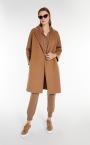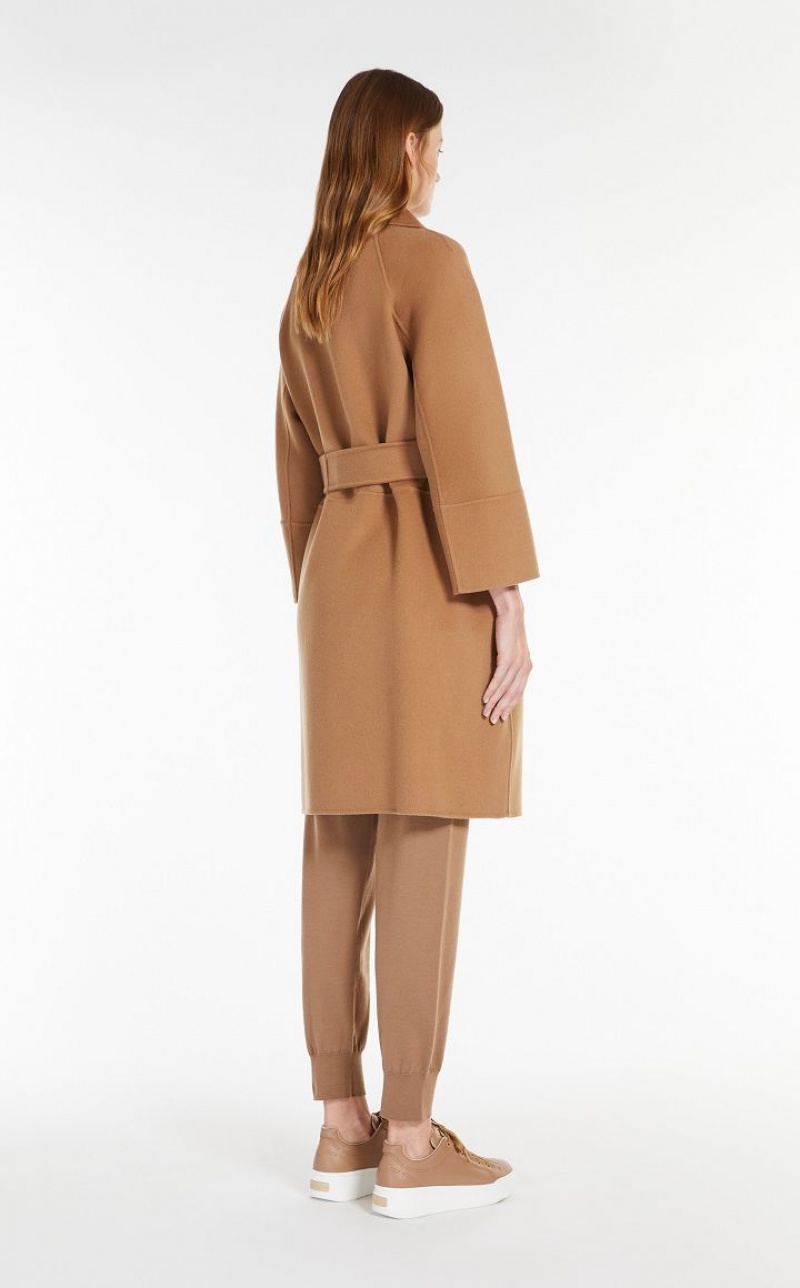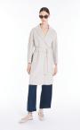 Short coat in fine hand-sewn double-faced pure wool fabric featuring a comfort fit that tapers sightly at the hem. The unlined model boasts a small lapel collar, in-seam side pockets, kimono sleeves on the front and raglan sleeves at the back. Silhouette-accentuating matching waist belt. Length: 94 cm.