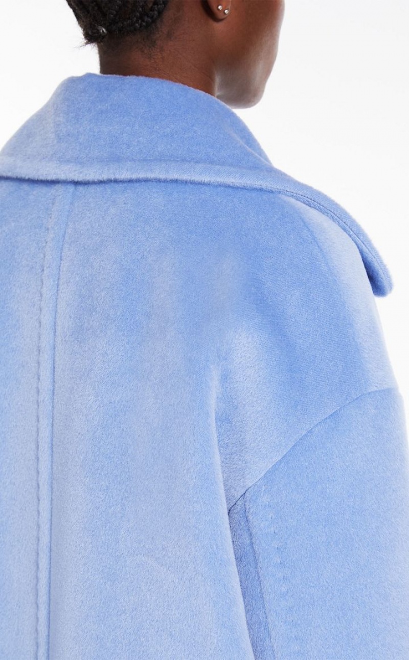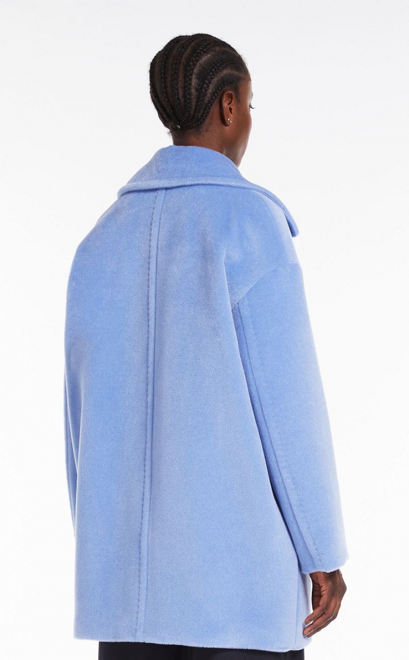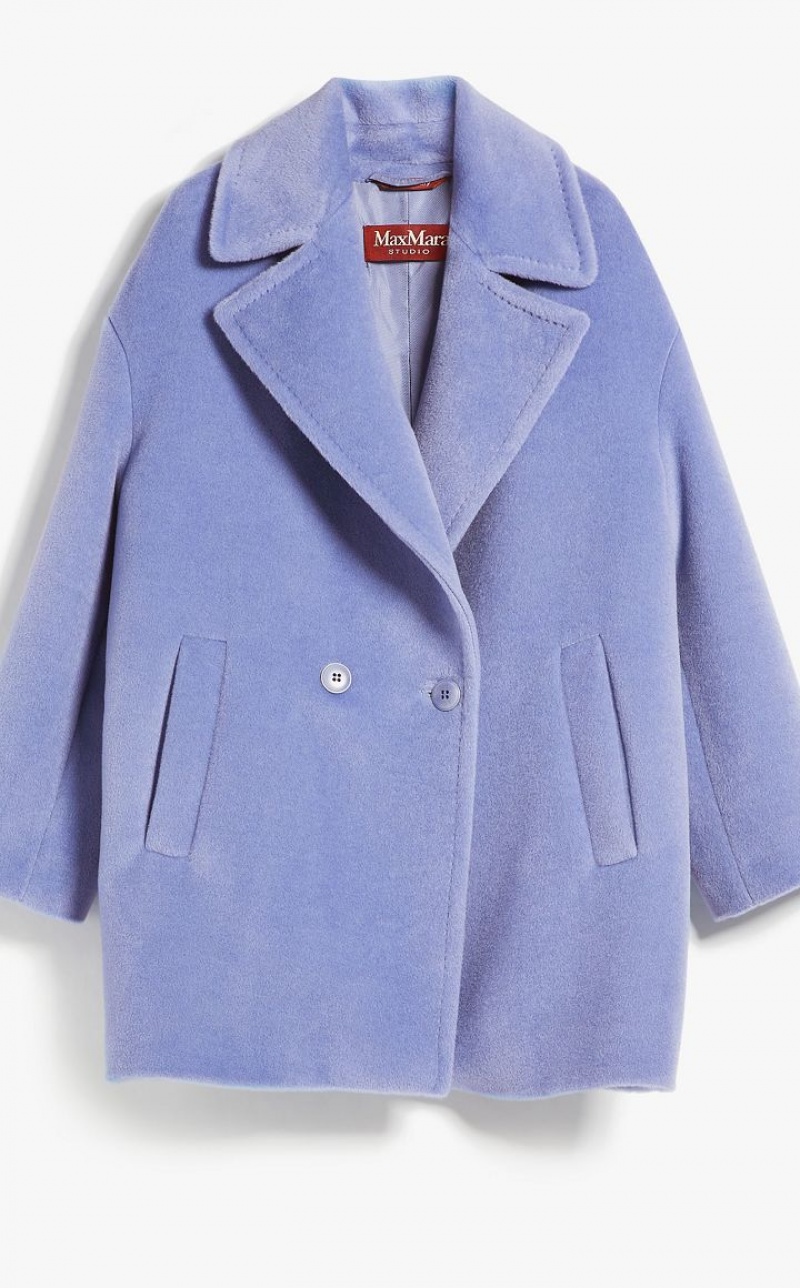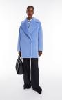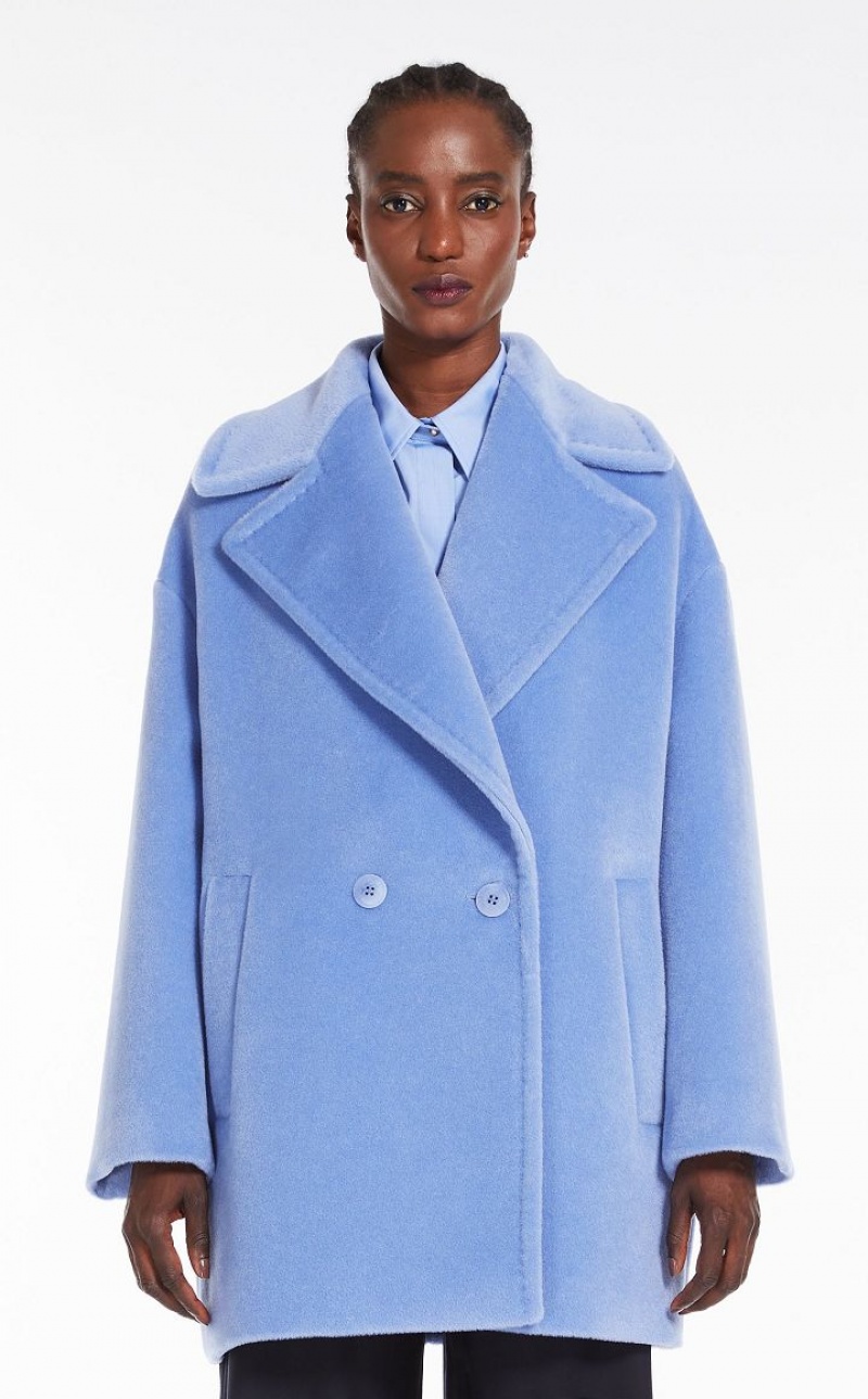 Double-breasted pea coat in fine alpaca and wool fabric. The slight egg-shaped model boasts a wide lapel collar, long set-in sleeves and side pockets. Lined model. Button fastening. Length: 82 cm.