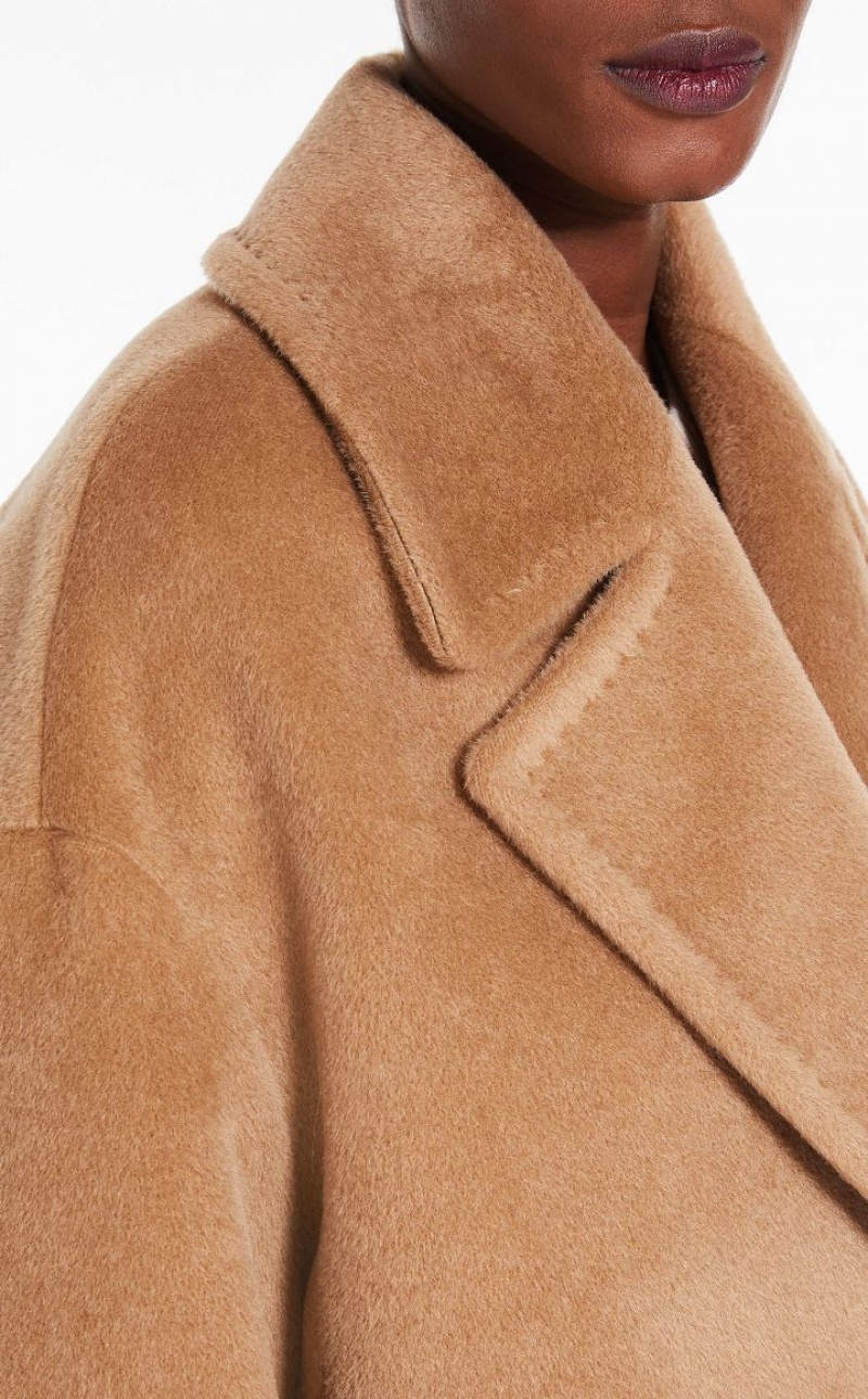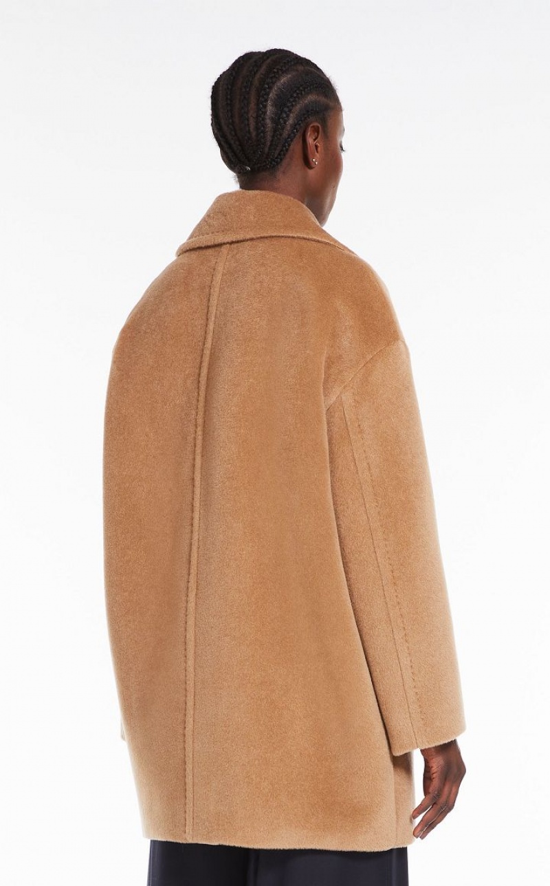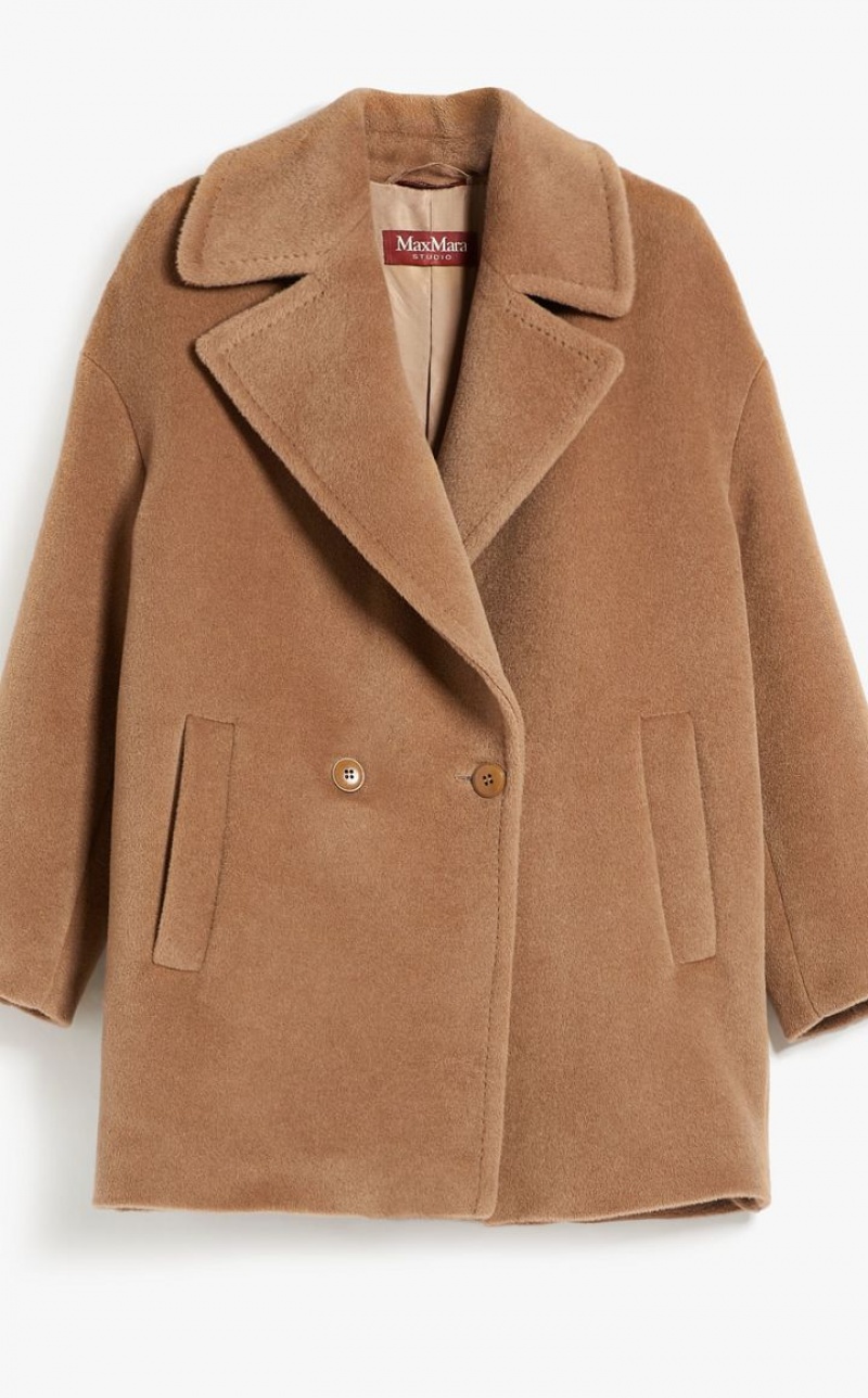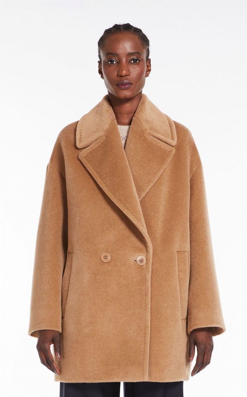 Double-breasted pea coat in fine alpaca and wool fabric. The slight egg-shaped model boasts a wide lapel collar, long set-in sleeves and side pockets. Lined model. Button fastening. Length: 82 cm.