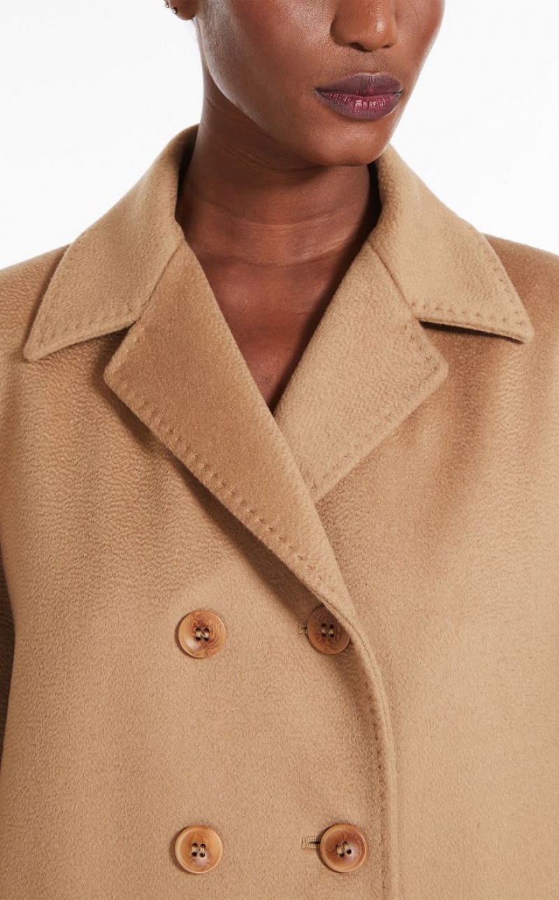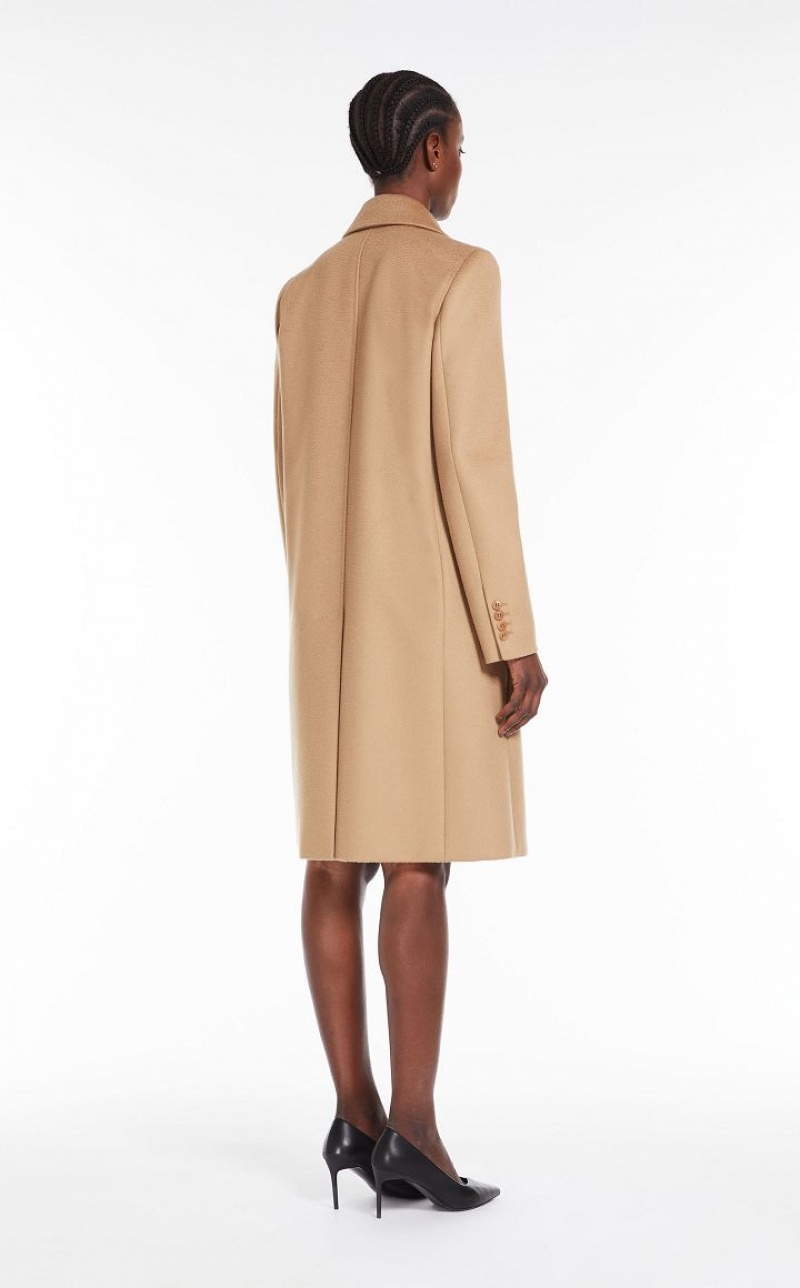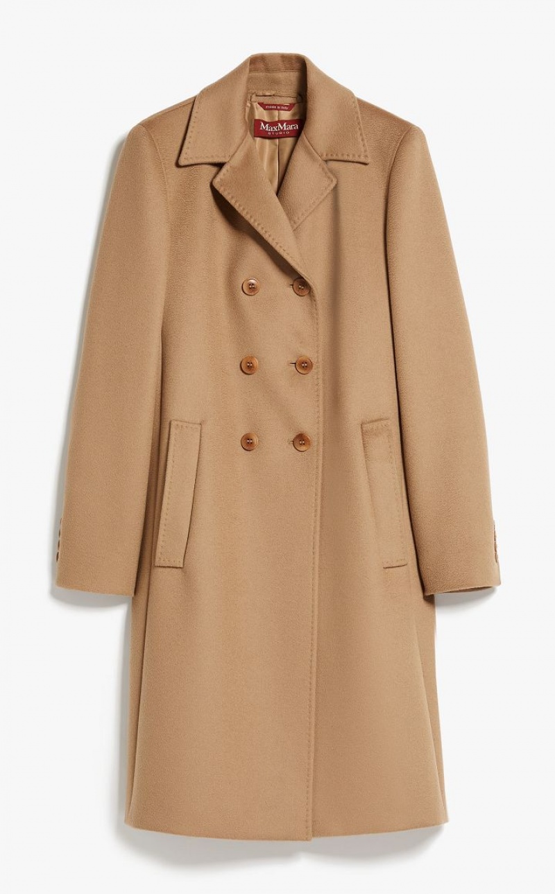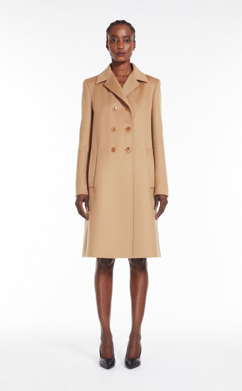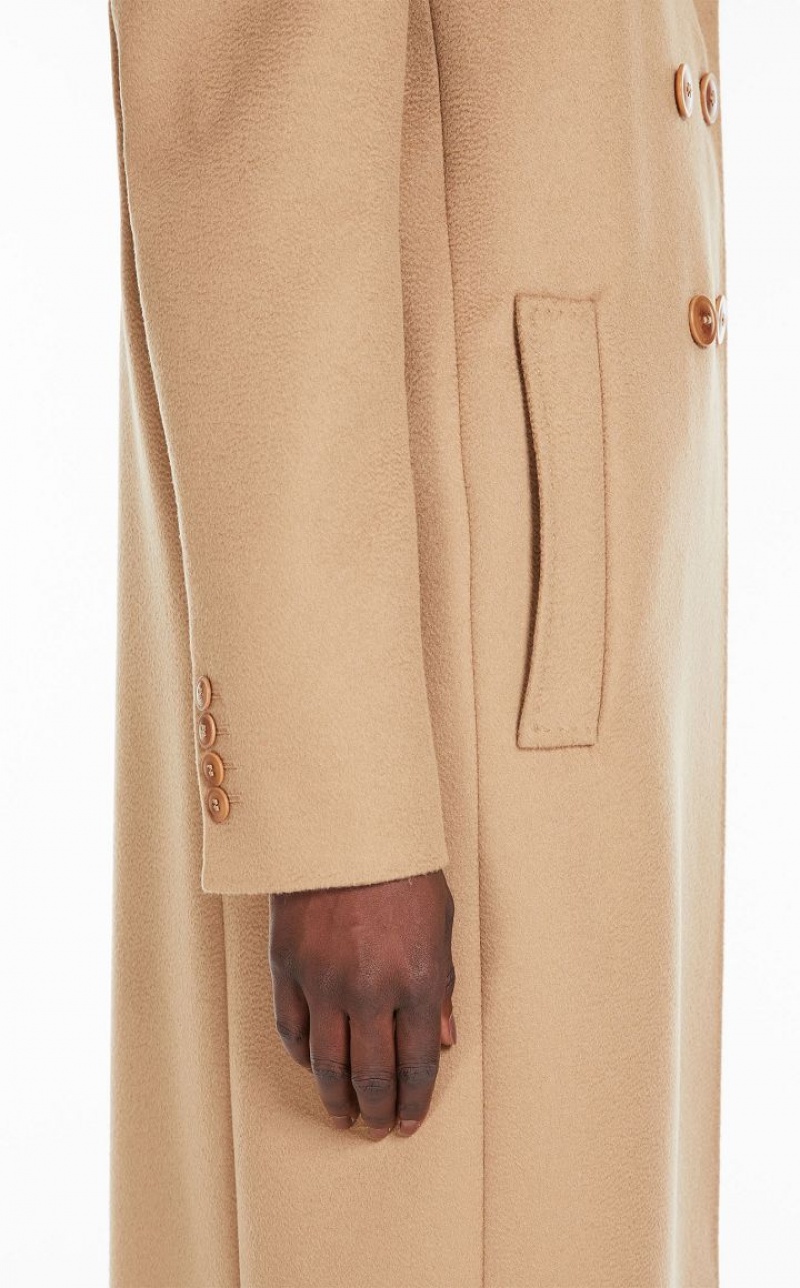 Elegant double-breasted long coat in fine pure wool fabric featuring a lapel collar, side pockets and a fitted-waist silhouette. Lined model. Button fastening. Length: 100 cm.