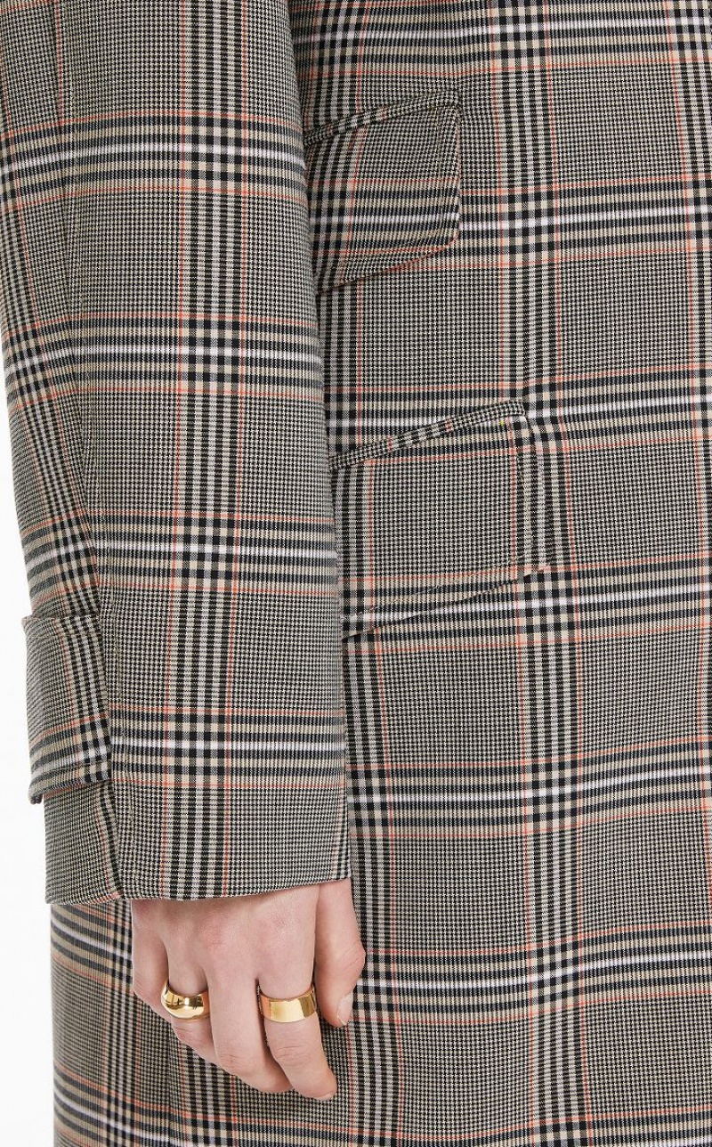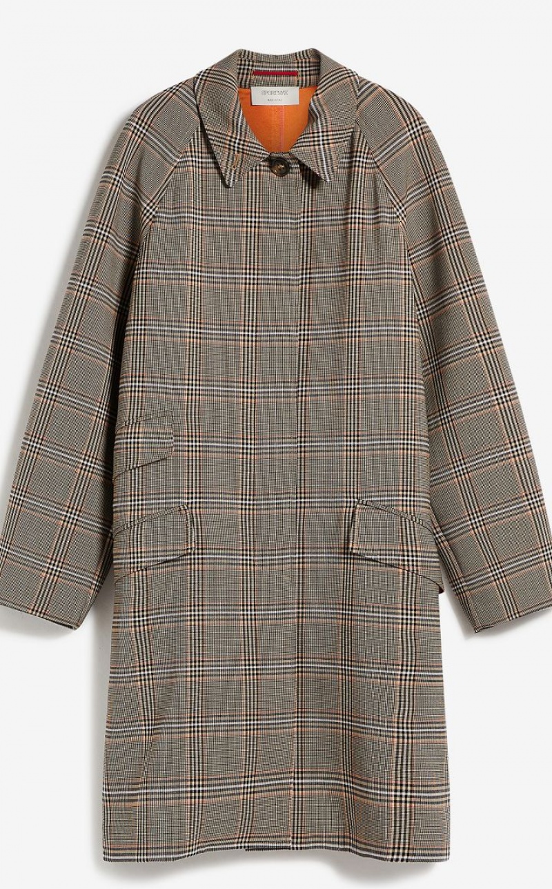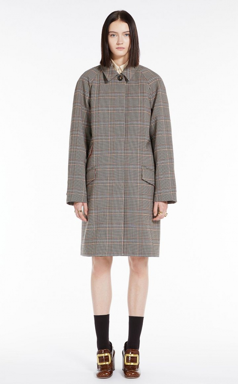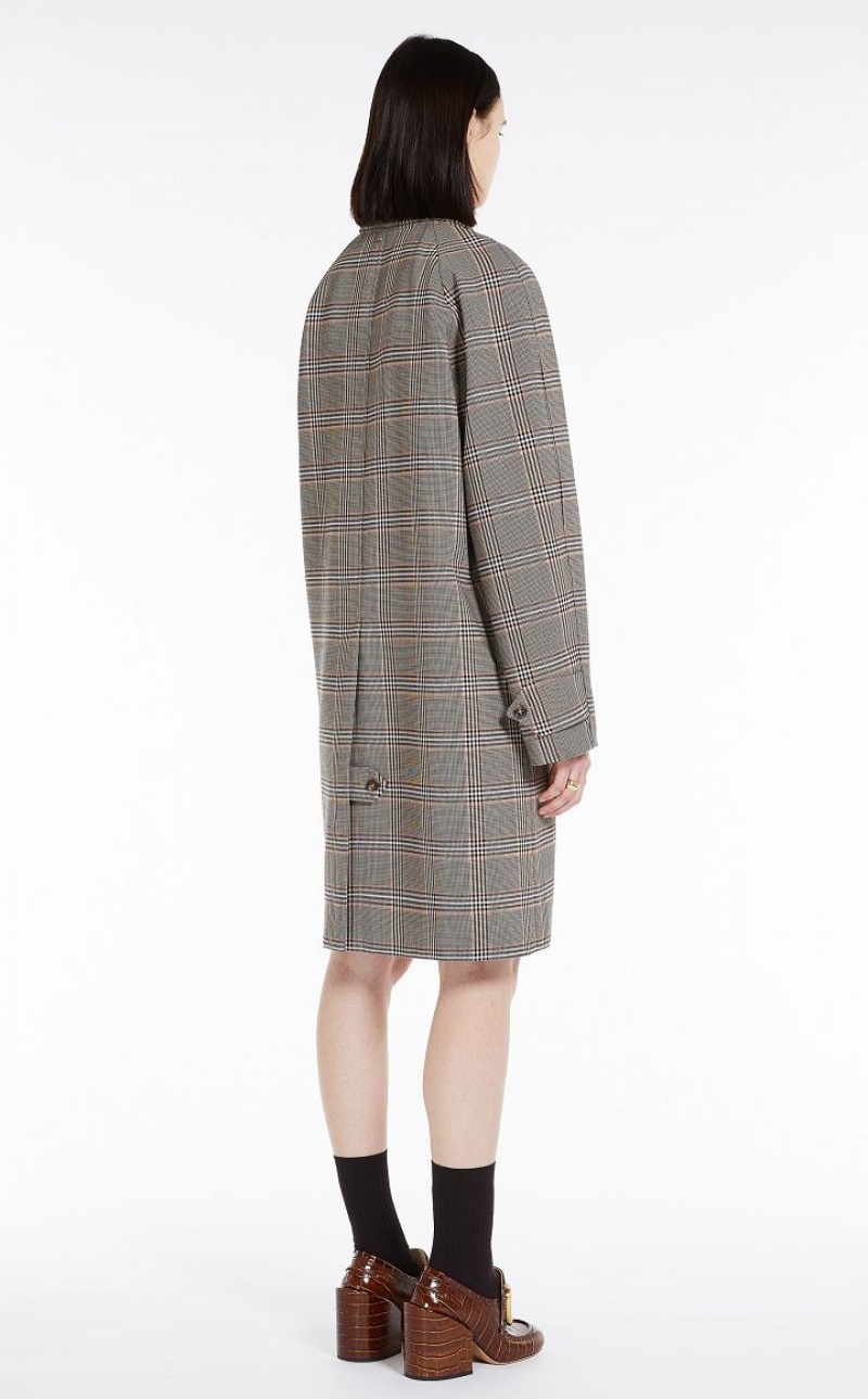 Straight-cut duster coat, made of a wool blend with Prince of Wales check, internally bonded with contrasting coloured technical satin. Straight fit with raglan sleeves, cuffs with tab and button, three flap pockets on the sides. The button at the collar allows you to wear it fully closed. Overlapping back vent, with strap fastener. Knee-length.