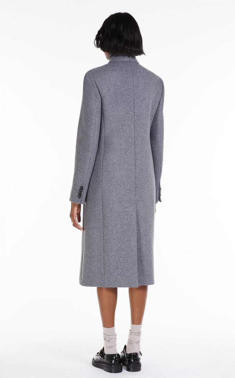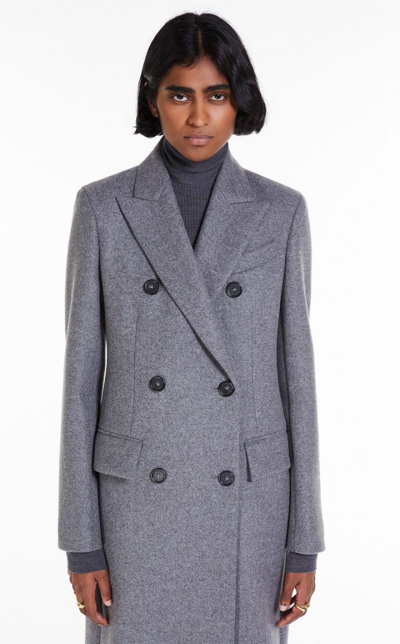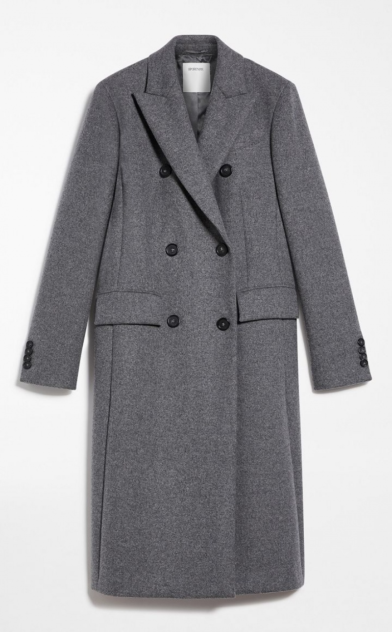 Double-breasted coat made of a wool and cashmere cloth, with a soft feel. The construction is masculine, with side panels and darts that define the figure. Neckline with peak lapels, shoulders slightly padded inside and side pockets with flap. The back features a central overlapping vent.