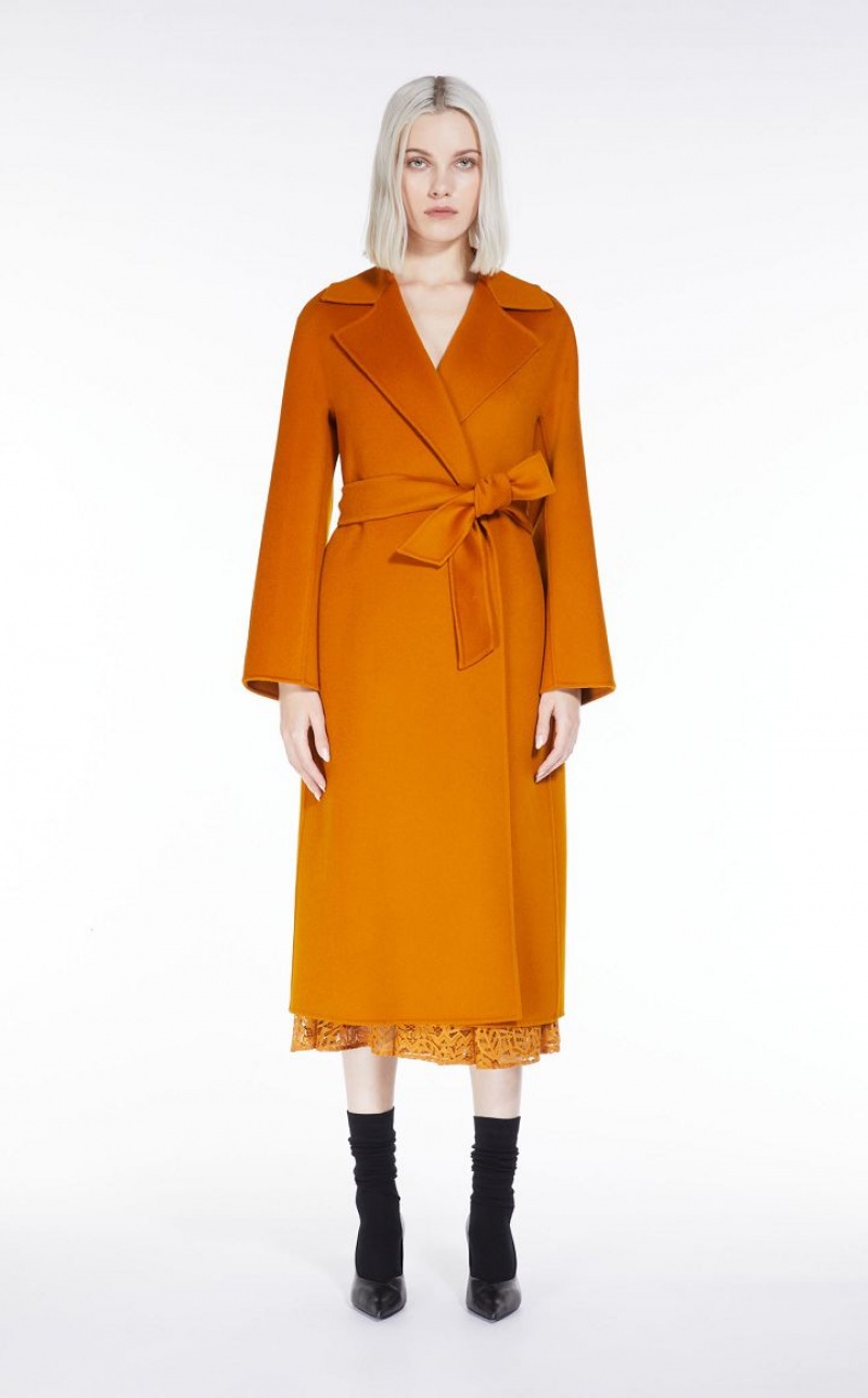 Long robe coat in fine wool, cashmere and silk yarn. The wraparound model boasts a wide lapel collar, long kimono sleeves and side pockets. Silhouette-accentuating matching belt. Length: 115 cm.