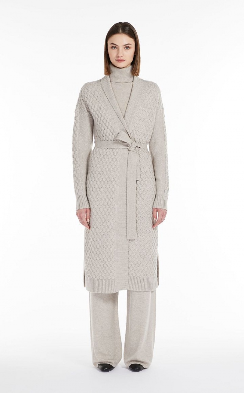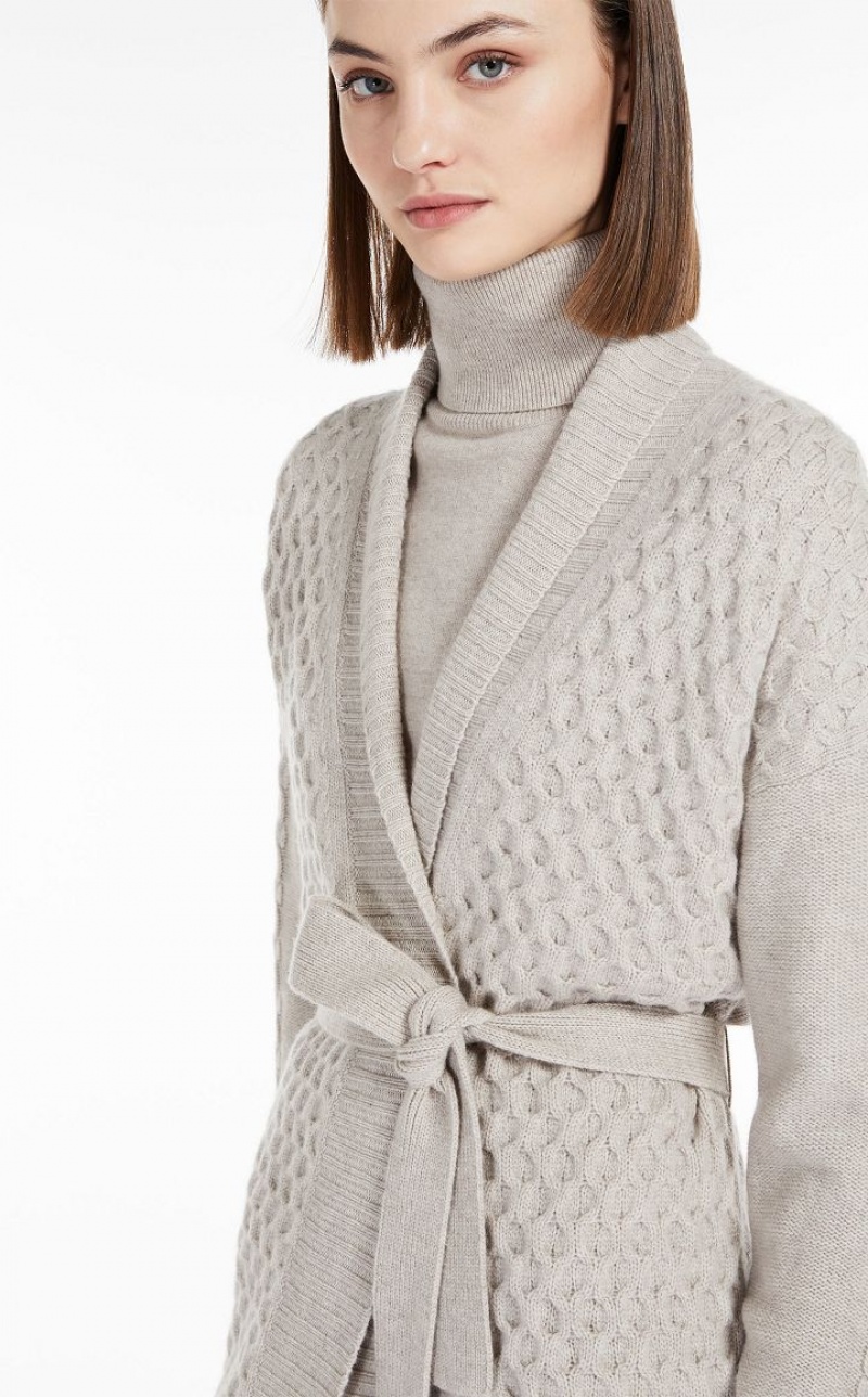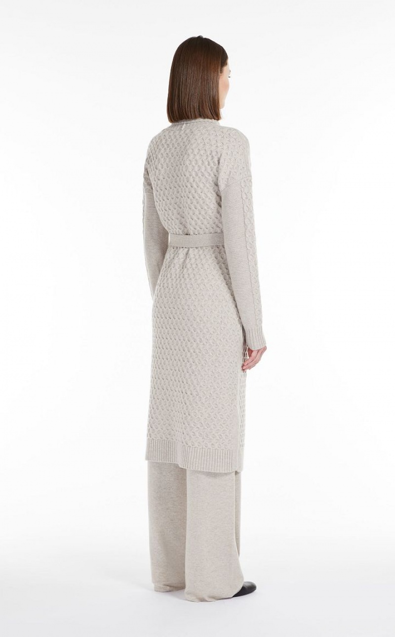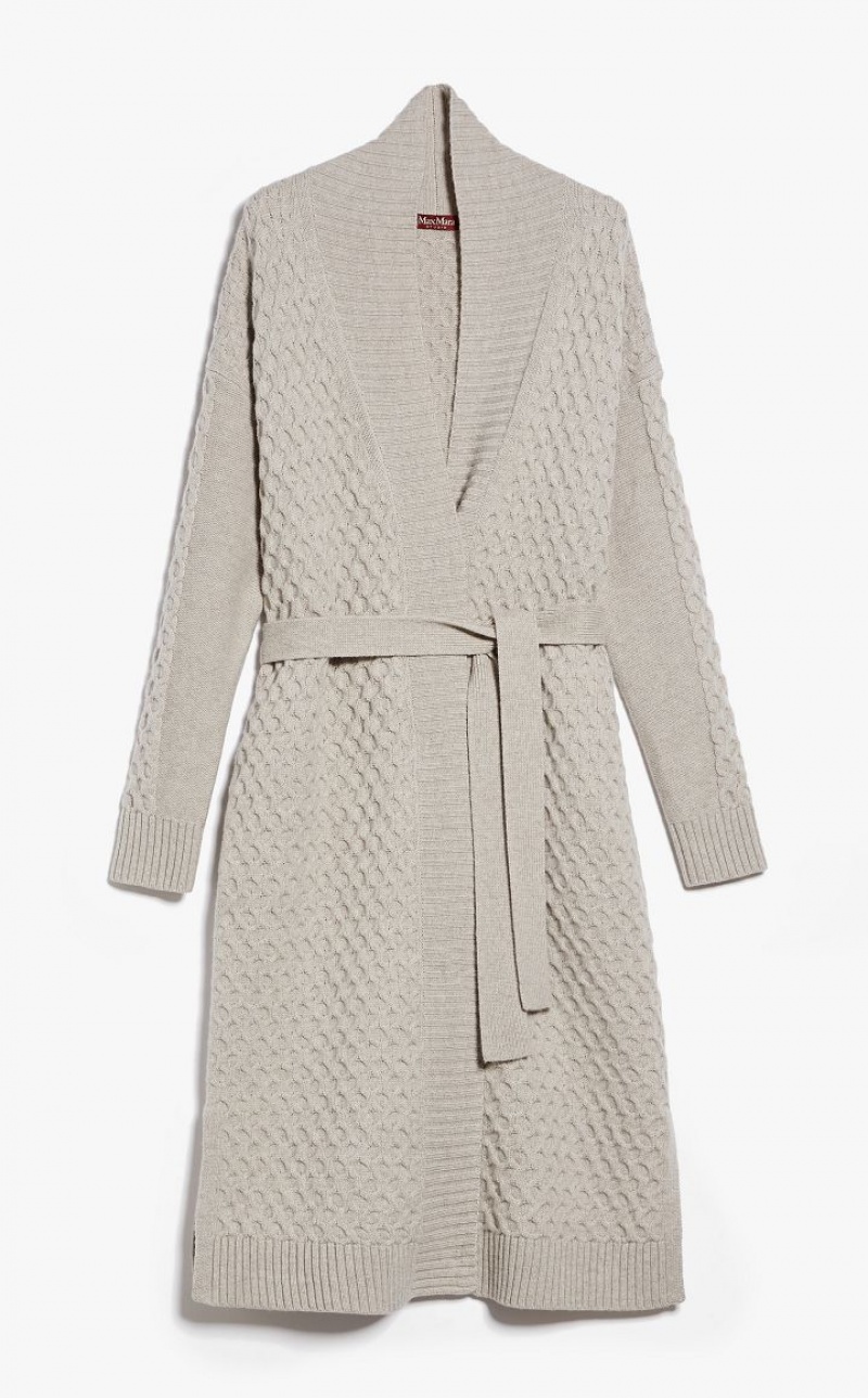 Maxi cardigan in fine wool and cashmere yarn finished with basketweave stitch. Shawl collar, long sleeves, side slits at the hem. The coordinated fabric belt accentuates the silhouette. Length: 112 cm.