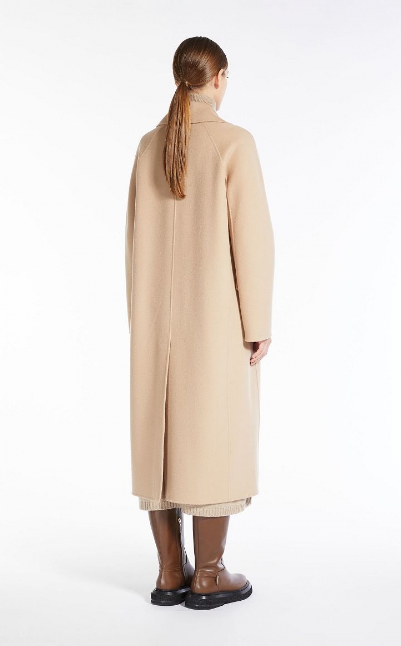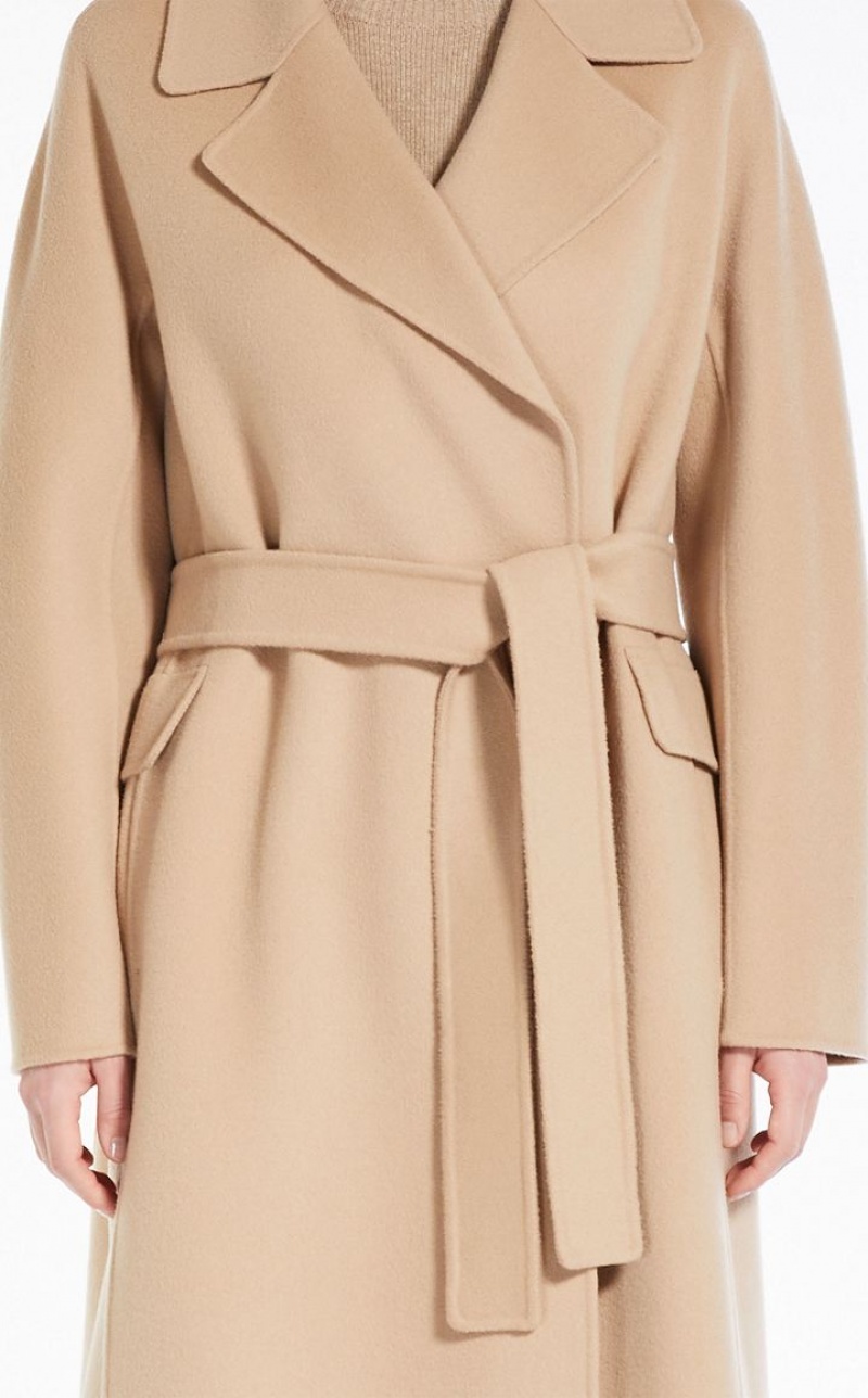 Wraparound double breasted midi coat in soft hand sewn double faced pure wool fabric. The model boasts a lapel collar, flap adorned side pockets and a central rear vent. Kimono sleeves with a raglan cut at the back. Button fastening and a silhouette accentuating matching belt. Length: 117 cm.