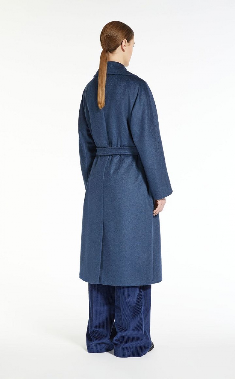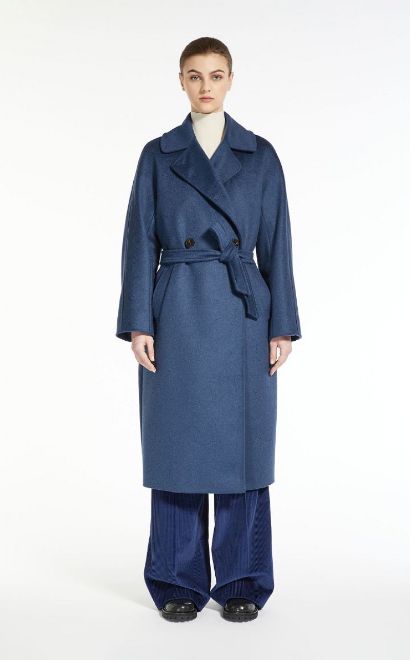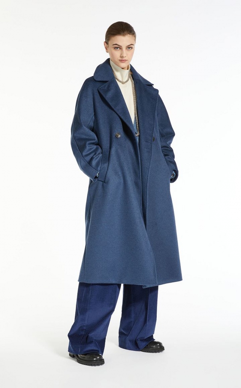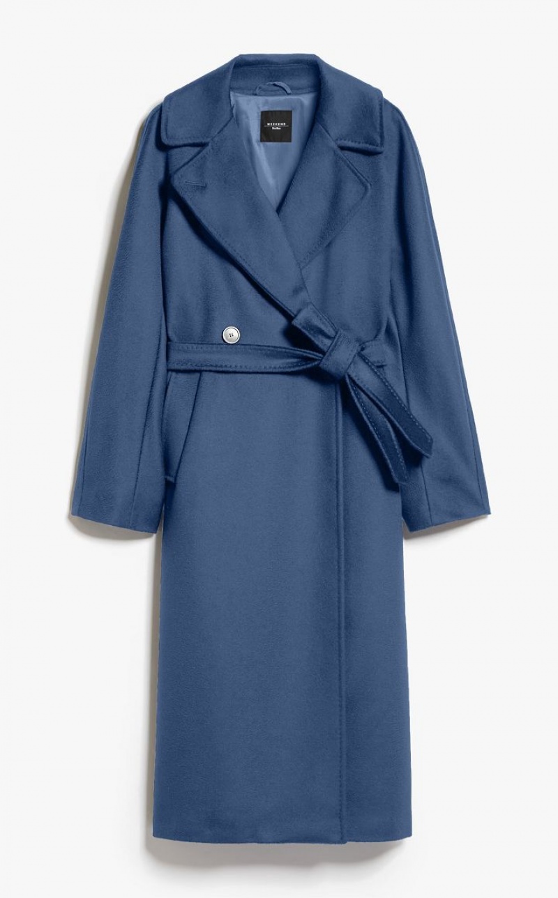Double breasted pure wool broadcloth coat featuring tailored details. Lapel collar, long kimono sleeves and welt pockets. Button fastening and a matching belt. Length: 115 cm. Lined interior.