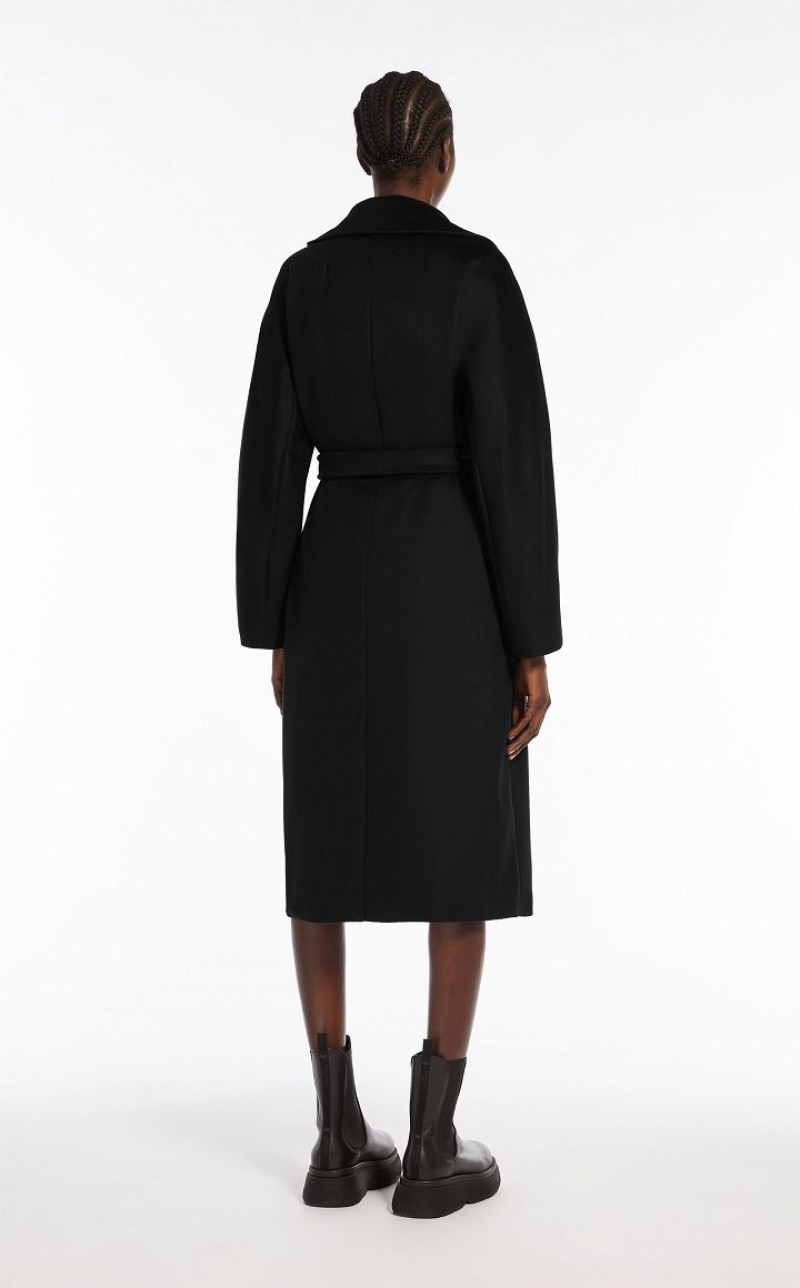 Double breasted pure wool broadcloth coat featuring tailored details. Lapel collar, long kimono sleeves and welt pockets. Button fastening and a matching belt. Length: 115 cm. Lined interior.