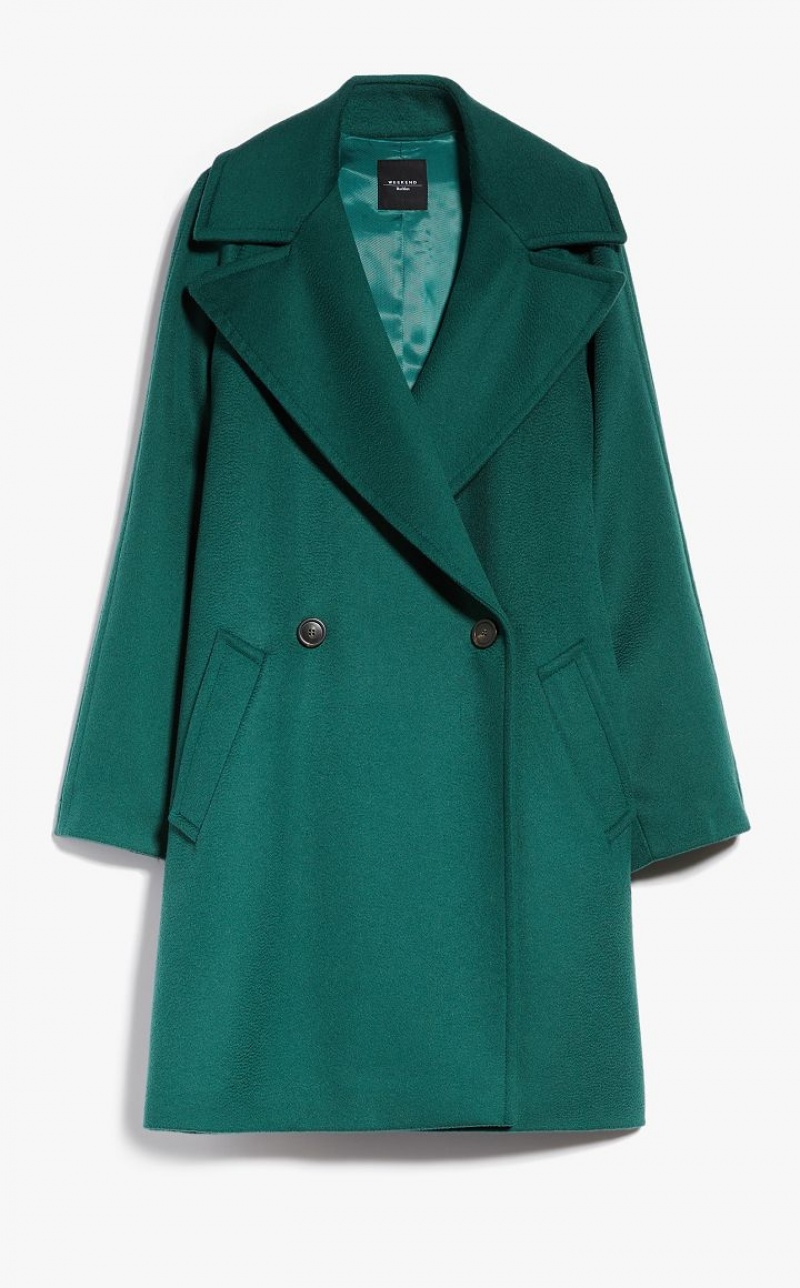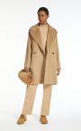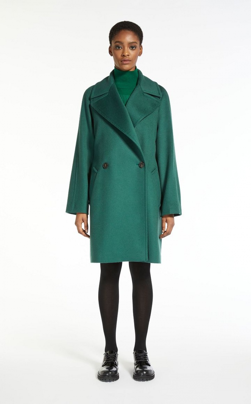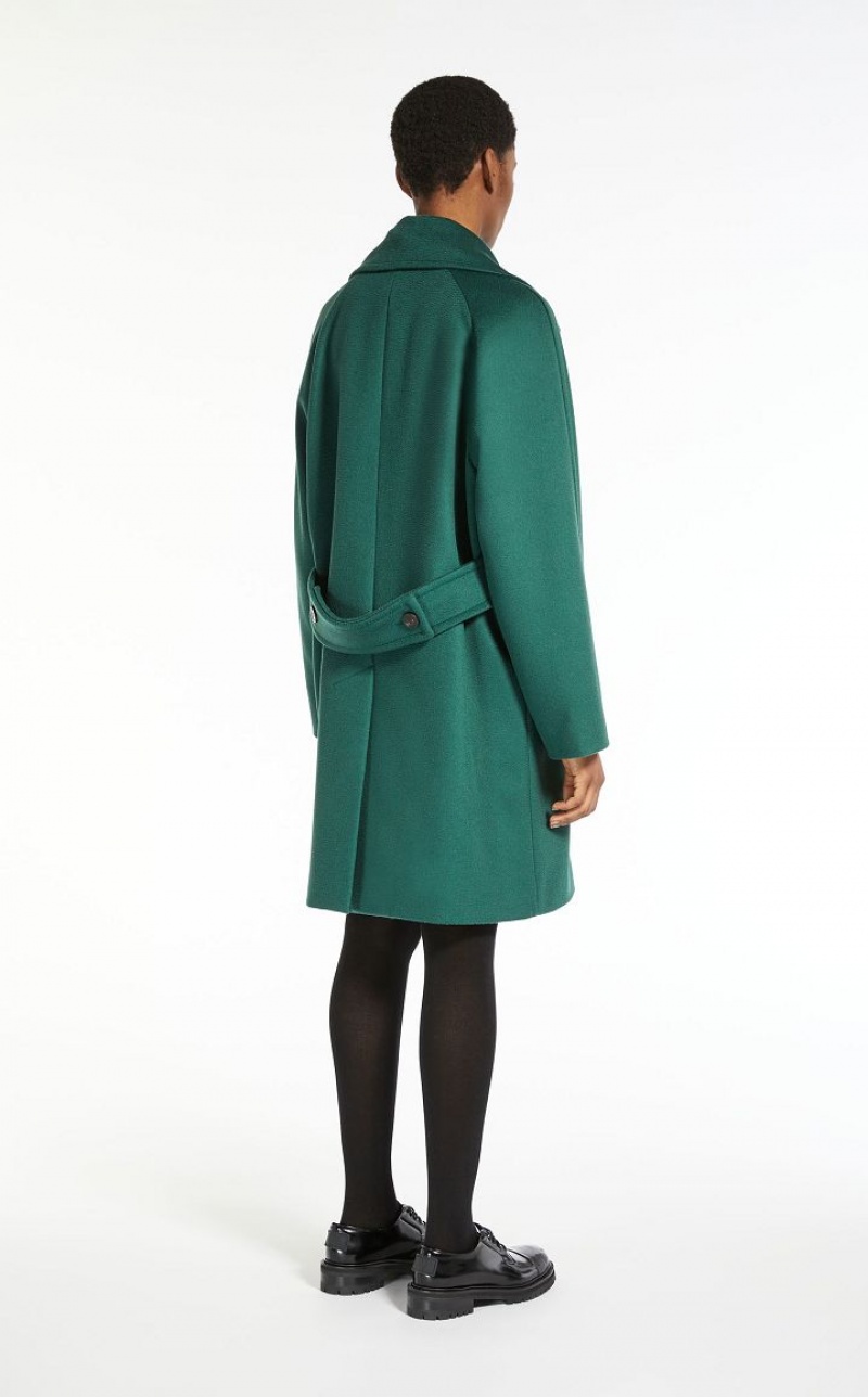 Double breasted coat in double faced pure wool broadcloth featuring wide lapels, long raglan sleeves and welt pockets. Garment completing buttoned half-belt detail at the back. Two button fastening. Length: 95 cm.