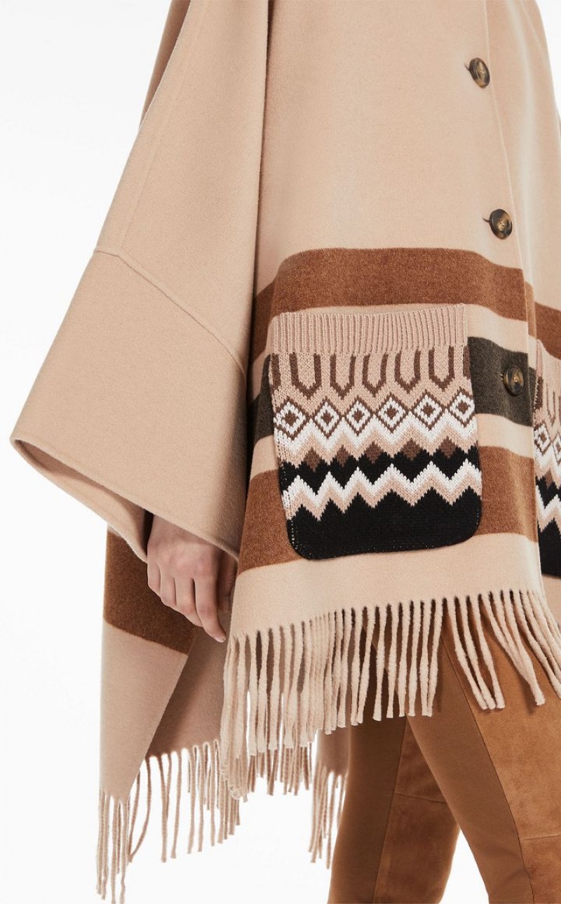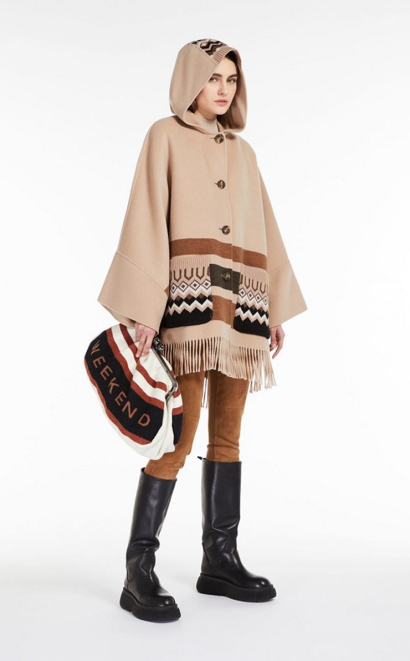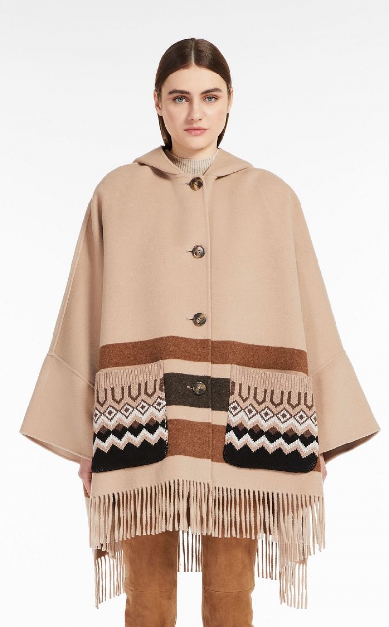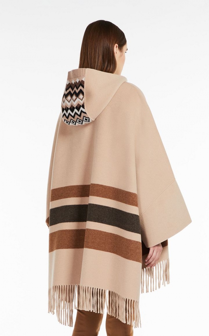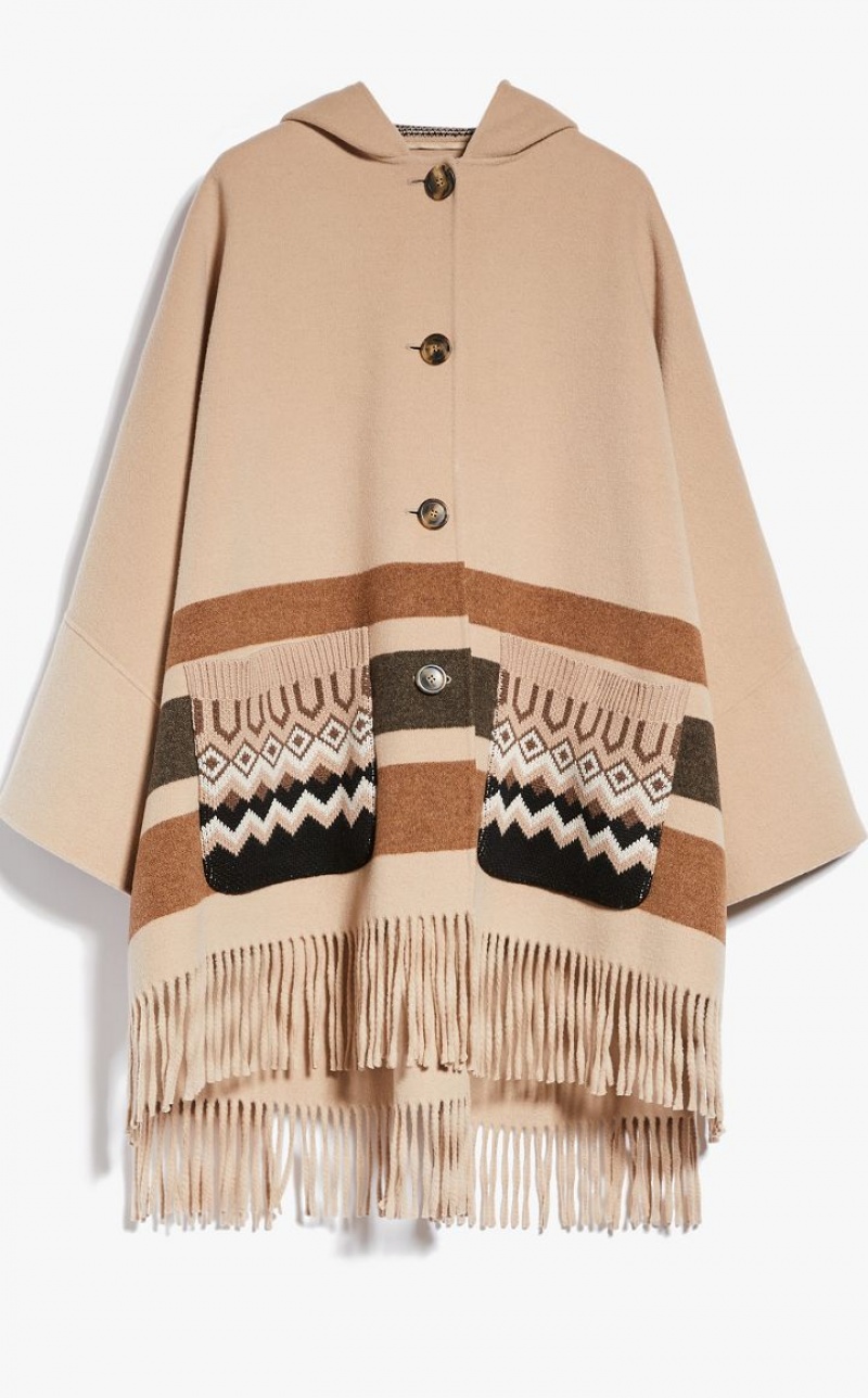 Hooded cape in double faced wool fabric featuring wide hem kimono sleeves and side slit detail. The jacquard knit details accentuate the garment's texture, whilst the striped pattern and fringes at the hem define the enveloping fit. Button fastening. Length: 94 cm.
