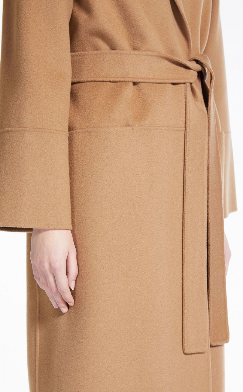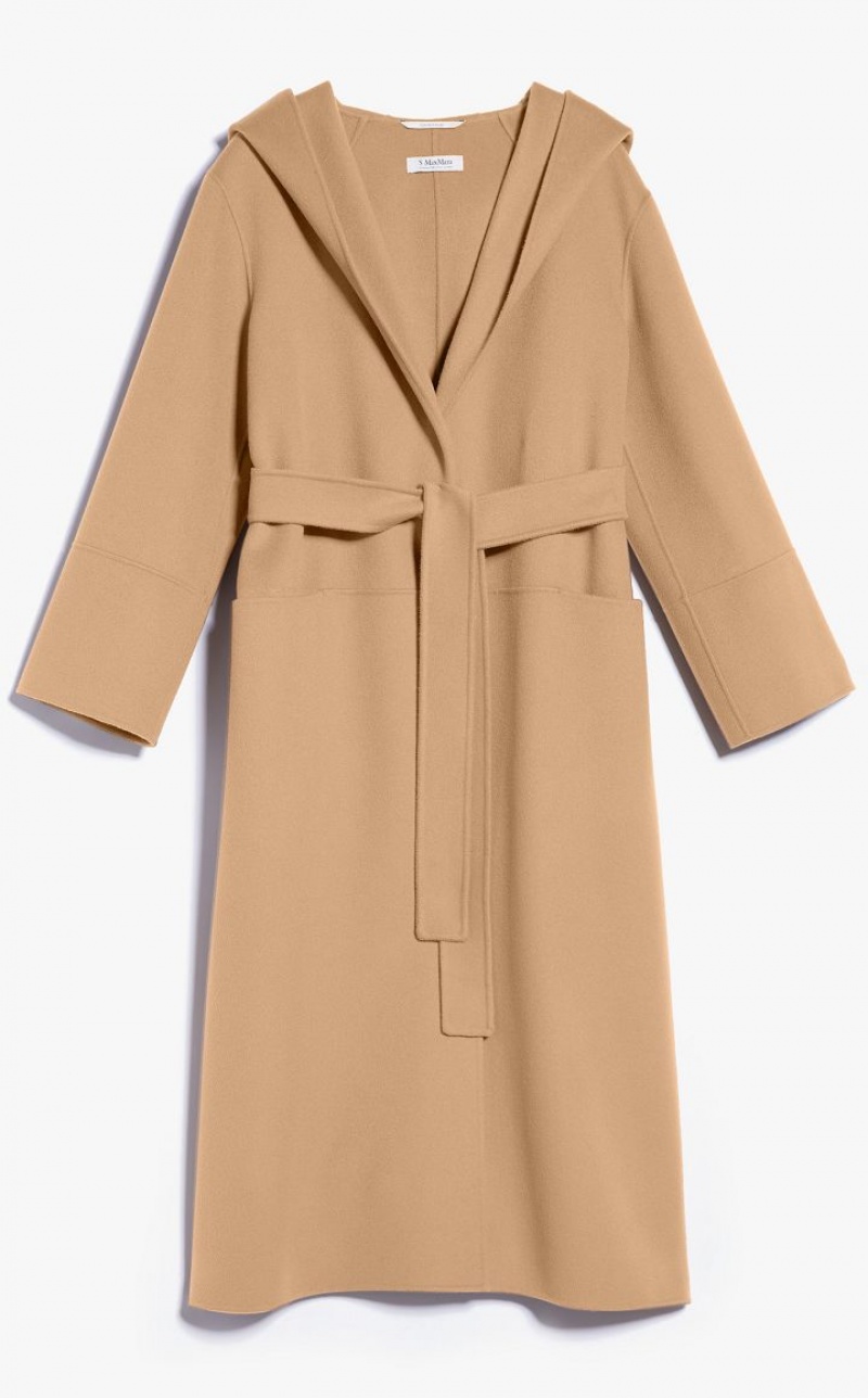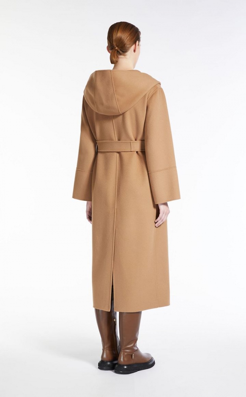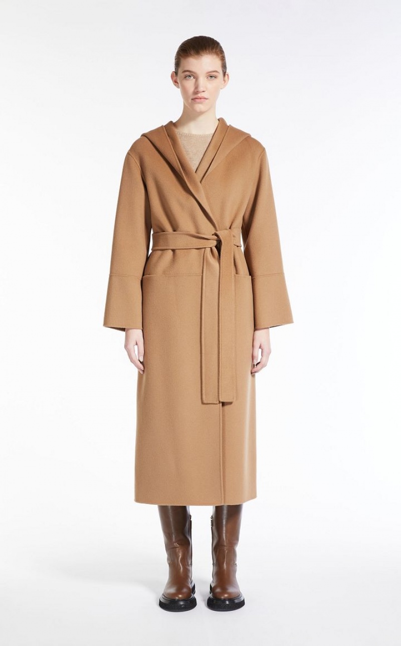 Long hooded robe coat featuring a comfort, wraparound fit. The model is made from soft hand-sewn double-faced pure wool fabric and boasts a hip-length horizontal dart, welt pockets and a central rear vent. Waistline-accentuating matching belt. Length: 126 cm.