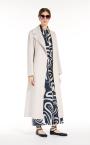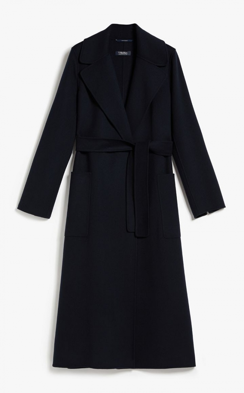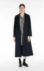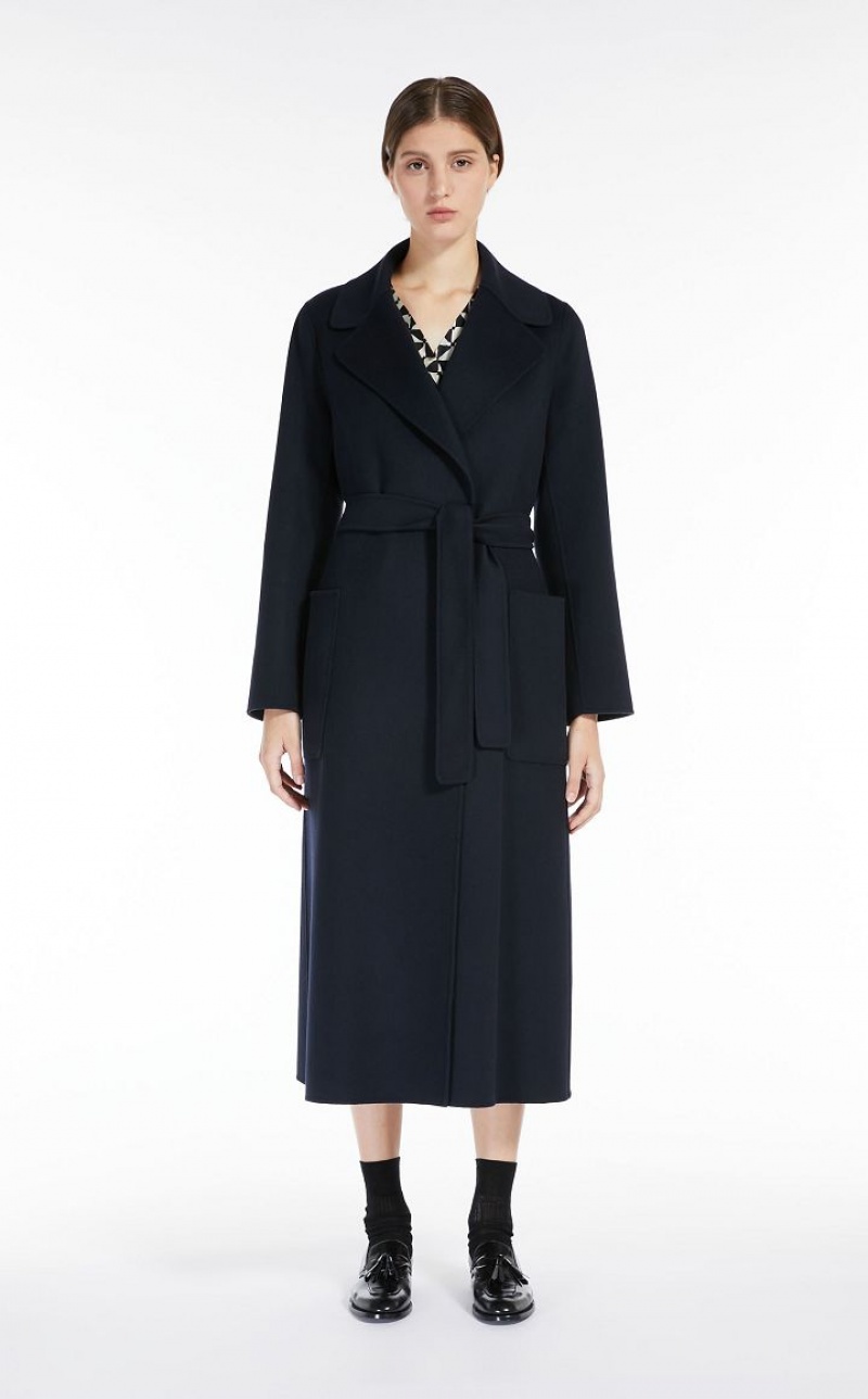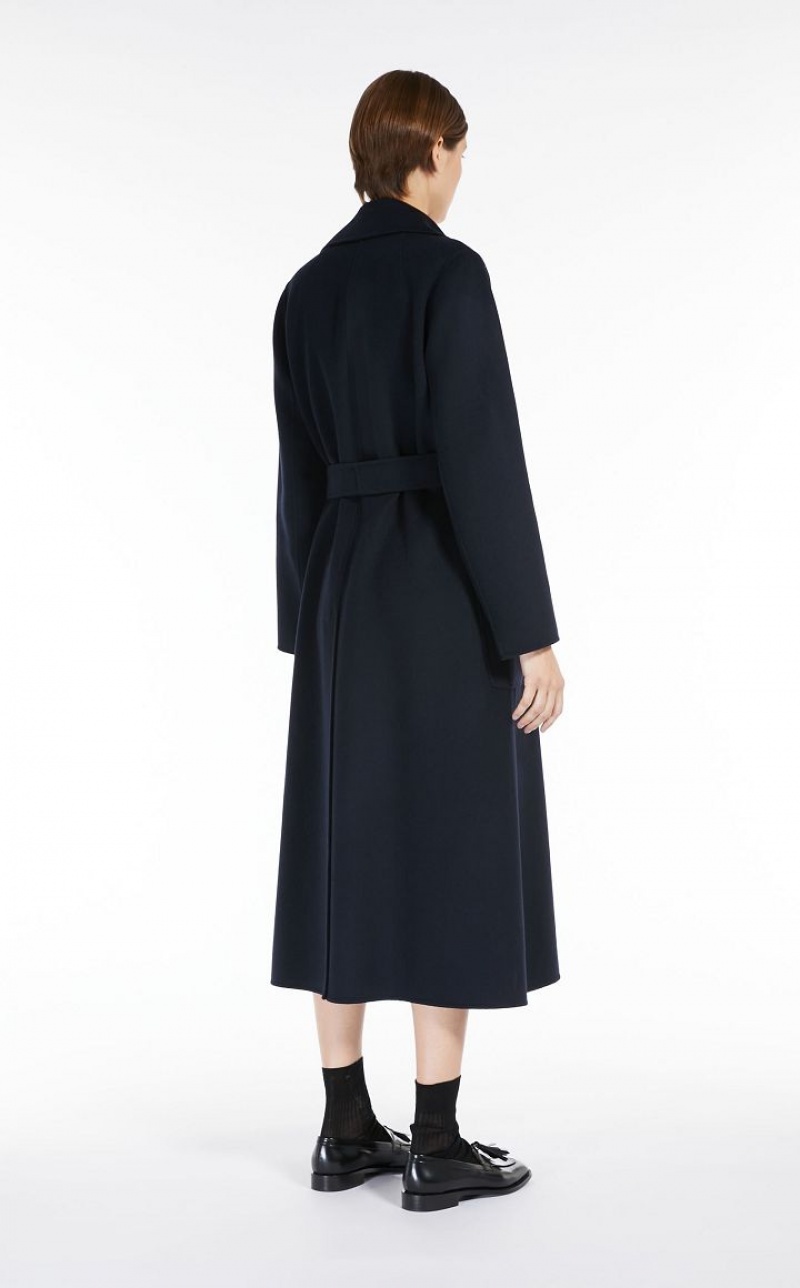 Long robe coat in fine hand-sewn double-faced pure wool fabric featuring a flared hem, lapel collar and patch pockets. Waistline-accentuating matching belt. Unlined model. Length: 124 cm.