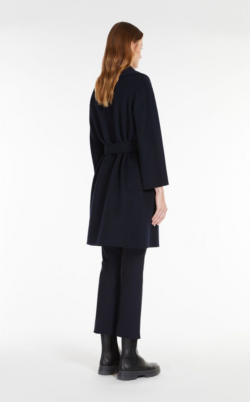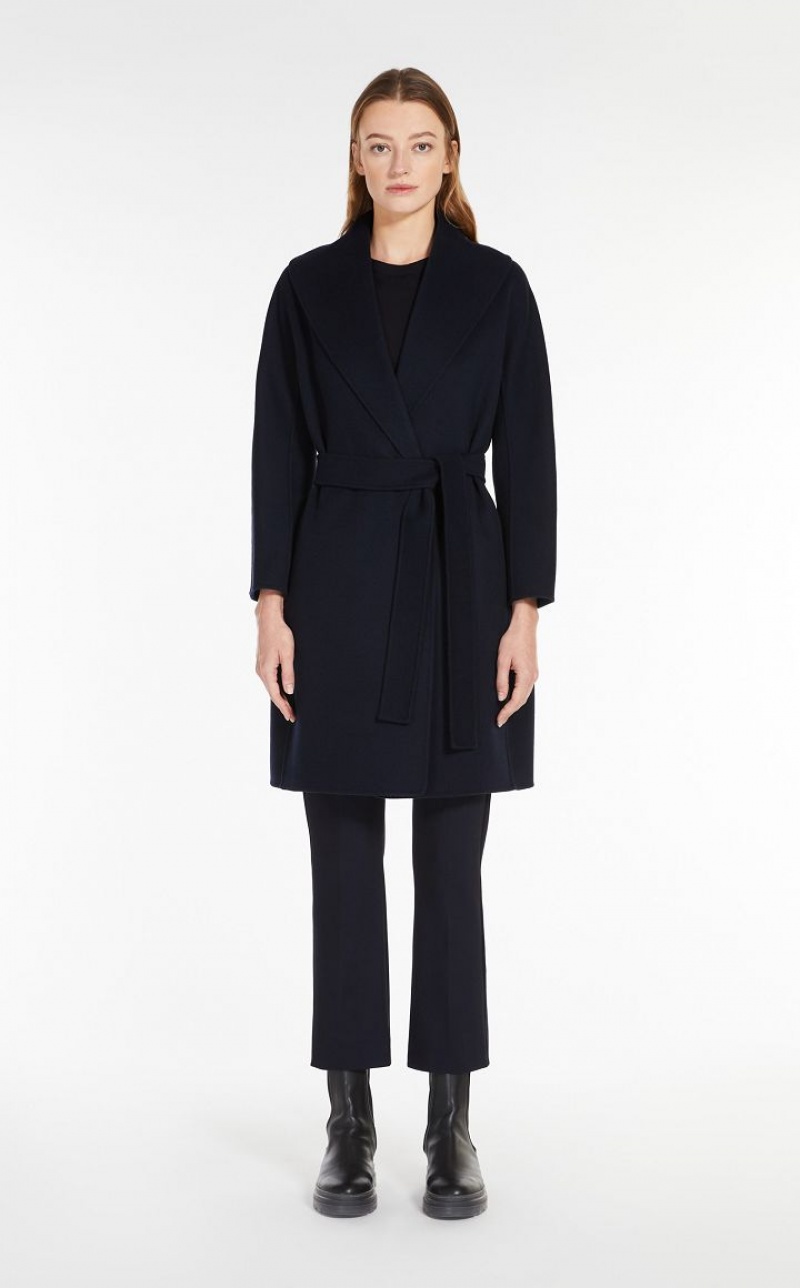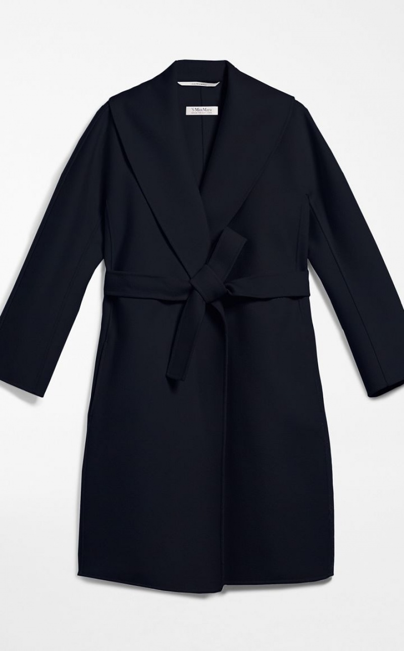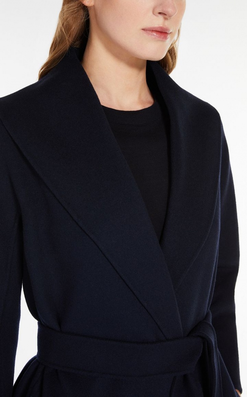 Midi robe coat in fine hand-sewn double-faced pure wool fabric featuring a wide shawl collar, long kimono sleeves and in-seam side pockets. The unlined model boasts a wraparound fit. Feminine silhouette-accentuating matching belt. Length: 93 cm.