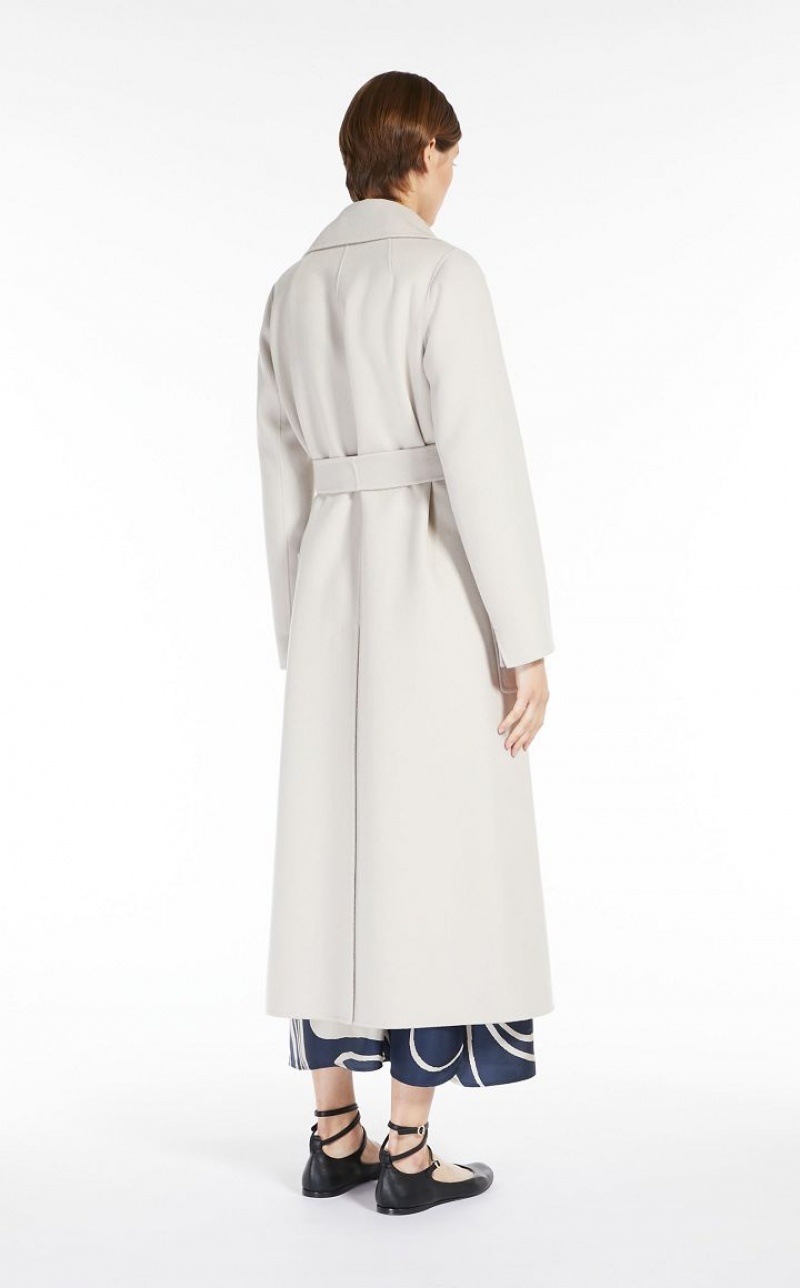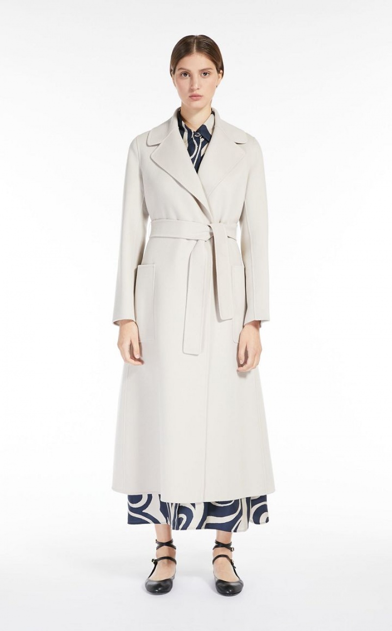 Long robe coat in fine hand-sewn double-faced pure wool fabric featuring a flared hem, lapel collar and patch pockets. Waistline-accentuating matching belt. Unlined model. Length: 124 cm.