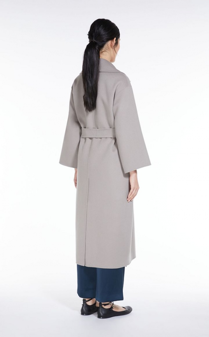 Long wrap coat made of luxurious pure double wool fabric, with rear slit. Unlined style with an enveloping fit finished with a lapel collar and welt pockets. The matching belt allows you to highlight the waist. Length 120 cm.