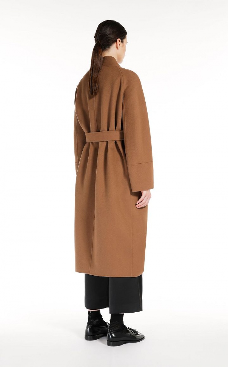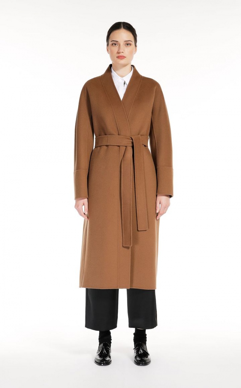 Long wrap coat made from luxurious pure hand-stitched double wool. Soft, enveloping silhouette featuring a shawl collar, long kimono sleeves and inset side pockets. Unlined. The matching belt allows you to highlight the waist. Length: 118 cm.