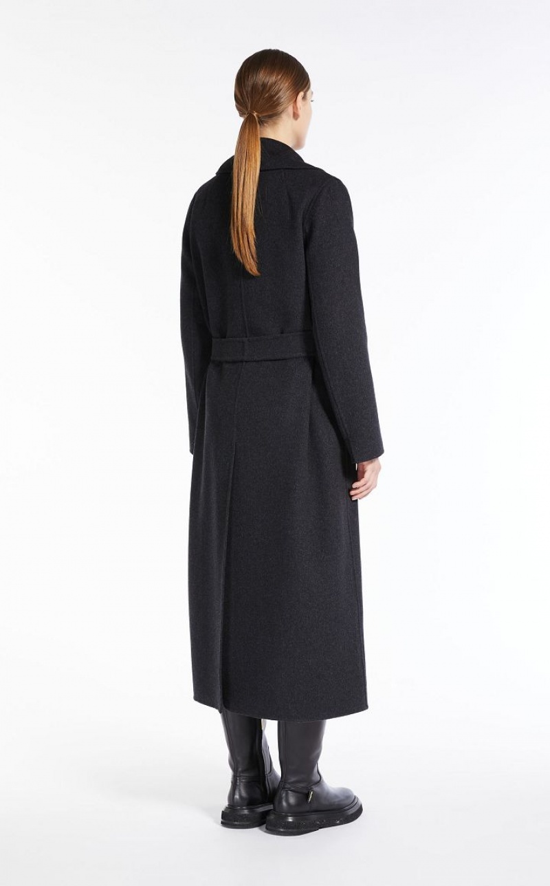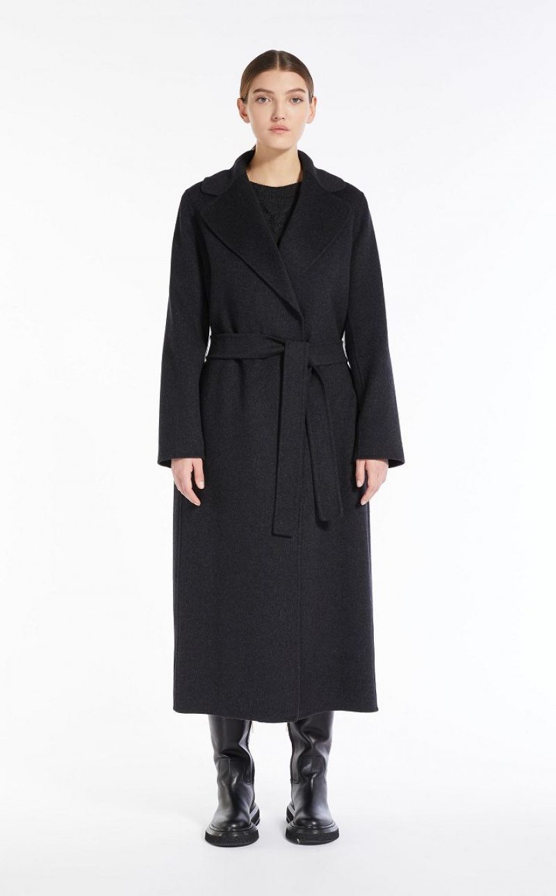 Long wrap coat with enveloping lines made from exquisite pure double wool fabric. The unlined construction features a wide lapel collar, inset side pockets and set-in sleeves. The matching belt accentuates the feminine silhouette.
