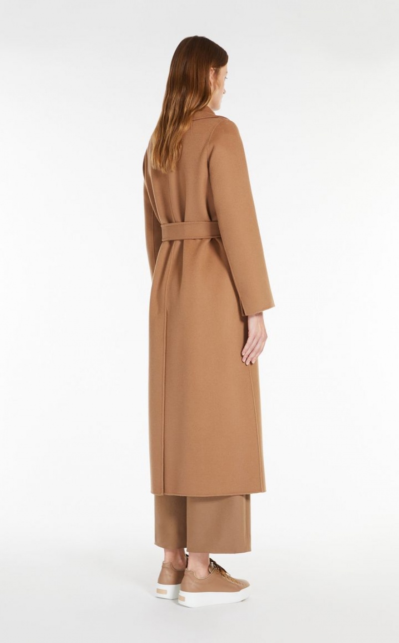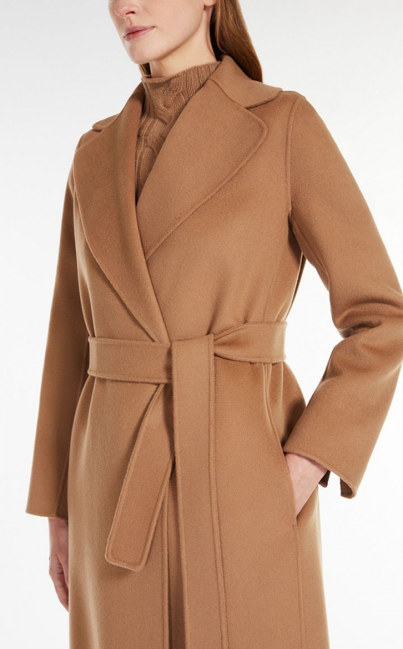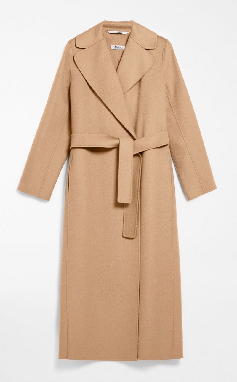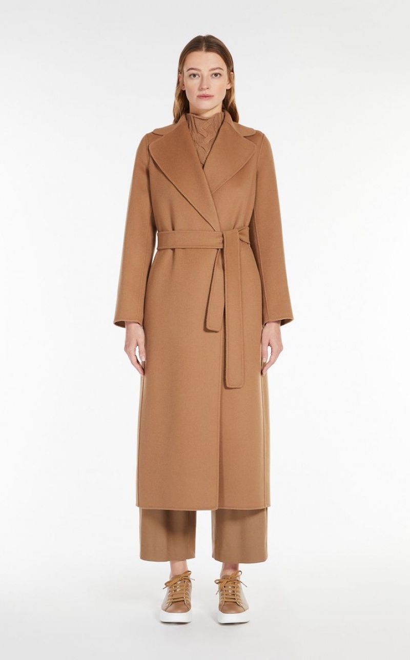Long wrap coat with enveloping lines made from exquisite pure double wool fabric. The unlined construction features a wide lapel collar, inset side pockets and set-in sleeves. The matching belt accentuates the feminine silhouette.
