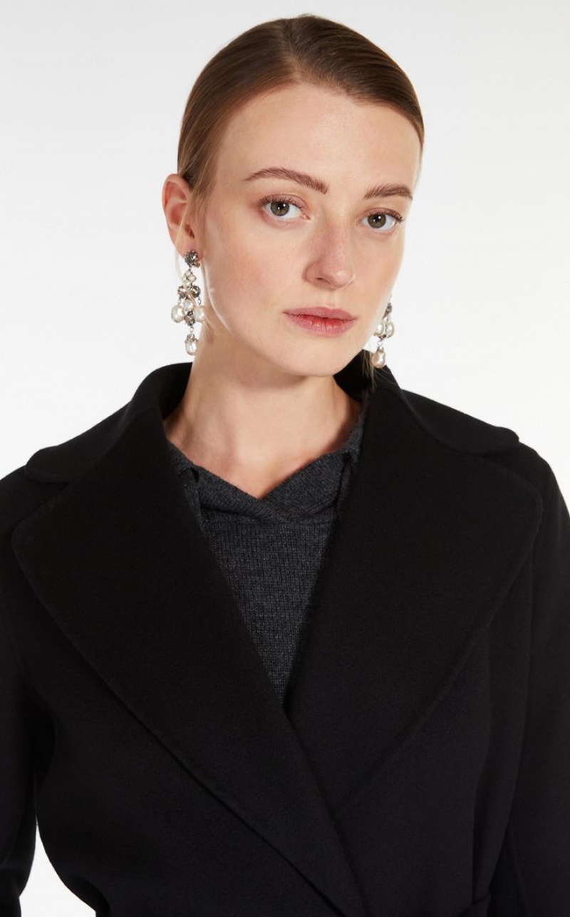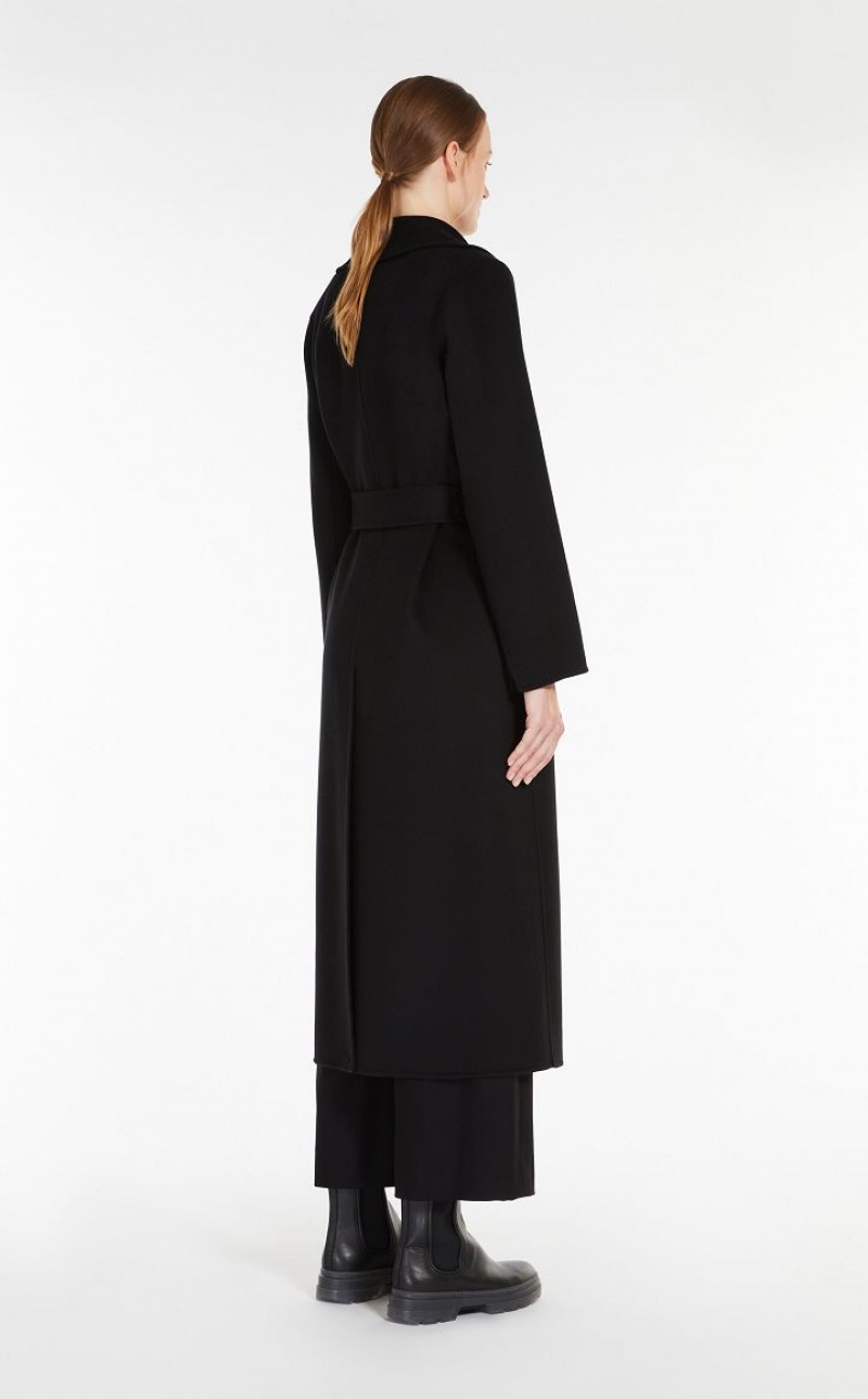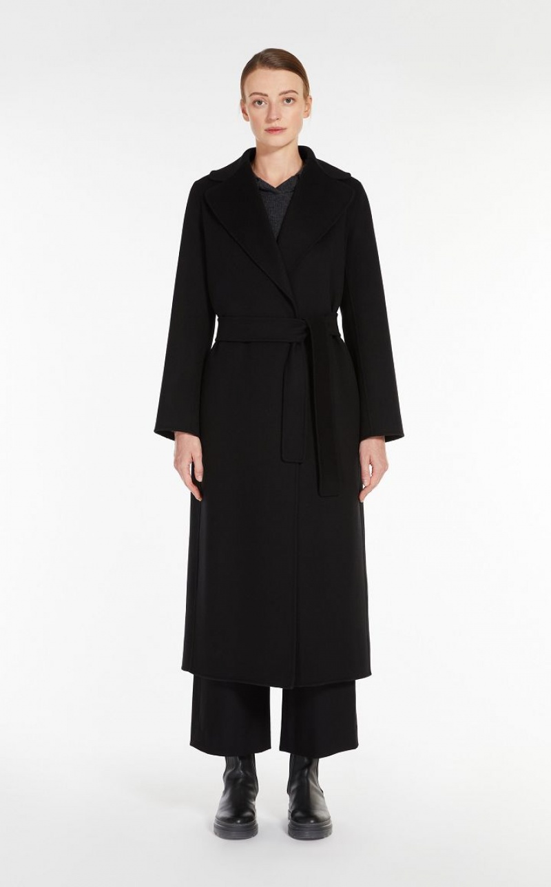 Long wrap coat with enveloping lines made from exquisite pure double wool fabric. The unlined construction features a wide lapel collar, inset side pockets and set-in sleeves. The matching belt accentuates the feminine silhouette.