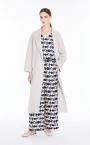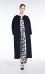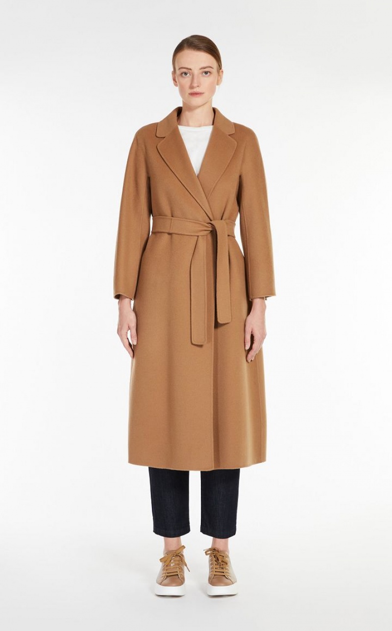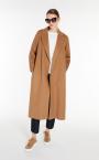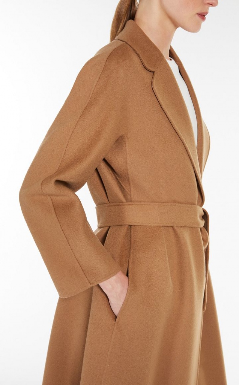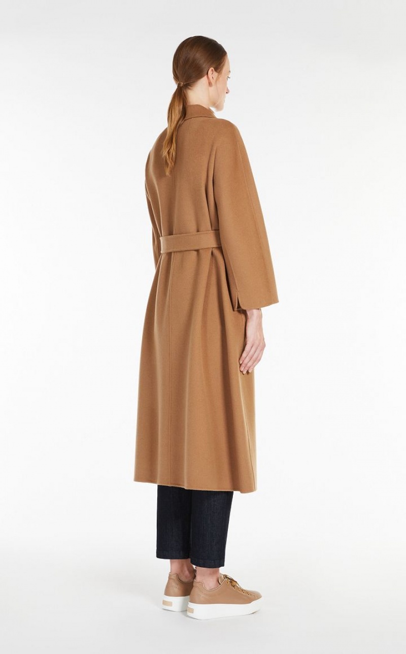 Long robe coat in fine hand-sewn double-faced pure wool fabric featuring a straight silhouette that flares slightly at the hem. The unlined model boasts a lapel collar, kimono sleeves and in-seam side pockets. Waistline-accentuating matching belt. Length: 115 cm.