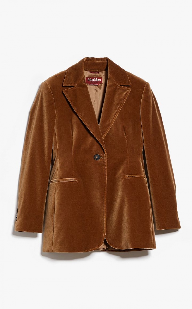 Single-breasted fitted blazer in cotton velvet with lapel collar, set-in sleeves, welt pockets on the front and central vent on the back. One-button closure. Length: 74 cm.