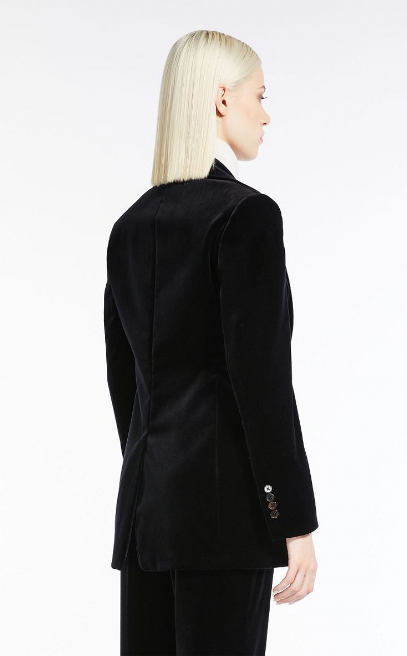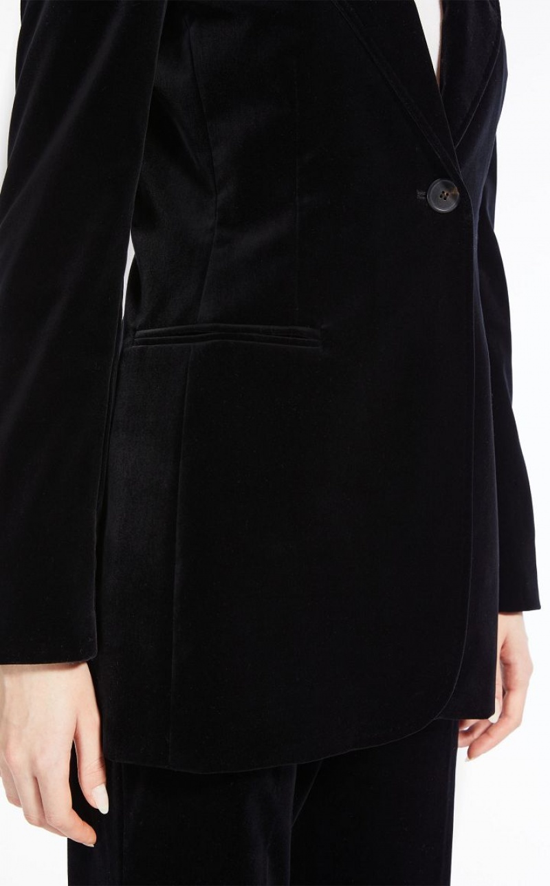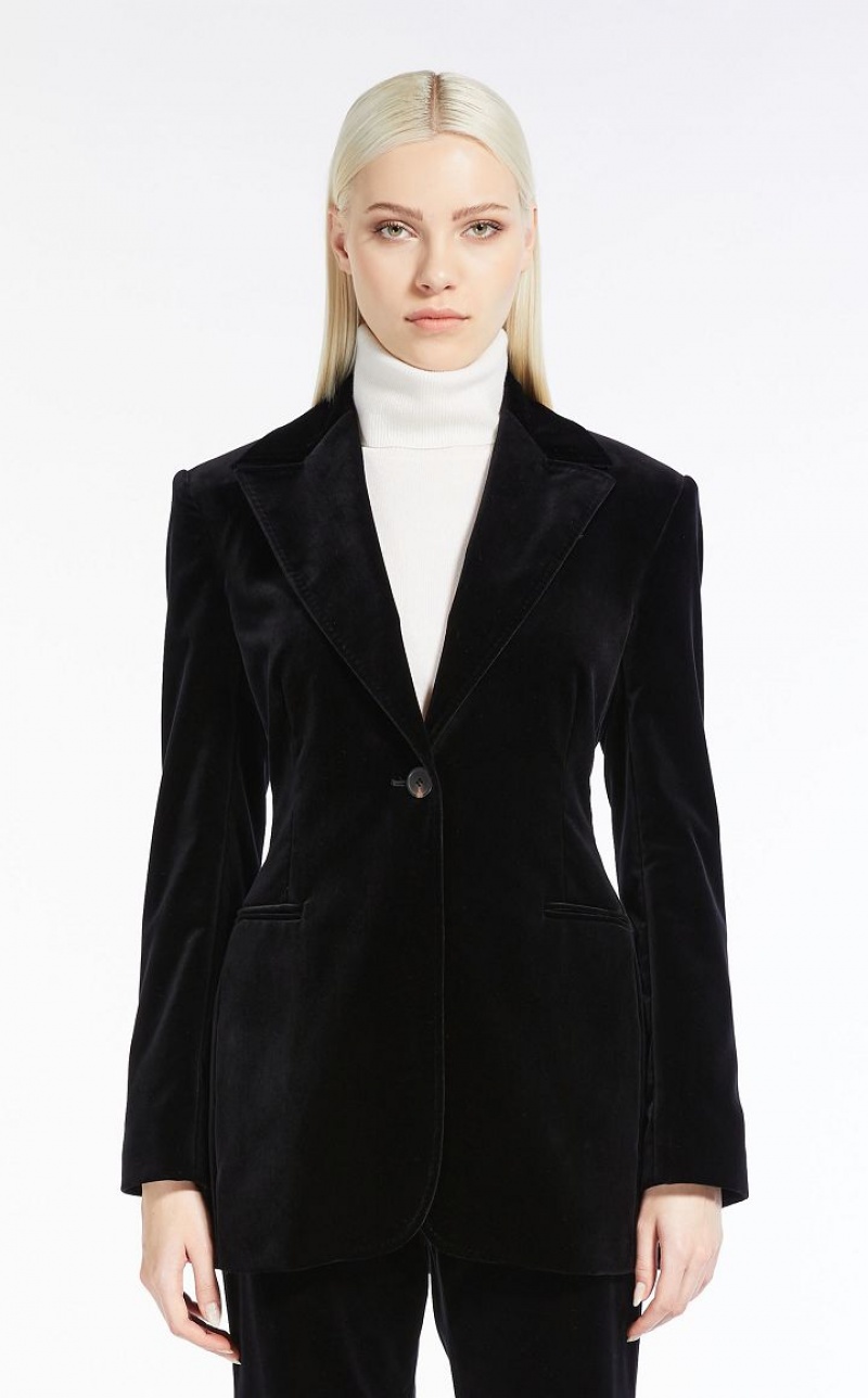 Single-breasted fitted blazer in cotton velvet with lapel collar, set-in sleeves, welt pockets on the front and central vent on the back. One-button closure. Length: 74 cm.