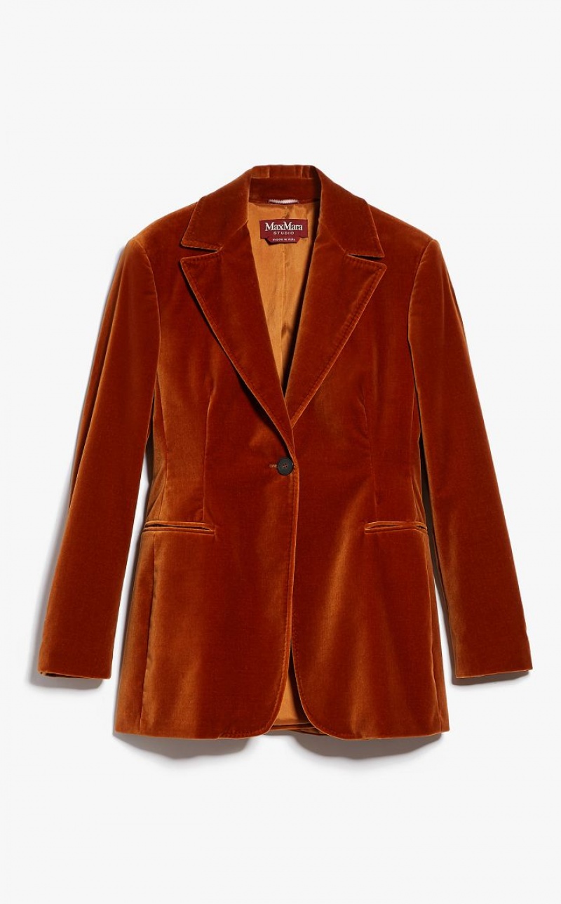 Single-breasted fitted blazer in cotton velvet with lapel collar, set-in sleeves, welt pockets on the front and central vent on the back. One-button closure. Length: 74 cm.