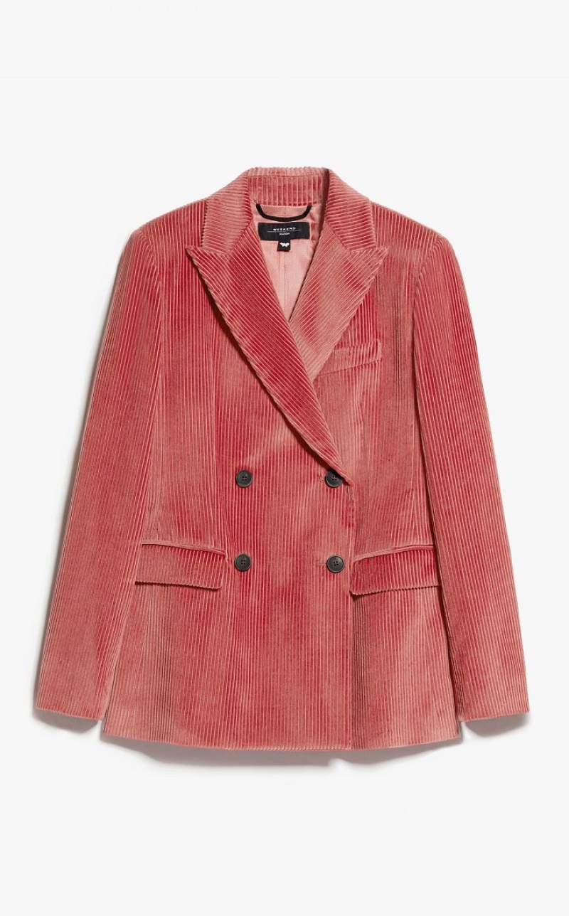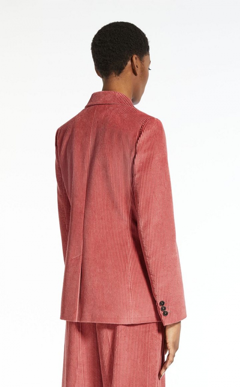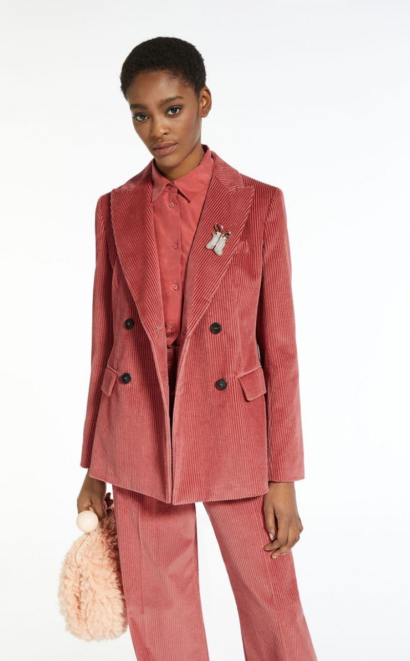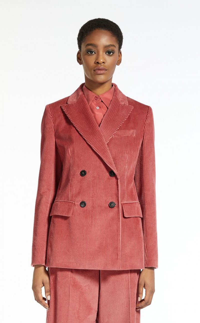 Pure cotton velvet blazer featuring peak lapels, long set in sleeves, a breast pocket, flap adorned welt pockets and rear vent detail. The rib knit pattern enhances the garment's texture, whilst the fitted waist bestows a touch of femininity. Double breasted button fastening. Length: 68 cm. Lined interior.