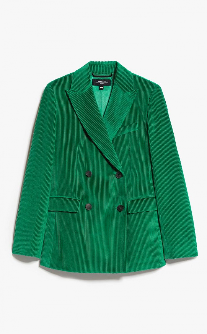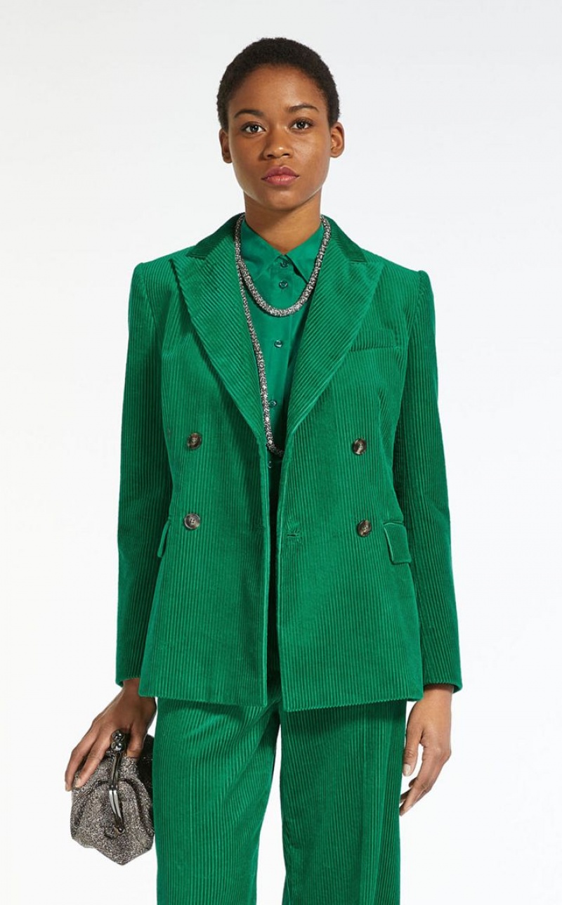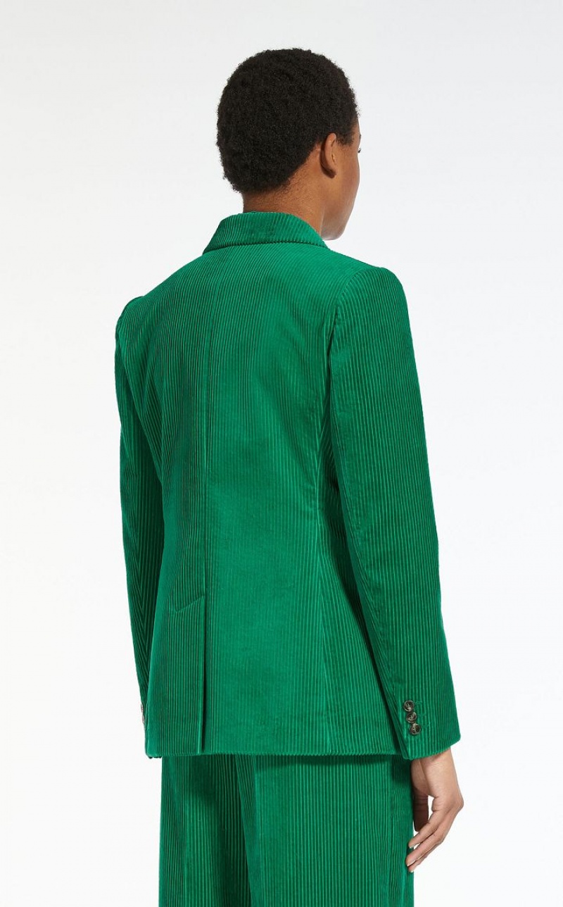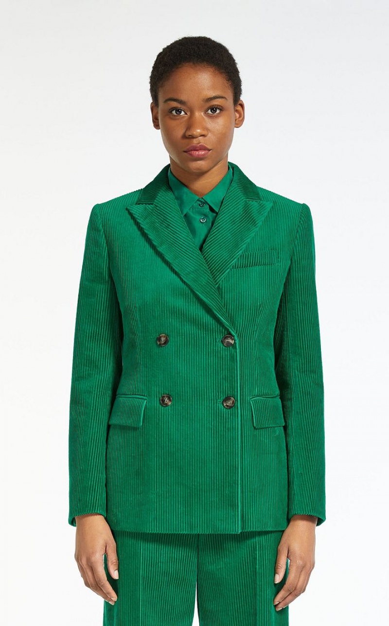 Pure cotton velvet blazer featuring peak lapels, long set in sleeves, a breast pocket, flap adorned welt pockets and rear vent detail. The rib knit pattern enhances the garment's texture, whilst the fitted waist bestows a touch of femininity. Double breasted button fastening. Length: 68 cm. Lined interior.