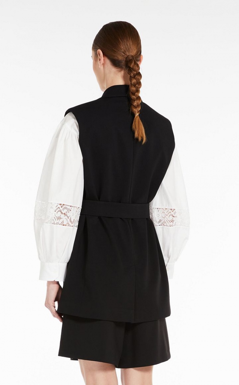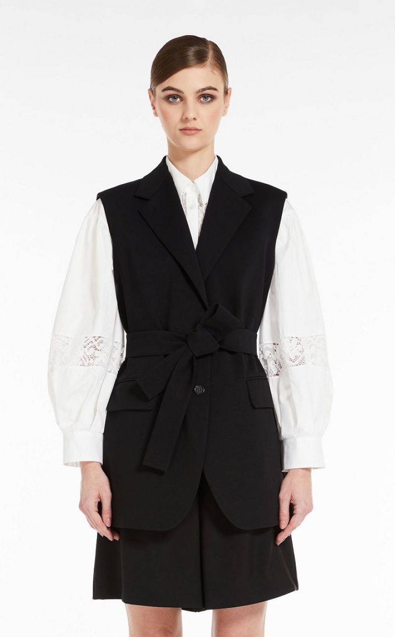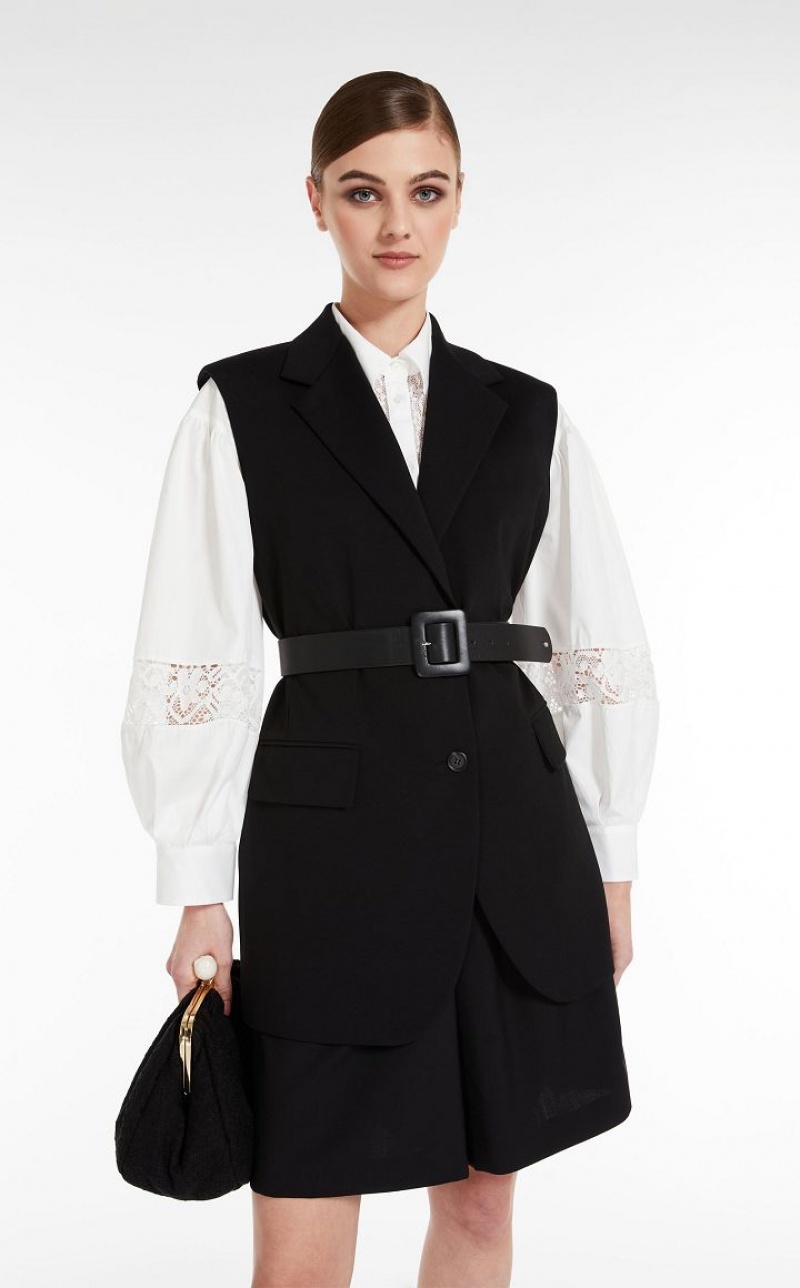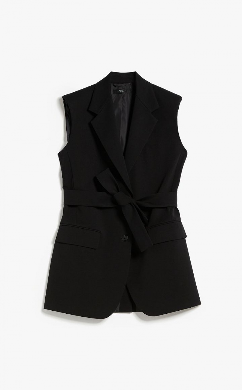Sleeveless blazer in soft cotton blend jersey. Half-lined style with a straight cut and slightly oversized masculine fit. Featuring a lapel collar, breast pocket, flap pockets on the front and central vent at the back. Fastening with buttons and matching belt to emphasise the waistline. Length: 76 cm.