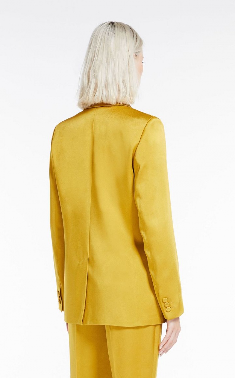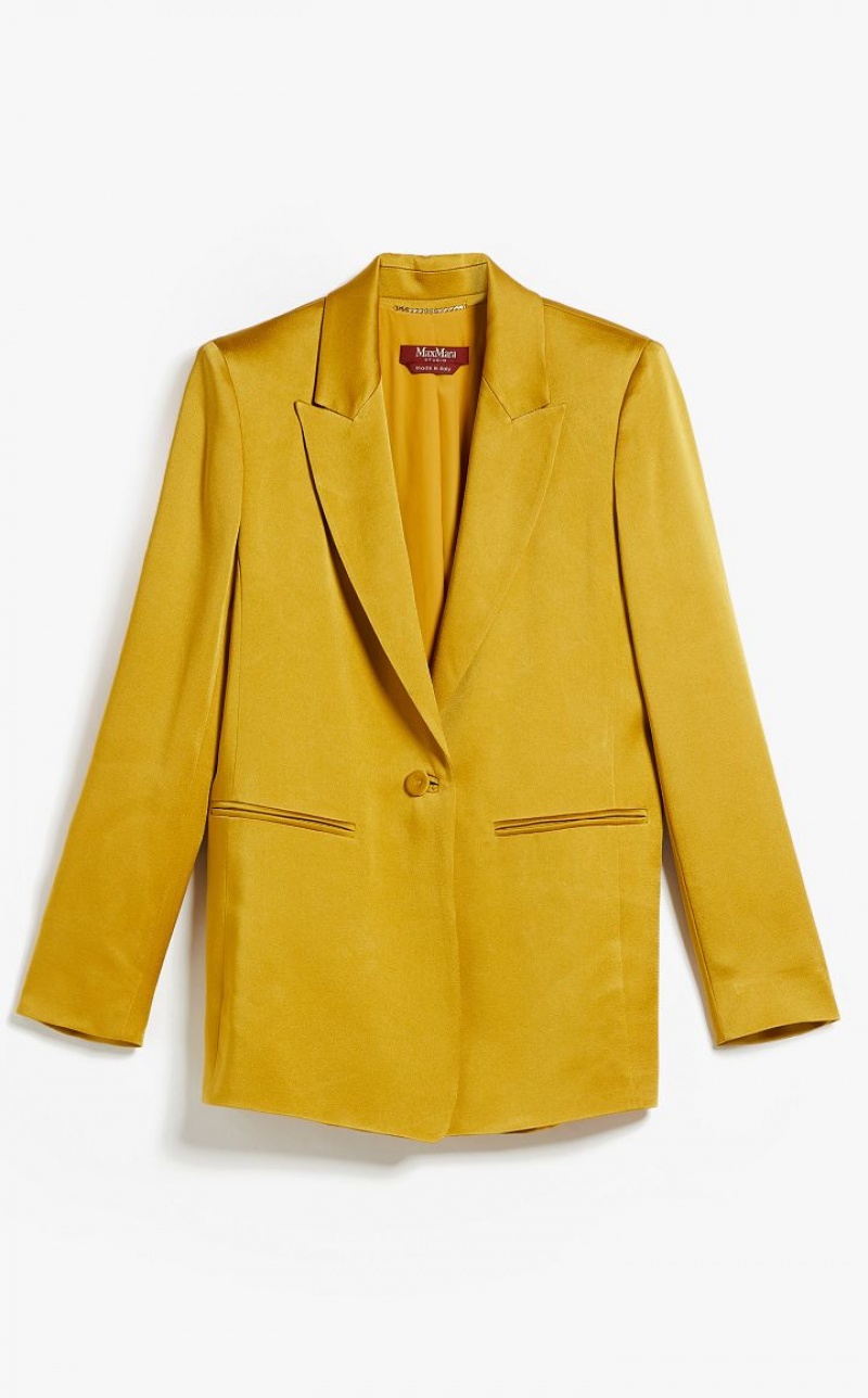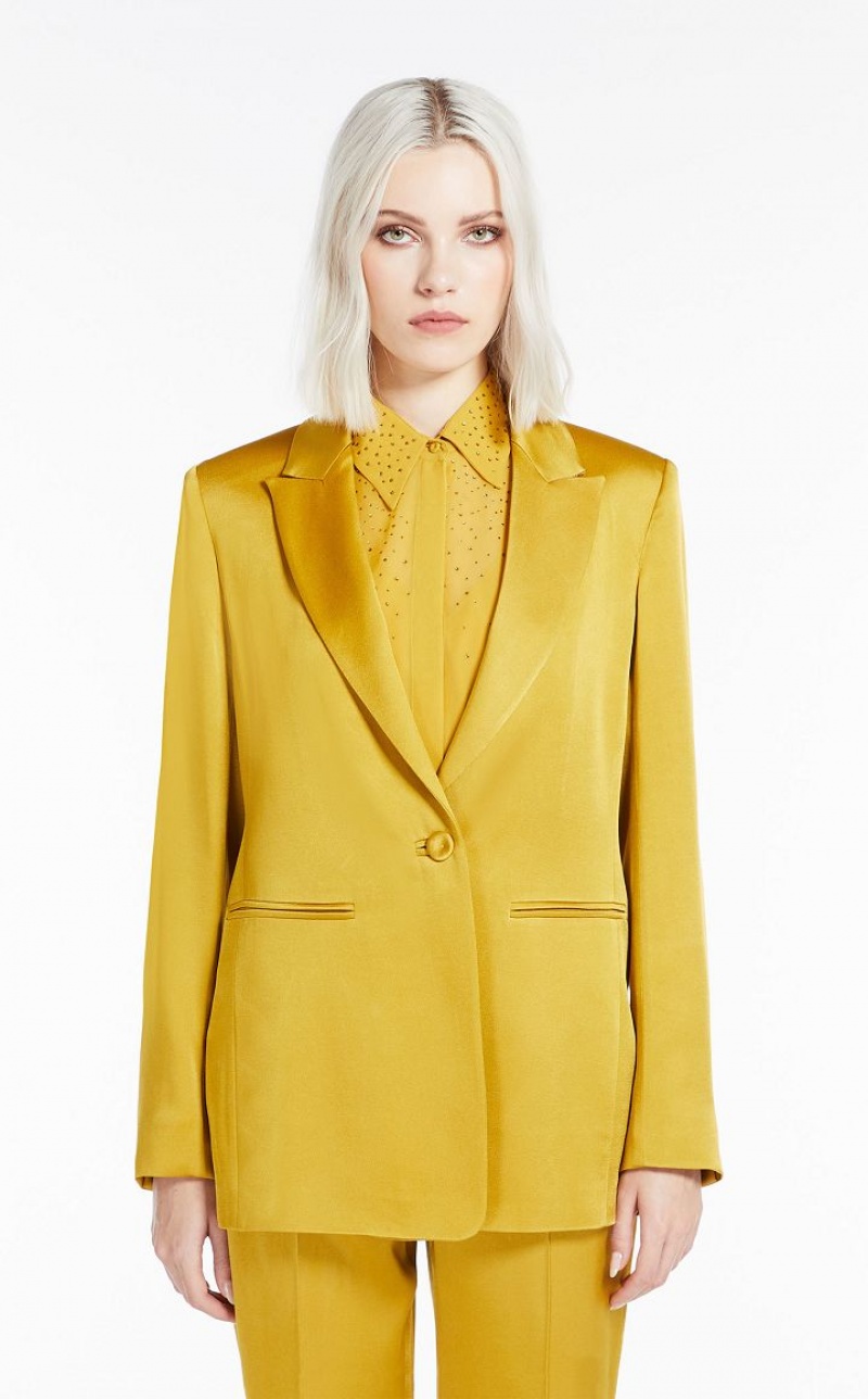Figure-skimming single-breasted blazer in fine shiny crepe envers satin fabric featuring a peak-lapel collar, long set-in sleeves and welt pockets. Lined model. One-button fastening. Length: 70 cm.