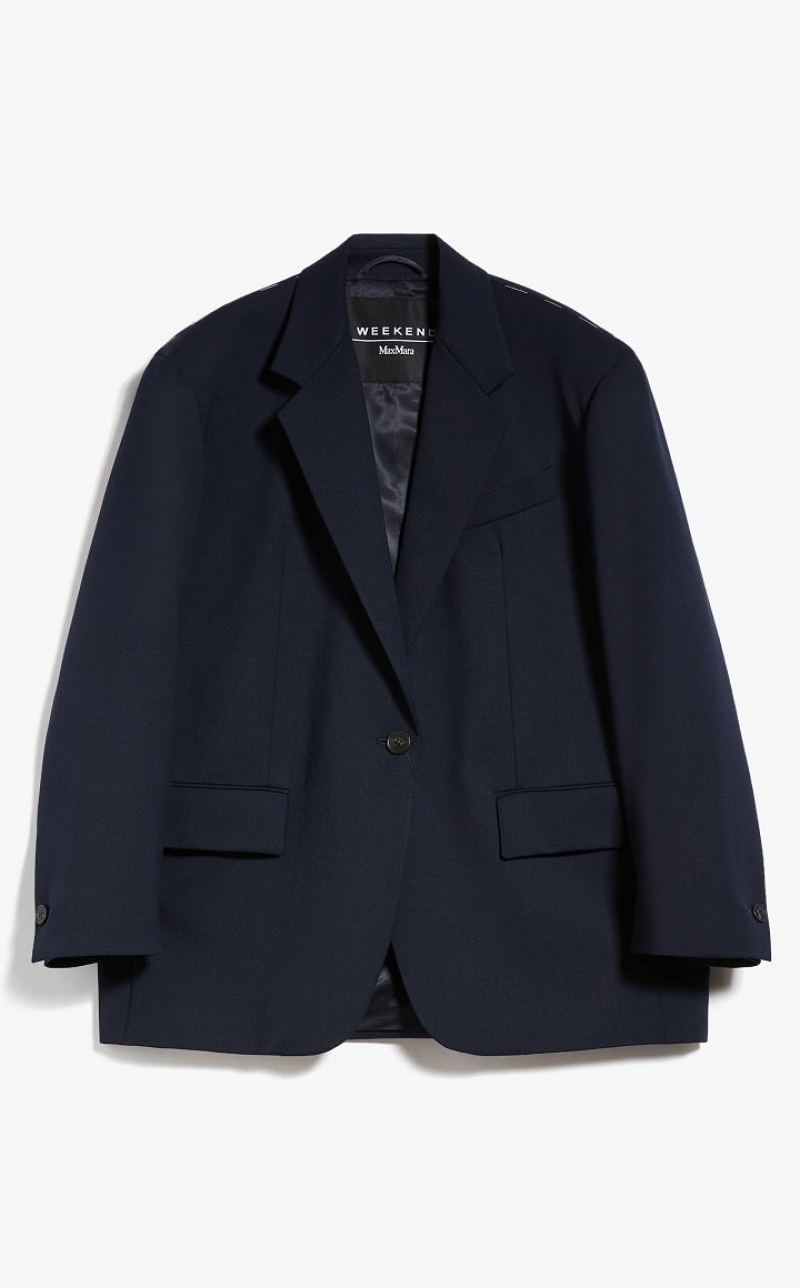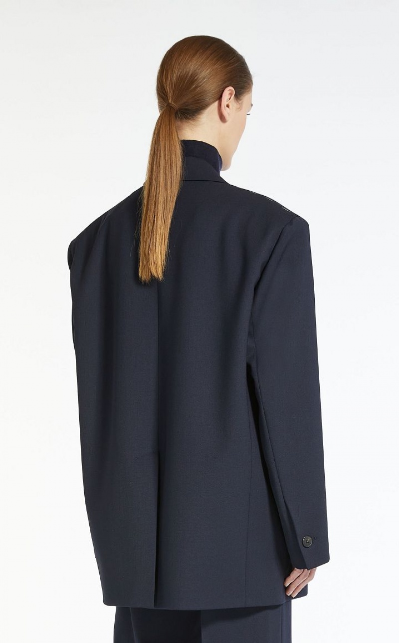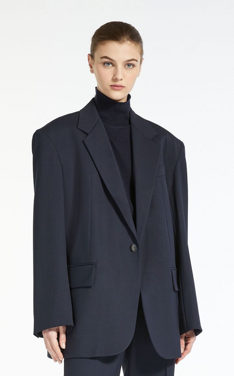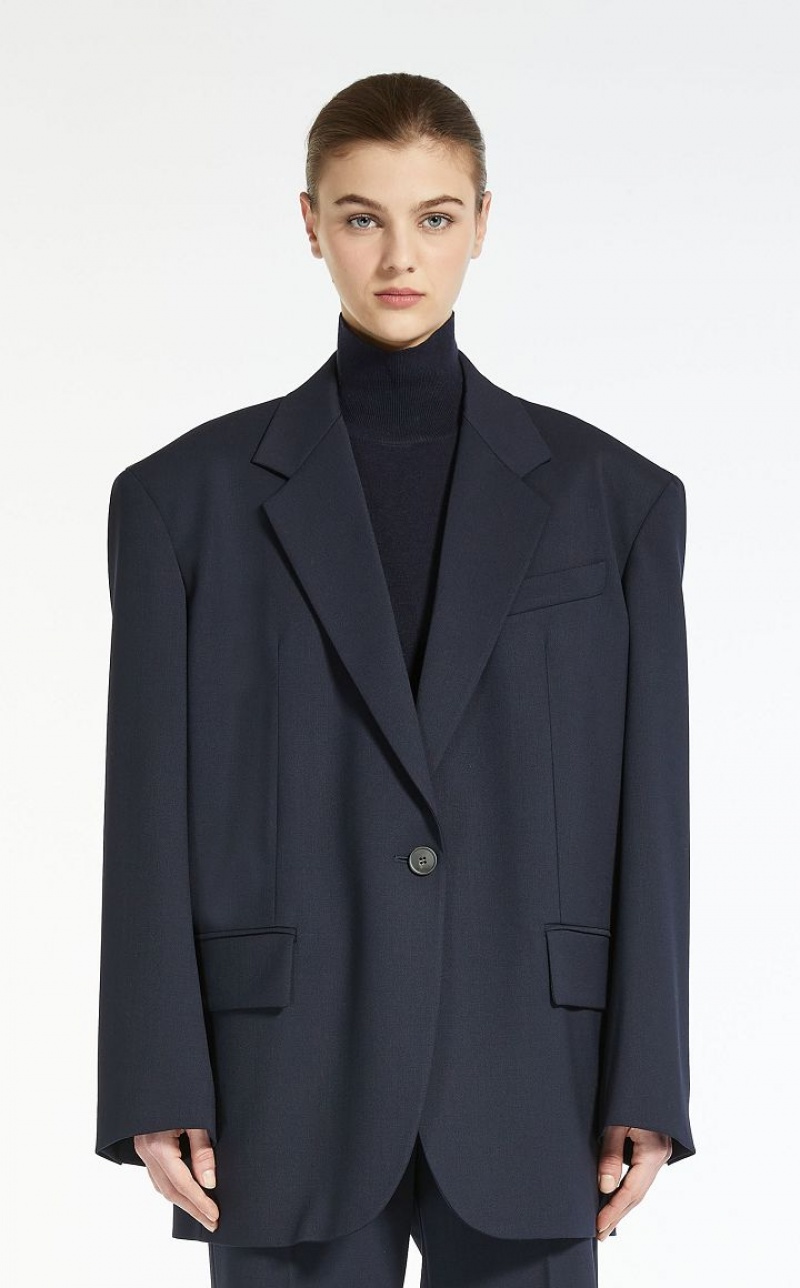 Boyfriend style blazer in wool blend gabardine fabric. Lapel collar, breast pocket, flap pockets and long sleeves with oversized shoulder detail. Single breasted front fastening. Lined interior.