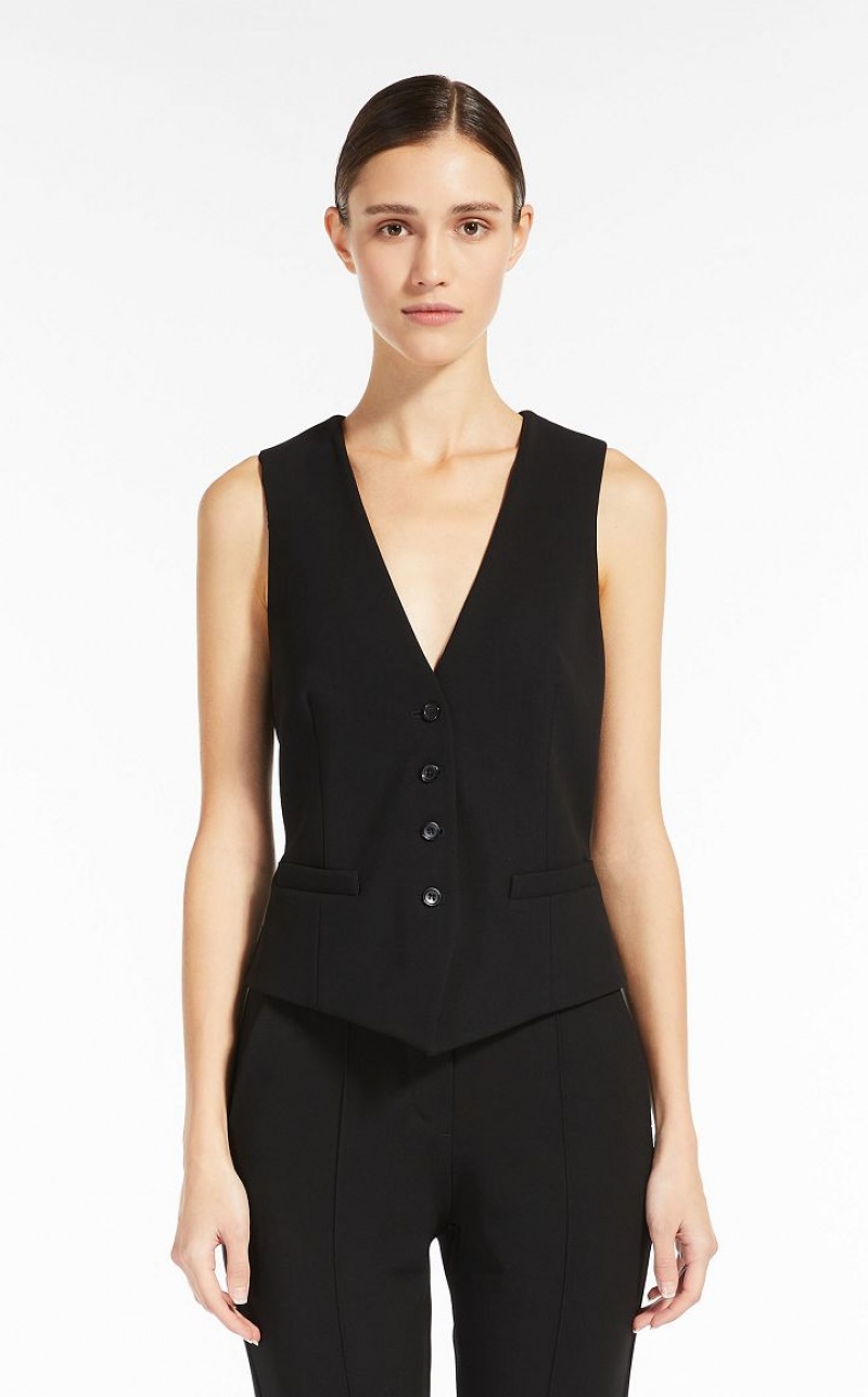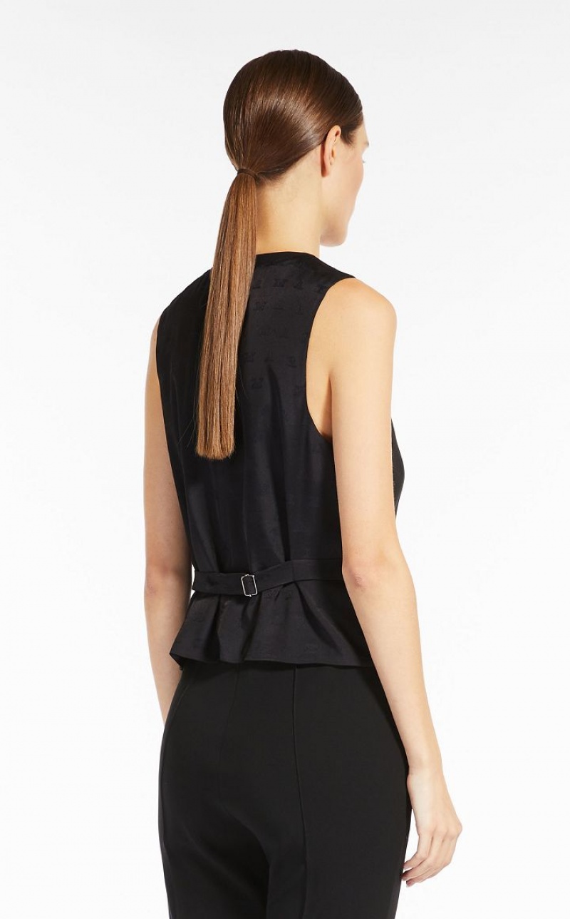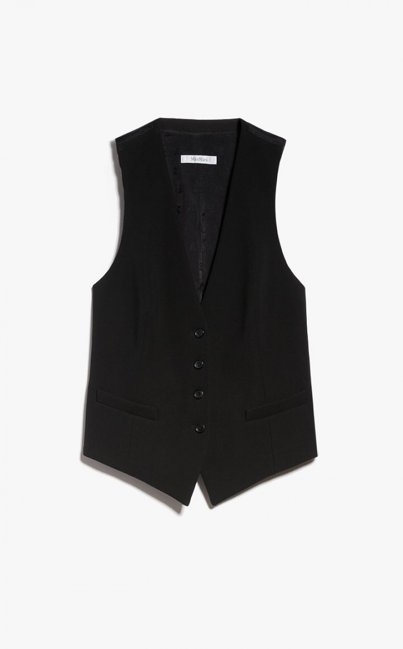 Short masculine-inspired gilet made of soft viscose, with V neck and front welt pockets. The model features a stretch fabric logo insert on the back, a strap and metallic gilet buckle. Front fastening with horn buttons. Length: 51 cm.