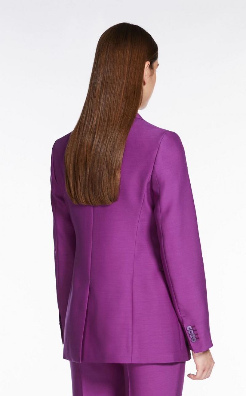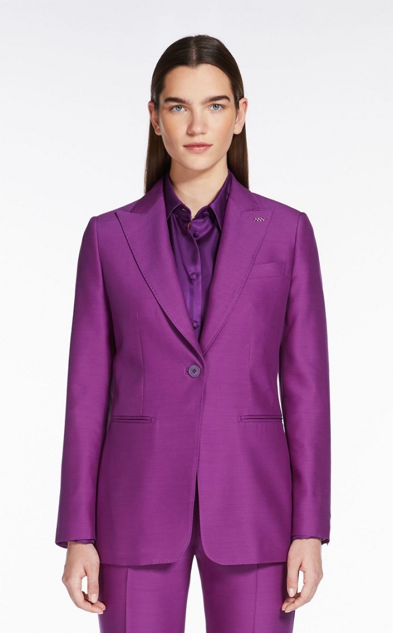 Single breasted blazer in wool and silk double fabric with a compact, soft feel. The full canvas construction features peak lapels, a masculine breast pocket and horizontal double welt pockets. Embellished with tailored pick stitch , an internal pocket and central vent on the back. Semi lined in stretch cupro fabric in a contrasting colour. Matching colour one button fastening. Length: 70 cm.