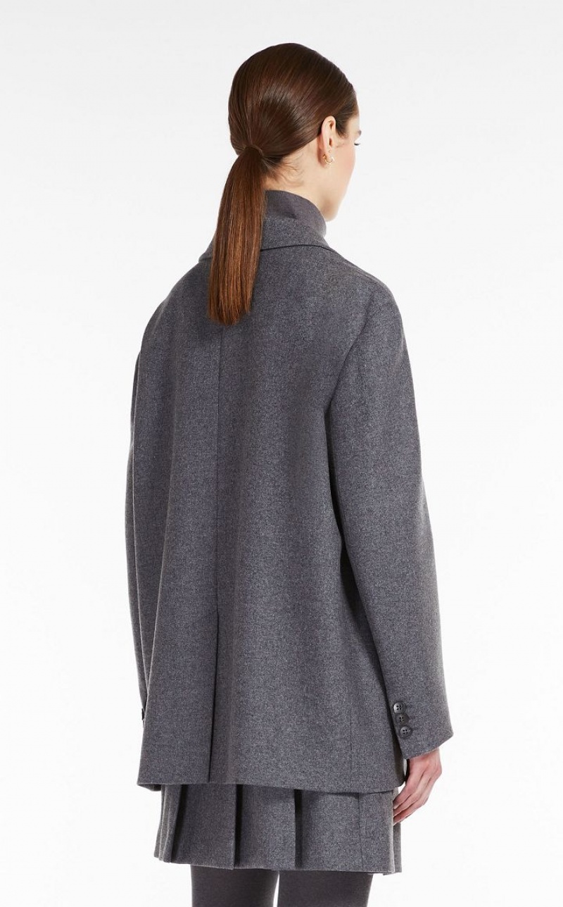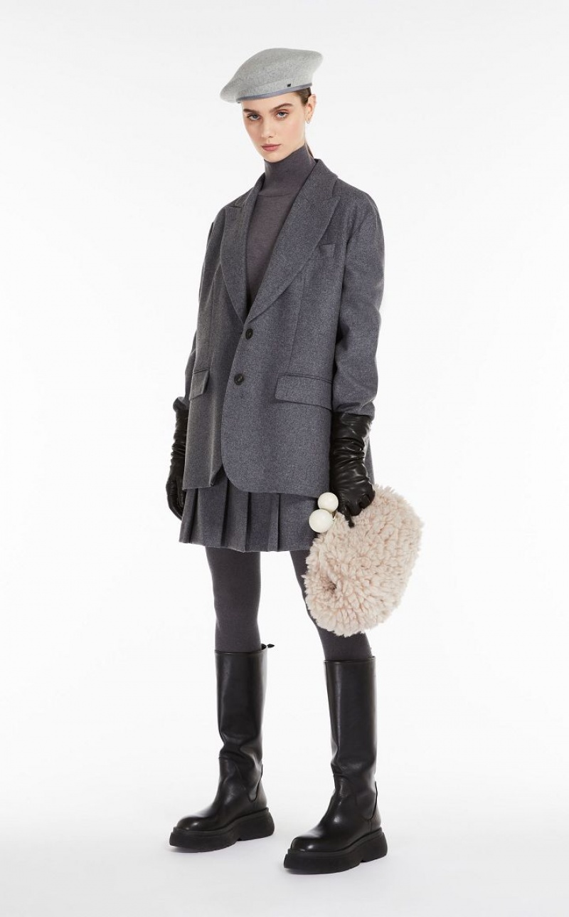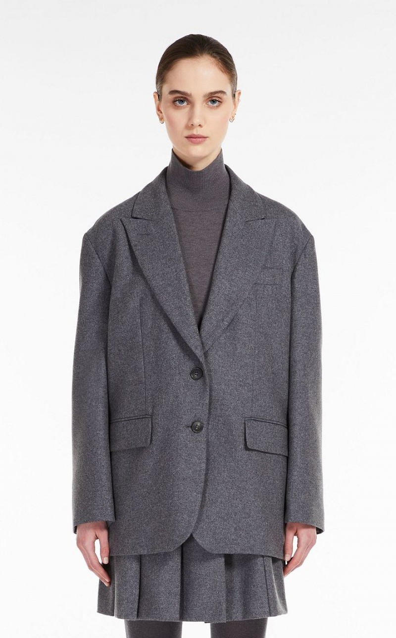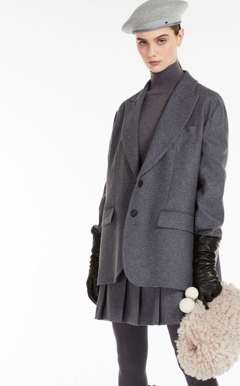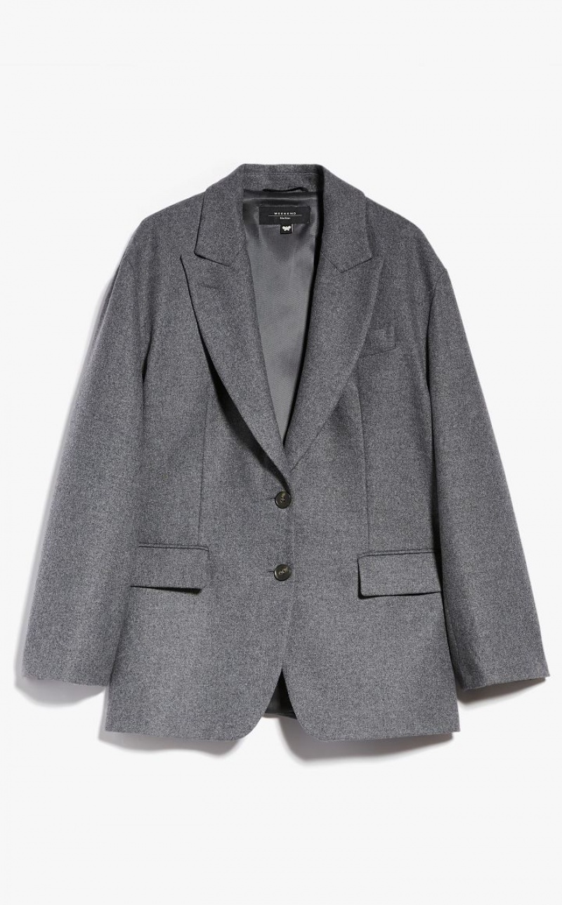 Boyfriend style blazer in wool flannel fabric. Lapels, a breast pocket, flap pockets and long sleeves with oversized shoulder detail. Single breasted two button fastening. Length: 72 cm. Lined interior.