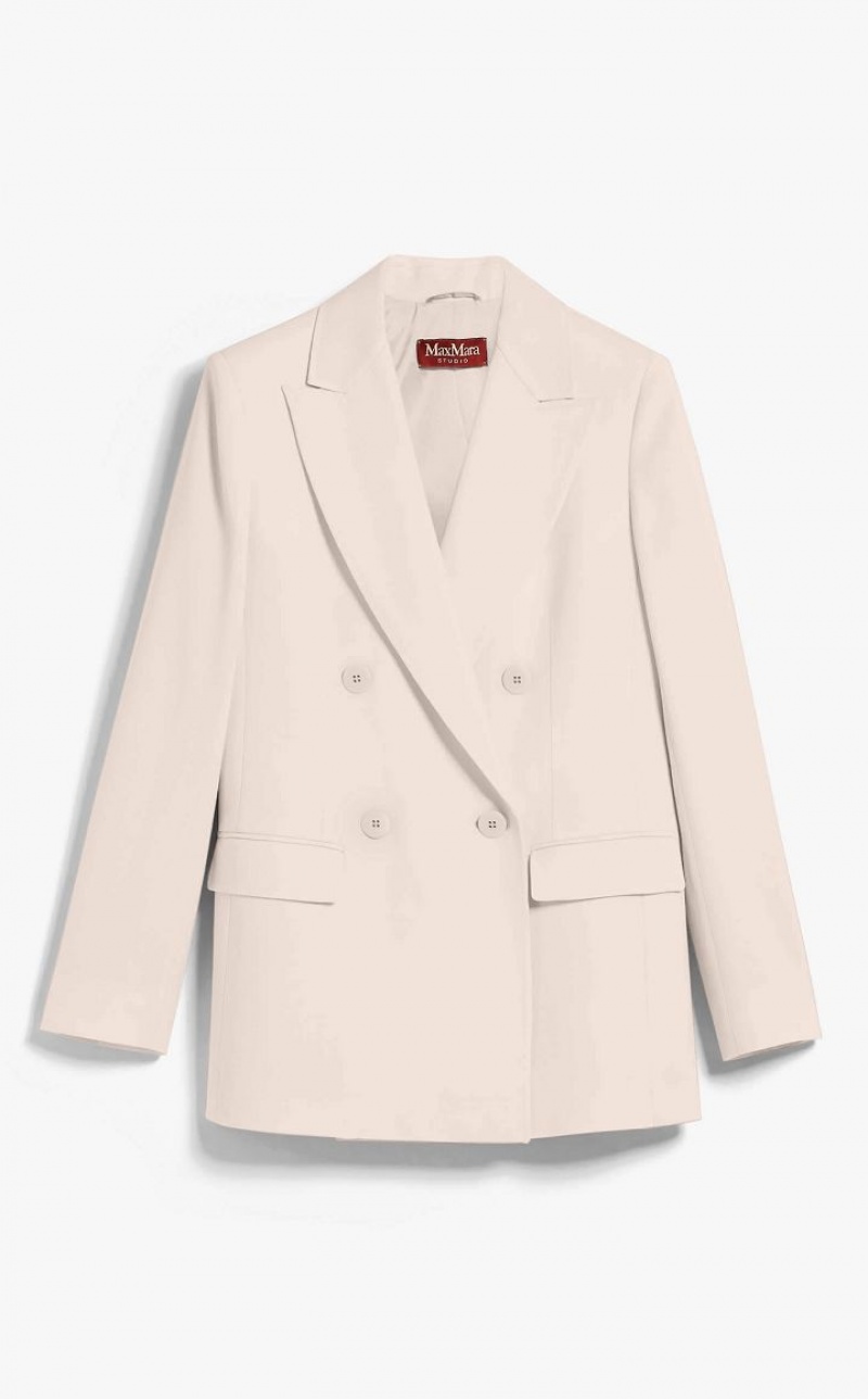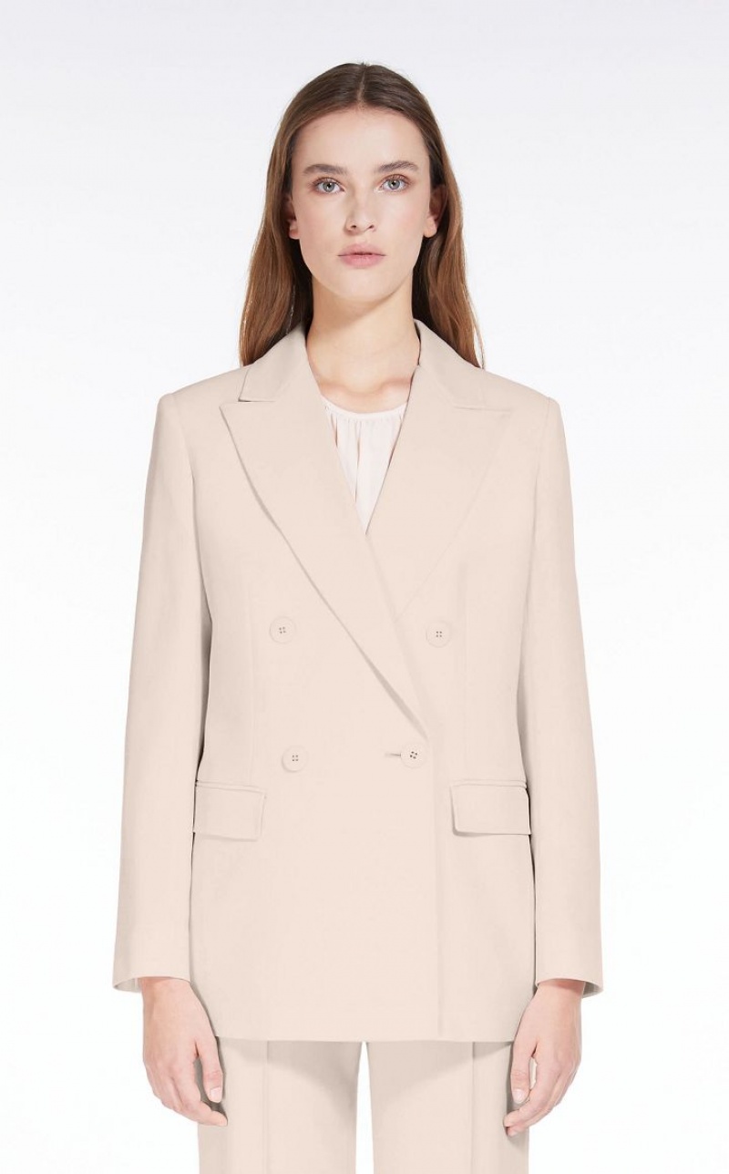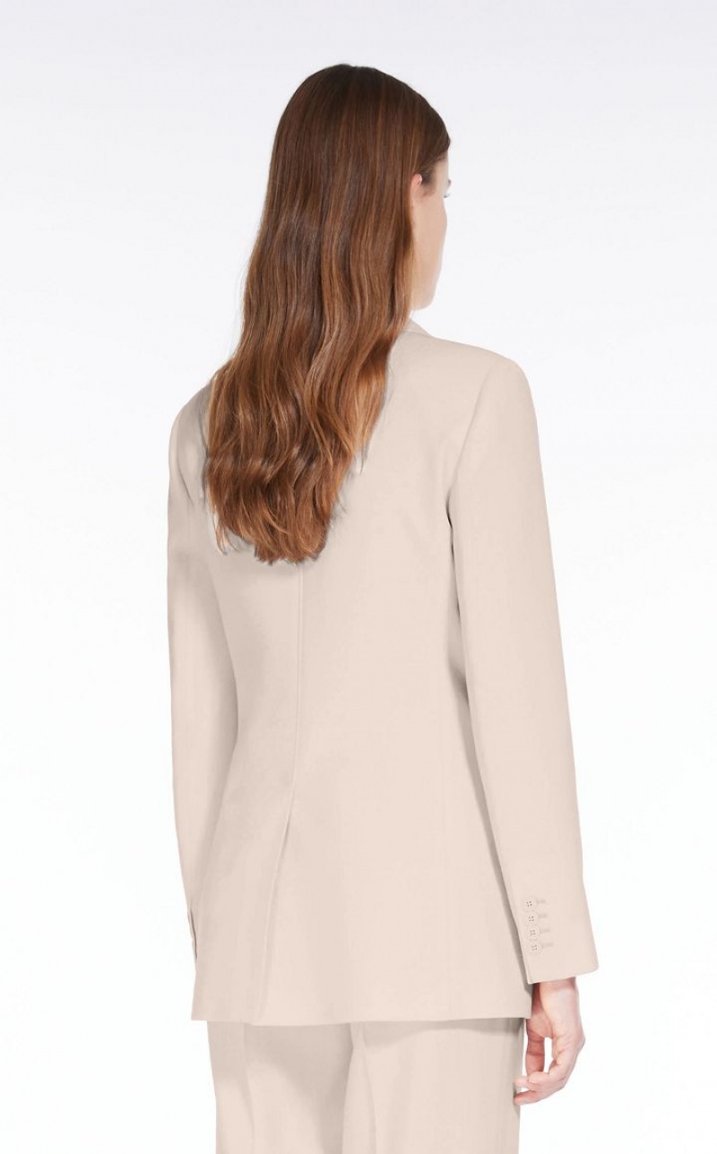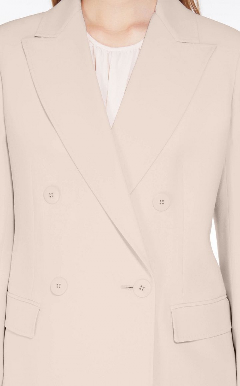 Double-breasted long blazer in comfortable fine wool satin crepe fabric. The model boasts a peak-lapel collar, long set-in sleeves and flap pockets. Lined model. Button fastening. Length: 68 cm.