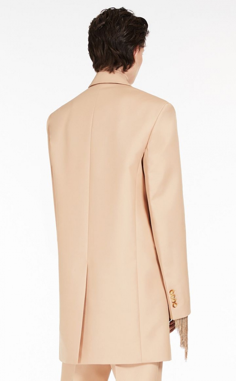 Oversized long blazer in heavy technical twill fabric featuring a boyfriend-inspired cut. The model boasts a straight-fit bodice, subtle darts and side panels, a low-cut fastening and flap-adorned double-welt pockets. The fully lined model is embellished with a Melton undercollar. Length: 92 cm