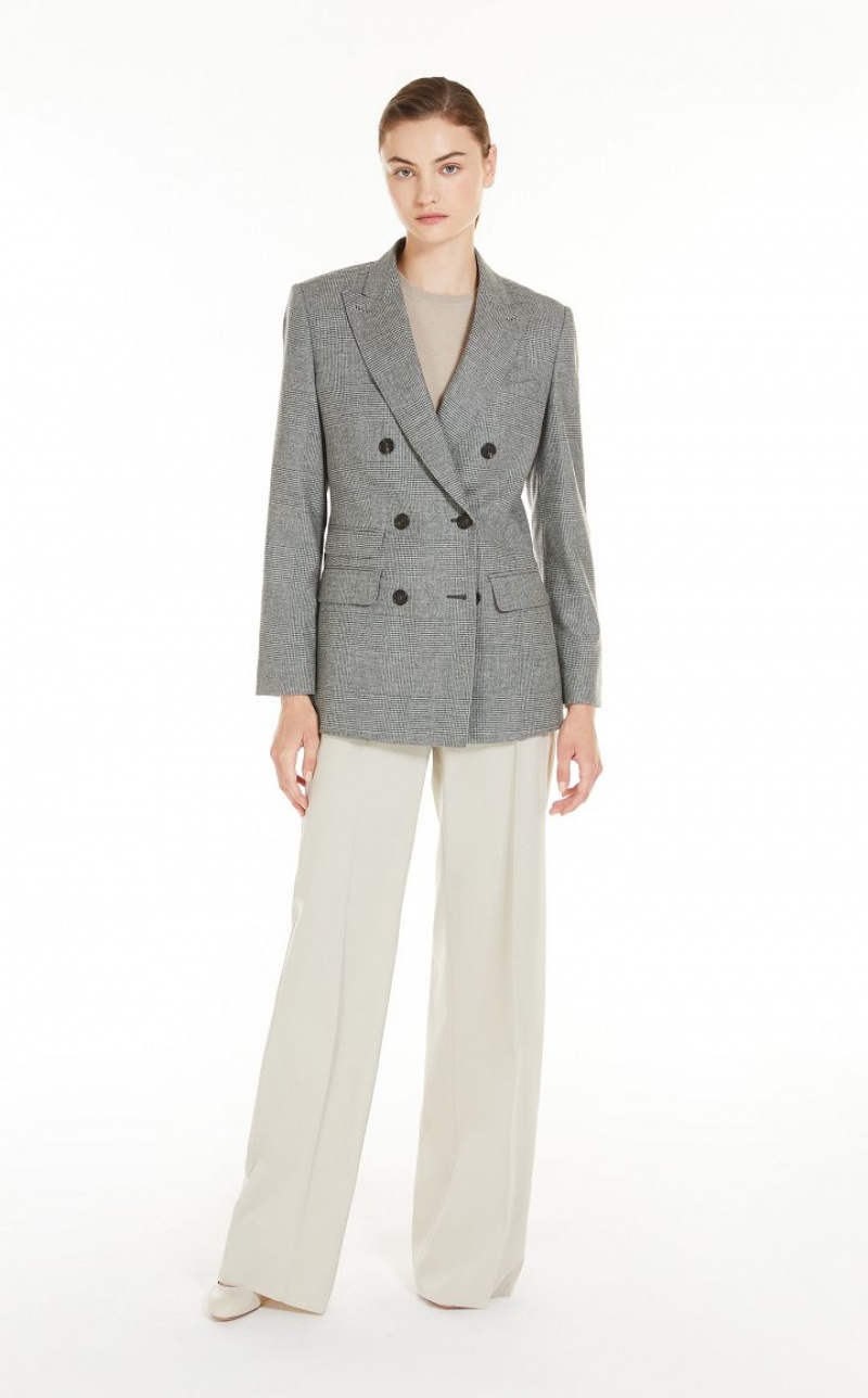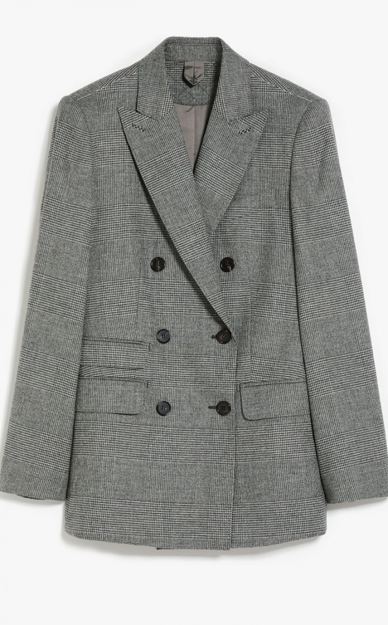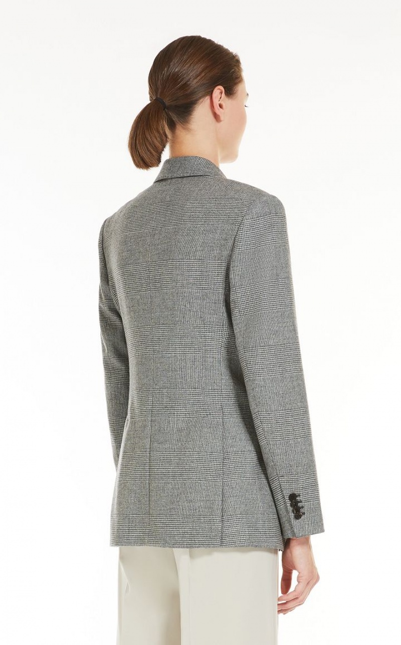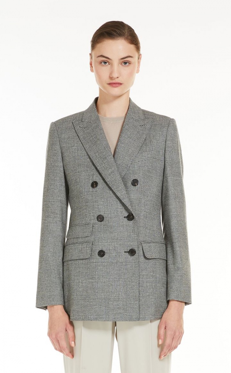 Double-breasted blazer in an exquisite wool and cashmere blend, designed with British-style patterns. Light, soft-touch Saxony fabric, enriched with a light elastic fibre that ensures absolute comfort and crease resistance performance. The full canvas construction has a peak lapel collar, a masculine breast pocket, three flap pockets on the front and vents on the back. Garment is lined in matching-tone twill. Horn buttons. Length: 70 cm.