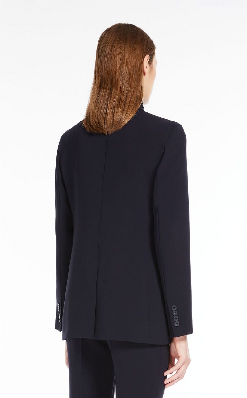 Slim-fit single-breasted blazer in technical cady fabric featuring a lapel collar, long sleeves and flap pockets. Lined model. Button fastening. Length: 70 cm.
