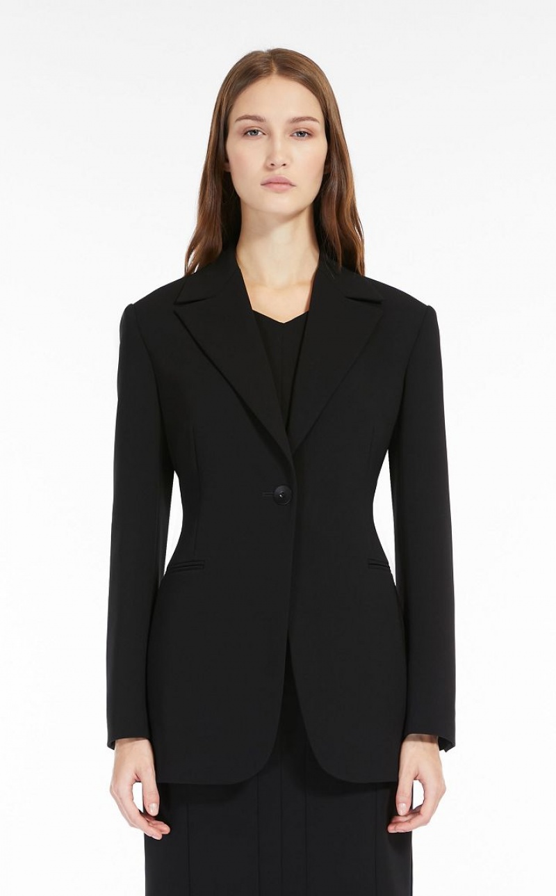 Slim-fit single-breasted long blazer in technical cady fabric featuring a lapel collar and welt pockets. Lined model. Single-breasted one-button fastening. Length: 74 cm.