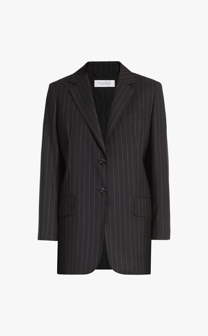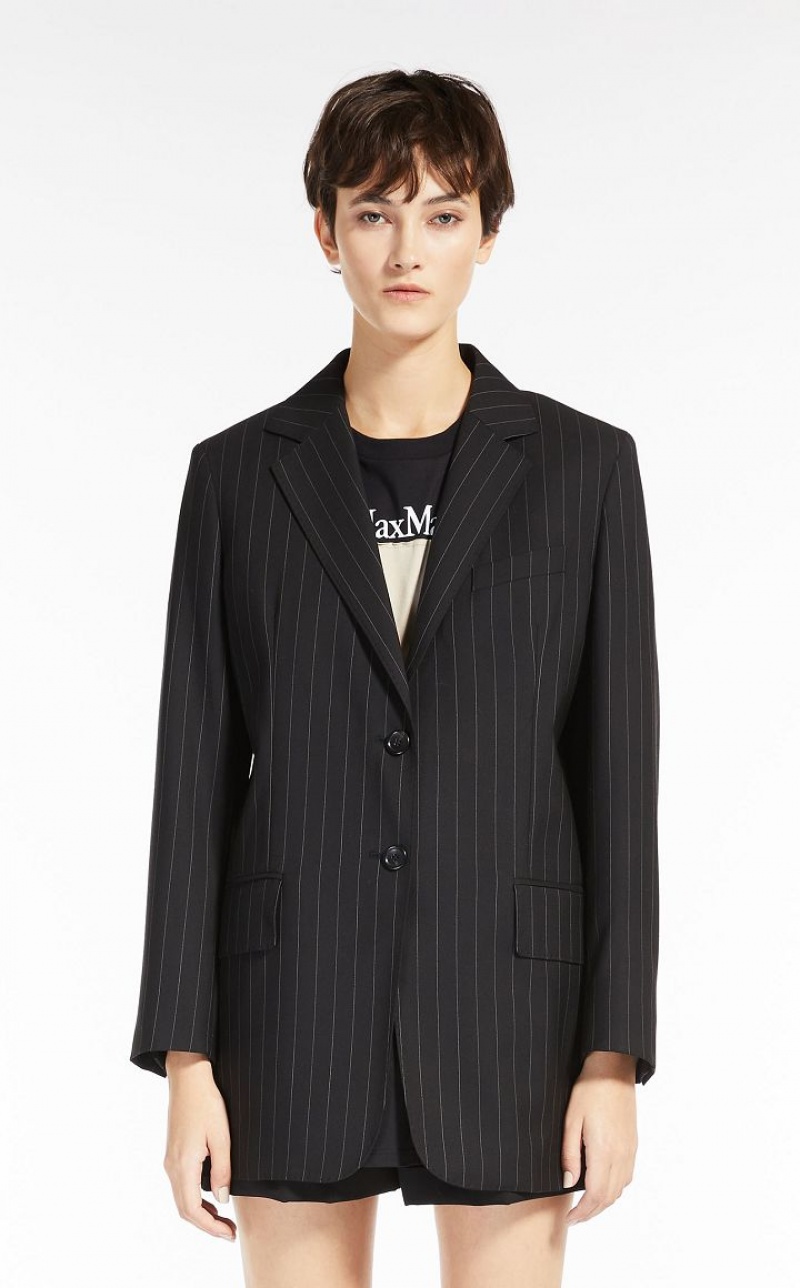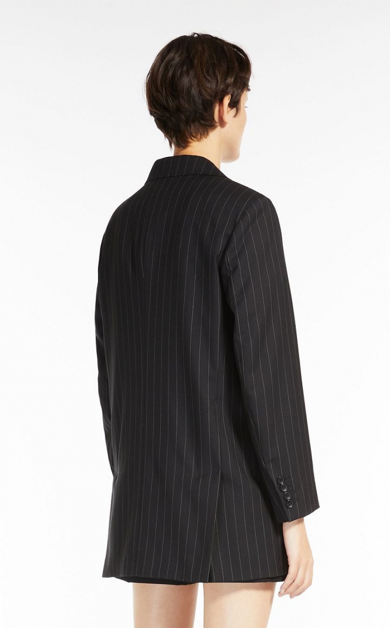 Sartorial-inspired single-breasted blazer made of lightweight pinstriped pure wool cloth. With a slightly oversized straight silhouette, it features a small lapel collar in melton, a masculine breast pocket and welt pockets with flap on the front. Lined model in stretch monogram fabric, finished with a sartorial pick stitch and double vents on the back. Two-button closure. Length: 78 cm.