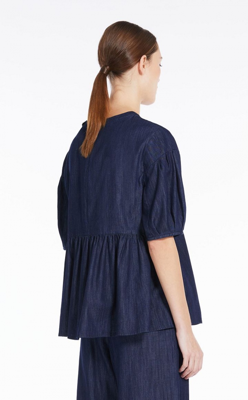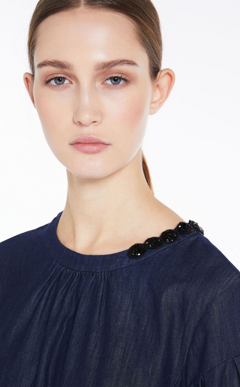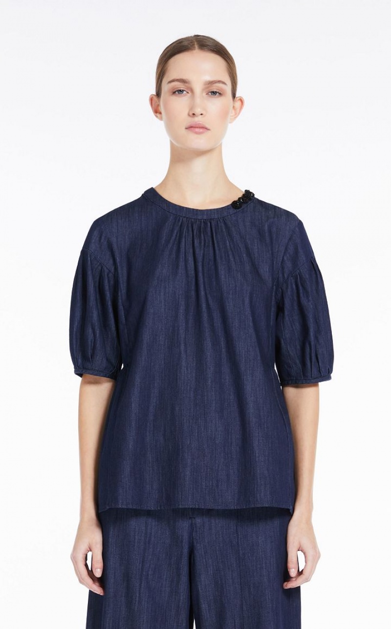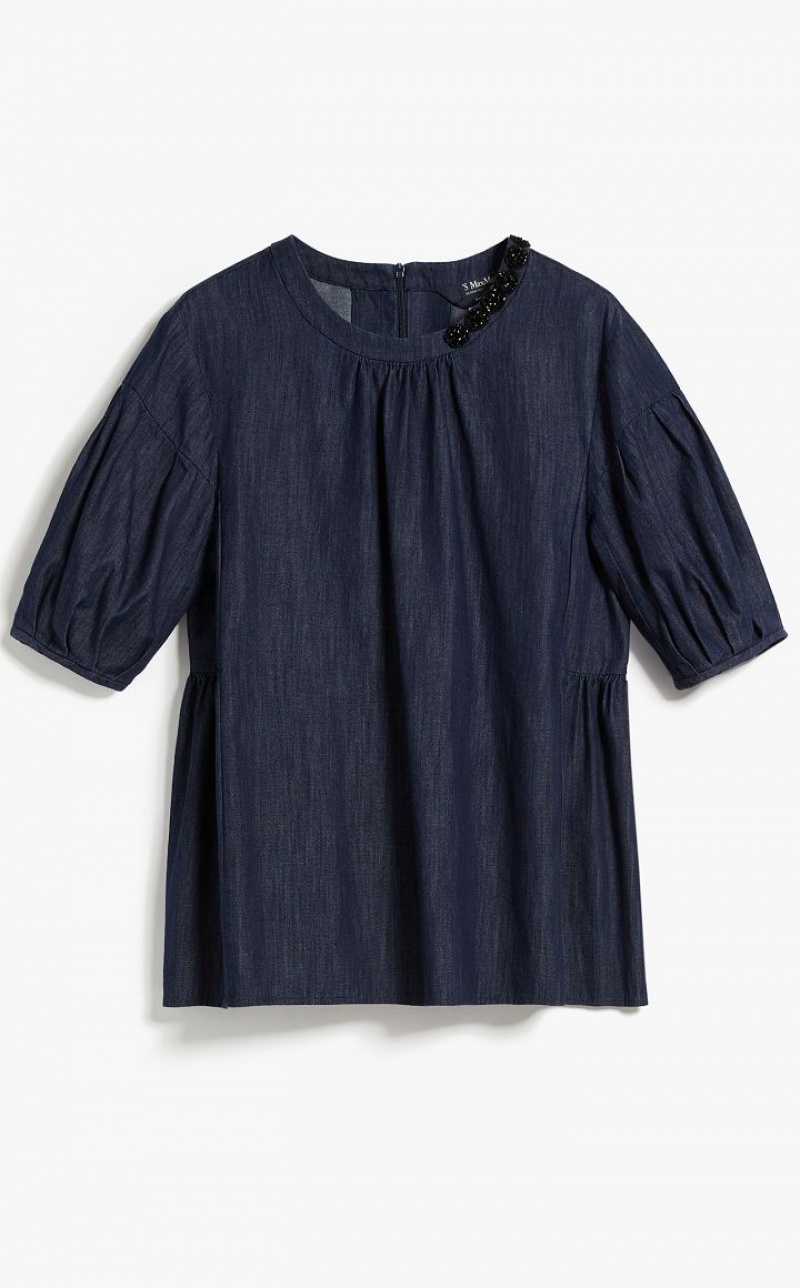 Crew-neck T-shirt in lightweight pure cotton denim fabric featuring short puff sleeves. Both the small gather at the neck and horizontal rear dart give rise to a slightly fitted silhouette. Removable jewel embroidery-embellished neckline. Length: 63 cm.