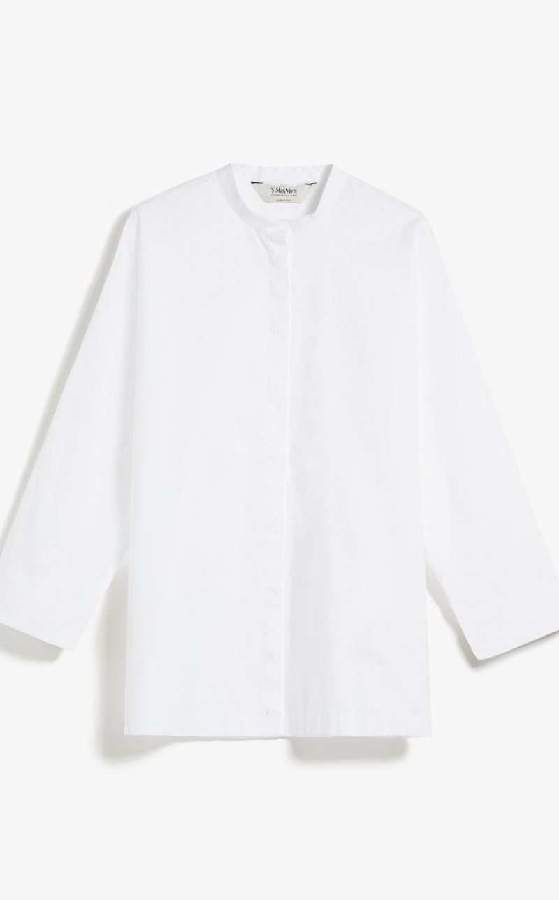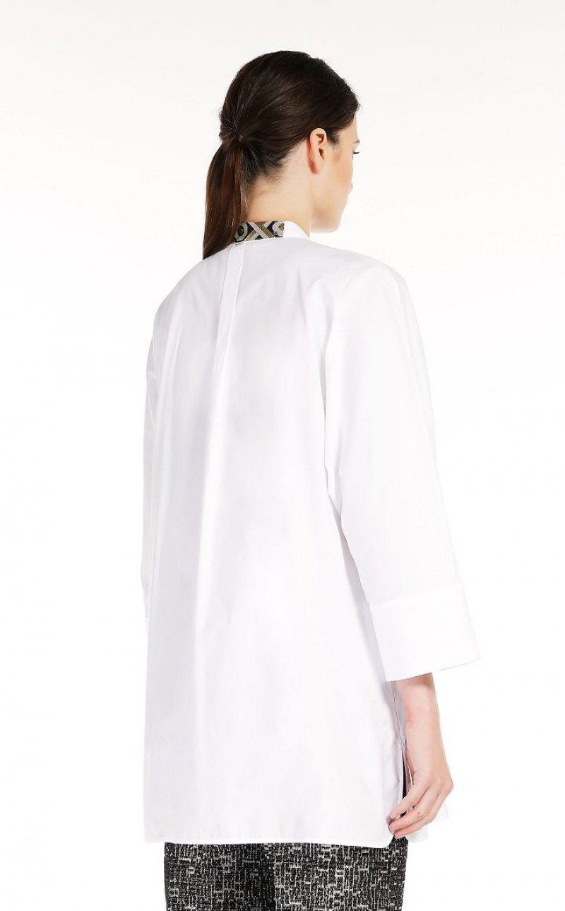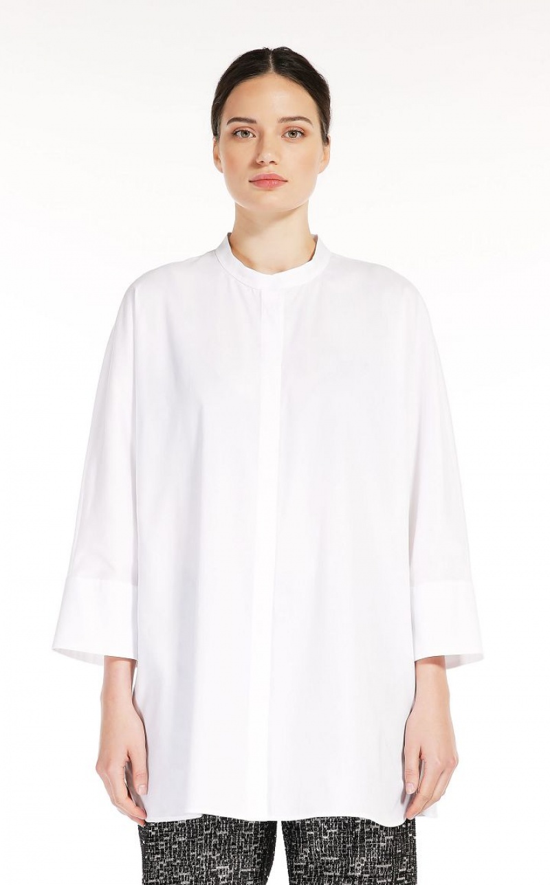 Kimono-sleeve shirt in fine pure cotton Oxford cloth featuring a Mandarin collar and small inlaid jacquard detail, centrally positioned at the back of the neck. The comfort-fit model boasts side slits and an asymmetrical, slightly high-low hem design. Length: 79 cm.